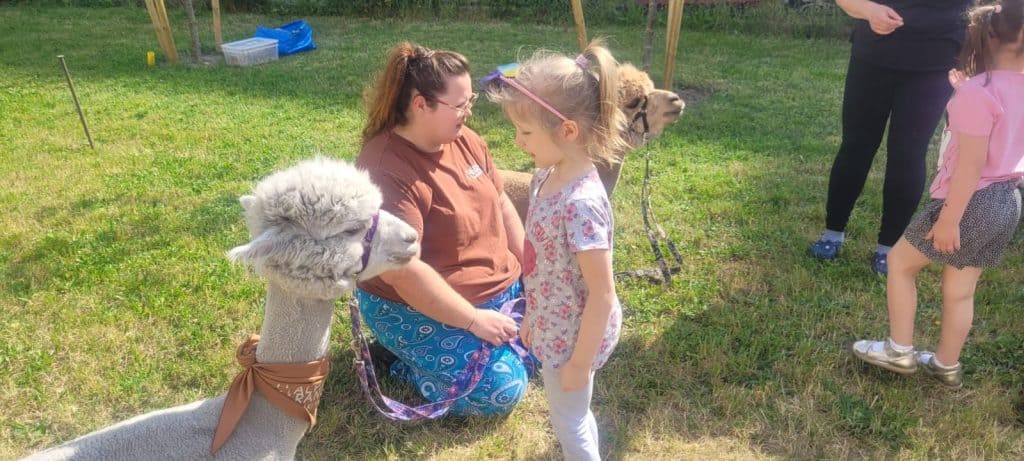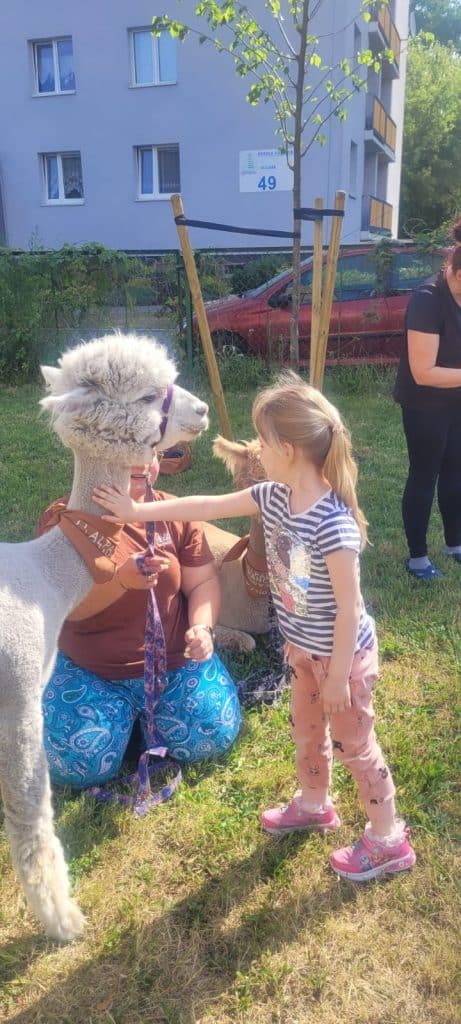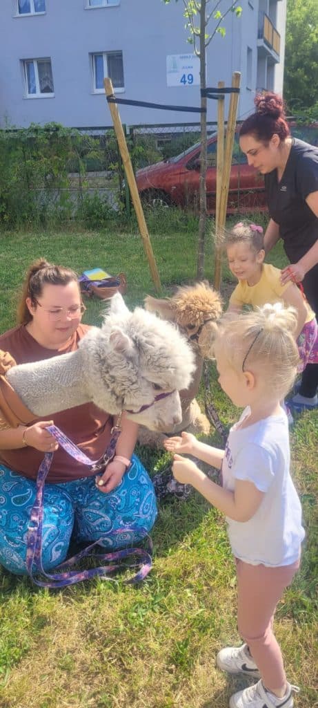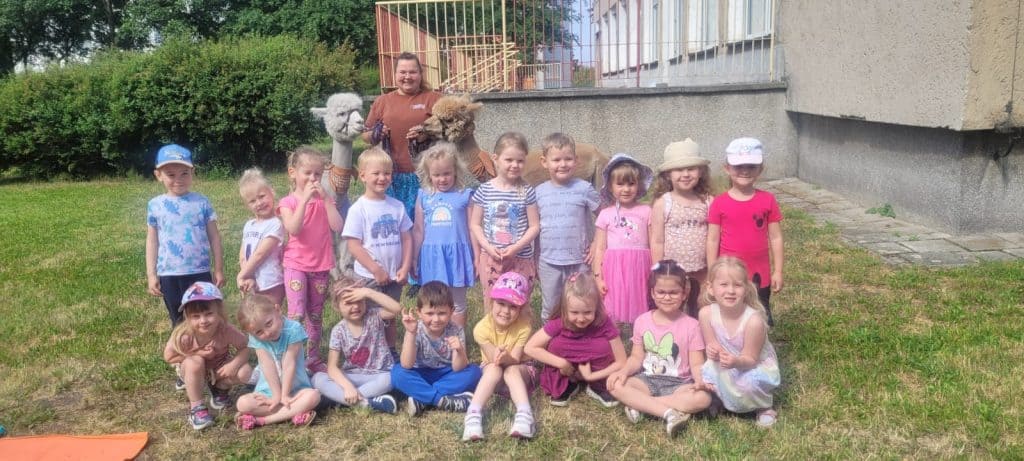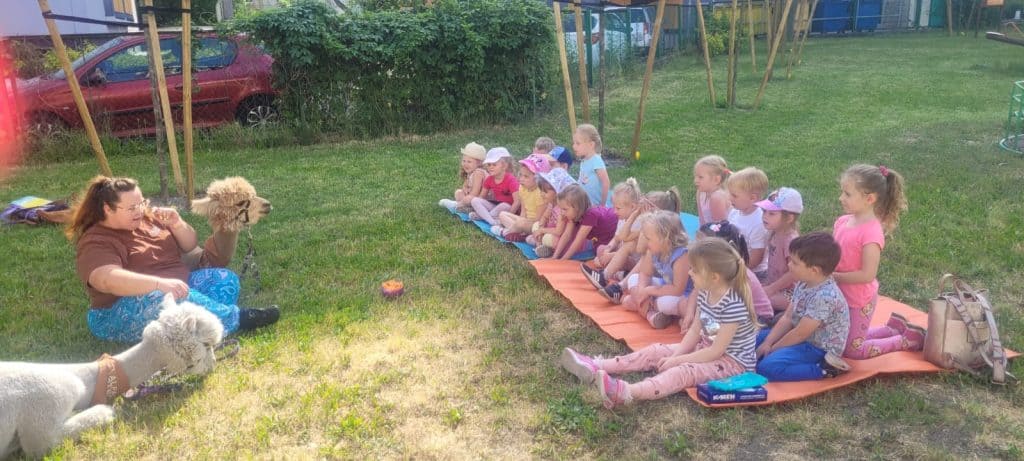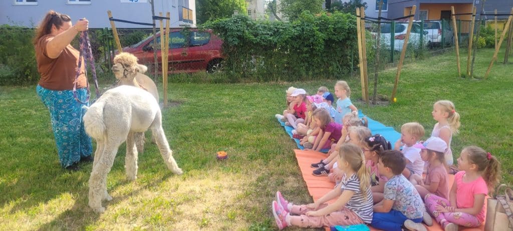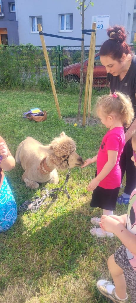 Dodatkową atrakcją, jaką nasze dzieci miały zorganizowaną w ostatnim czasie było spotkanie z Alpakami. Na przedszkolnym placu zabaw odbyło się spotkanie ze zwierzętami oraz ich opiekunem. Dzieci miały okazję nie tyko zobaczyć, jak wyglądają Alpaki i dowiedzieć się ciekawostek na ich temat, ale także mogły je pogłaskać i nakarmić. Wszystkim Biedronkom spotkanie to bardzo się podobało.