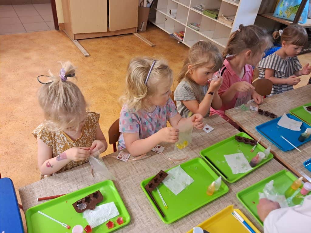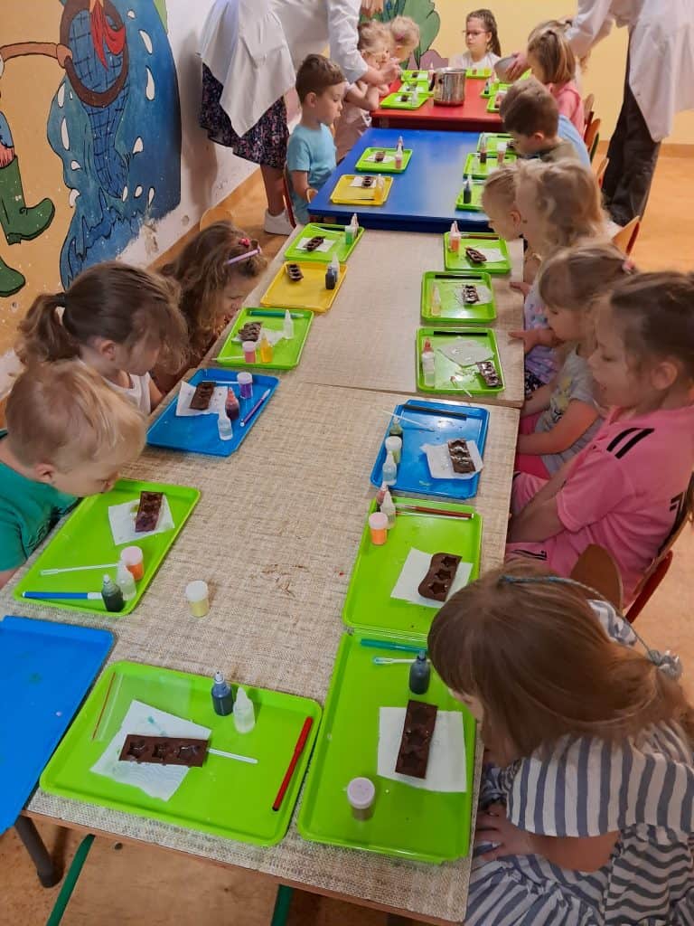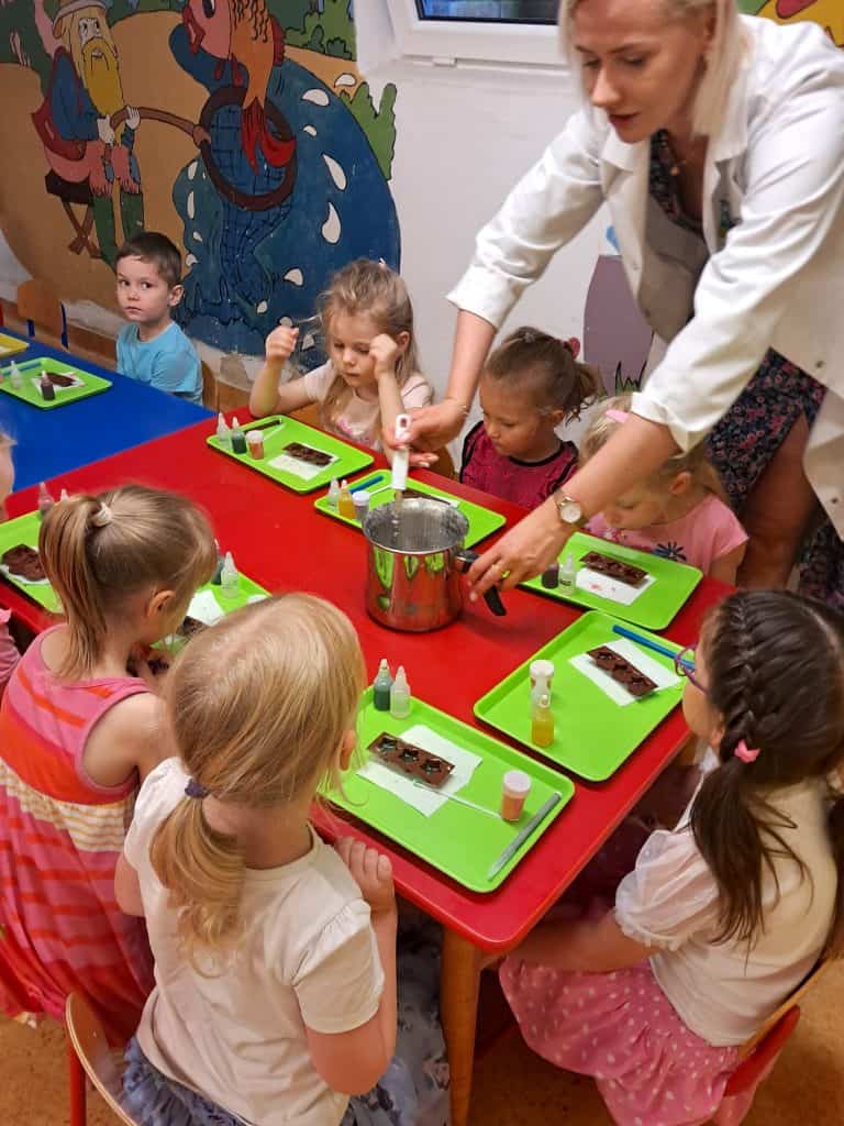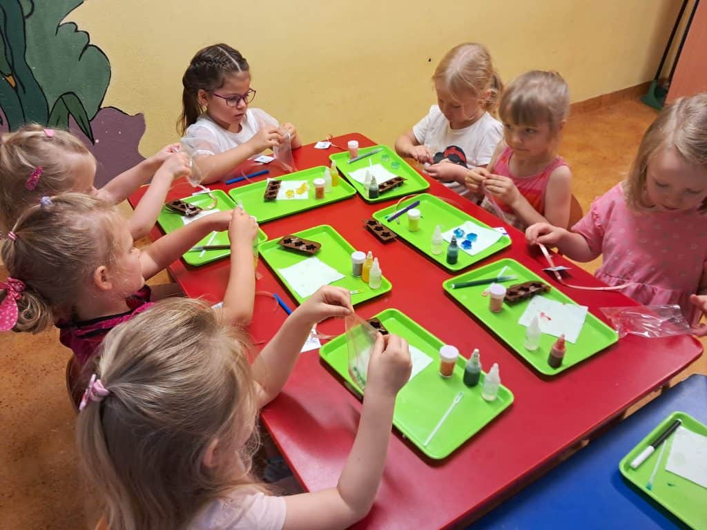 Podobnie jak w poprzednich miesiącach i w tym nasza grupa wzięła udział w zajęciach z „Krainy Eksperymentów”. Podczas zajęć dzieci wykonywały doświadczenia i mogły zabrać na pamiątkę kolorowe gwiazdki.