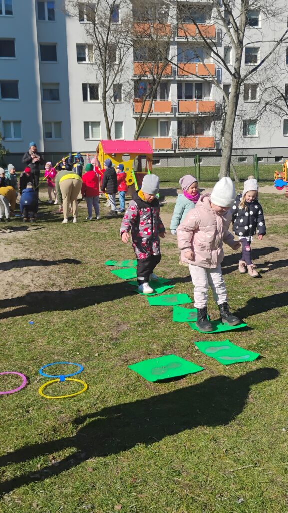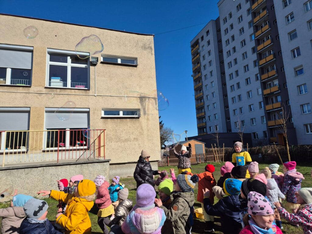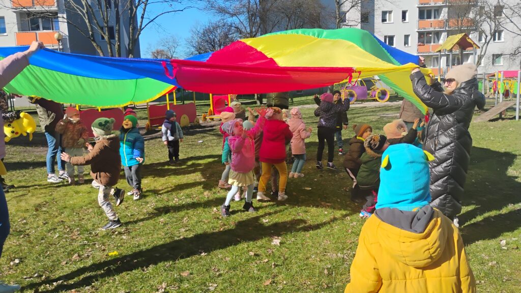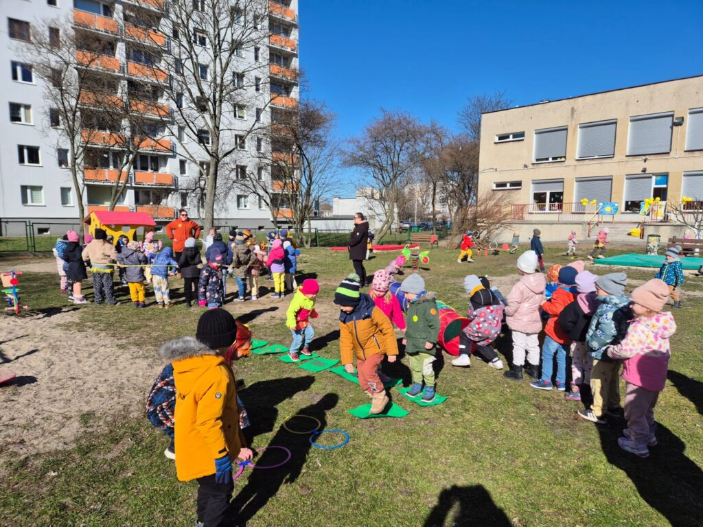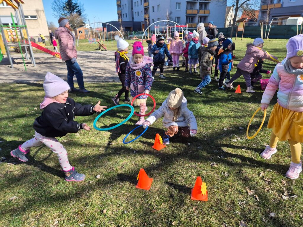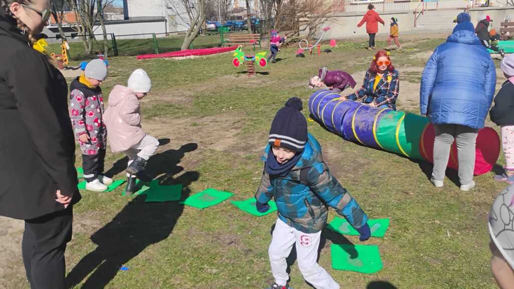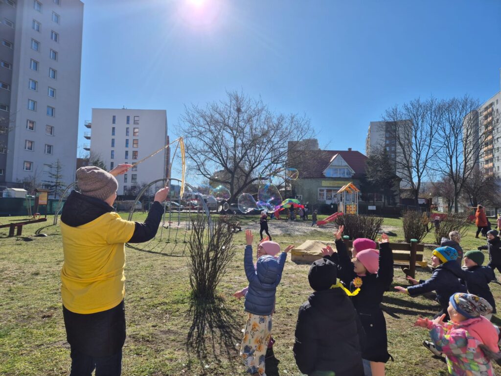 Zabawa rozpoczęła się od wspólnego tańca, a potem ruszyła lawina atrakcji! Rzut do celu? Mistrzowie celności nie zawiedli! Ścieżka sensoryczna? Stópki małych odkrywców śmigały po różnych fakturach. Zabawy z gumą i chustą animacyjną? Śmiechu było co niemiara! A wielkie bańki mydlane? No cóż… chyba nie było dziecka, które nie próbowało złapać jednej z tych tęczowych, migoczących kul. Po wielkiej zabawie na świeżym powietrzu przedszkolaki wróciły do swoich sal, gdzie czekało na nie mnóstwo słonecznych atrakcji – gry, zabawy i twórcze wyzwania.