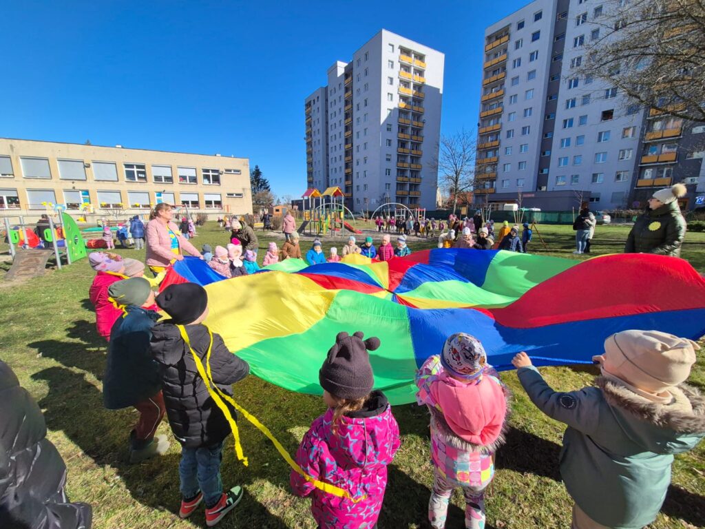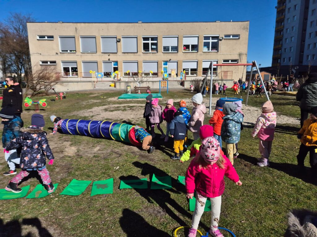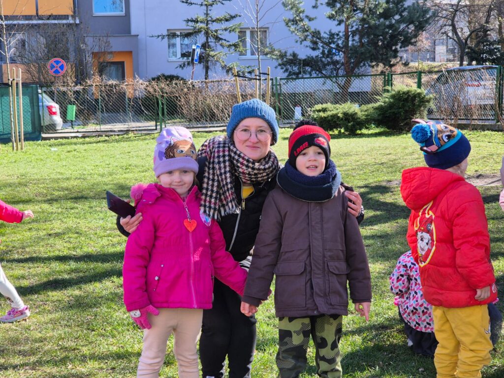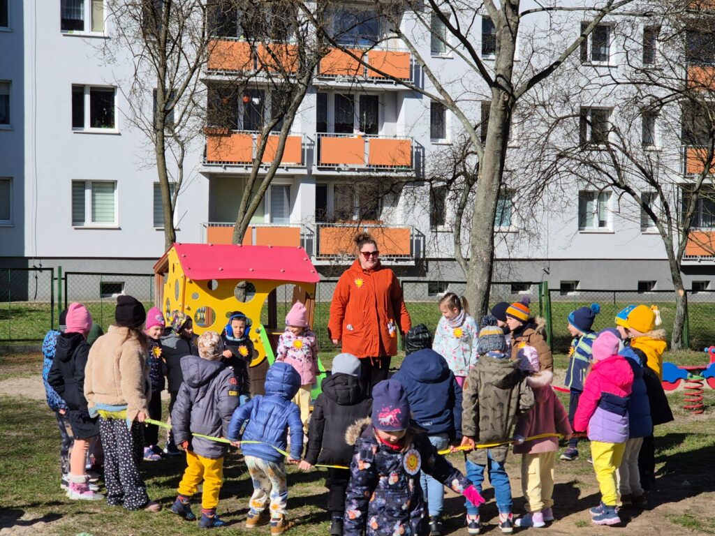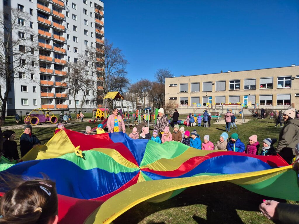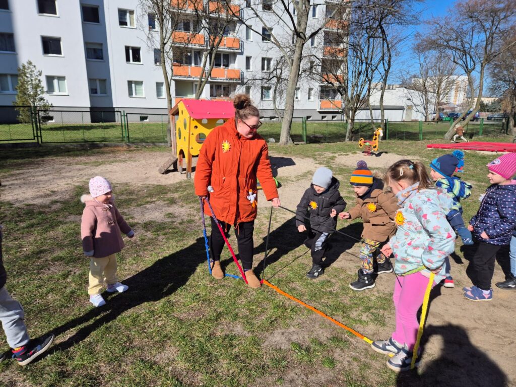 Zabawa rozpoczęła się od wspólnego tańca, a potem ruszyła lawina atrakcji! Rzut do celu? Mistrzowie celności nie zawiedli! Ścieżka sensoryczna? Stópki małych odkrywców śmigały po różnych fakturach. Zabawy z gumą i chustą animacyjną? Śmiechu było co niemiara! A wielkie bańki mydlane? No cóż… chyba nie było dziecka, które nie próbowało złapać jednej z tych tęczowych, migoczących kul. Po wielkiej zabawie na świeżym powietrzu przedszkolaki wróciły do swoich sal, gdzie czekało na nie mnóstwo słonecznych atrakcji – gry, zabawy i twórcze wyzwania.