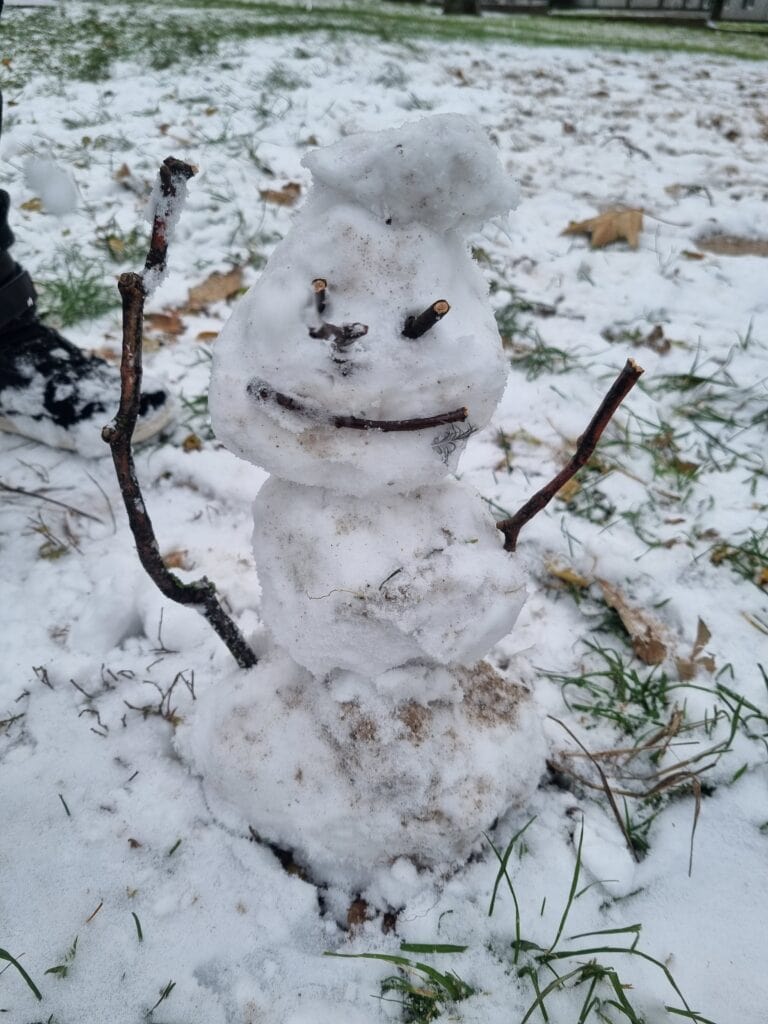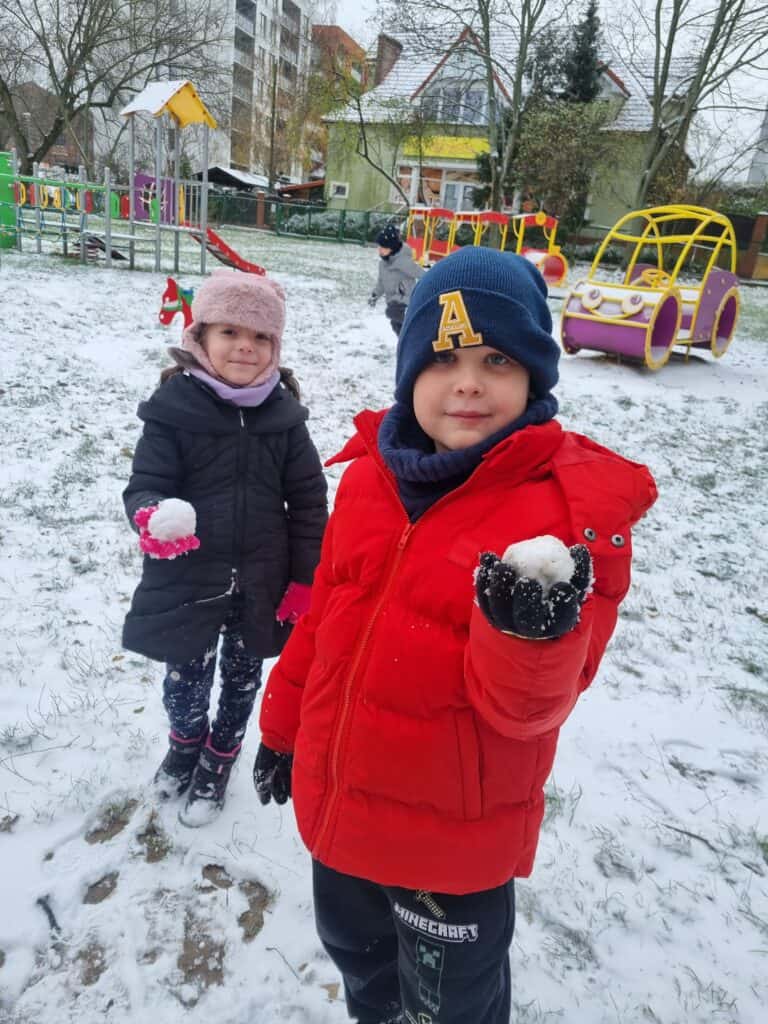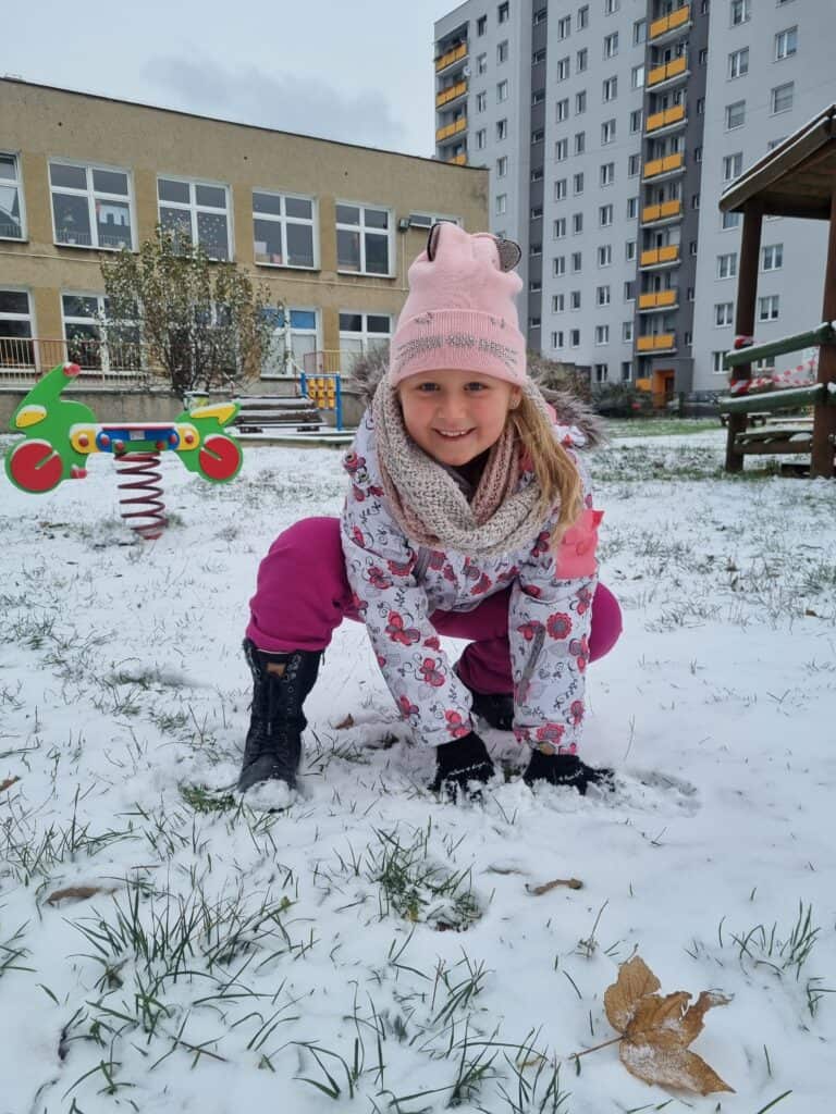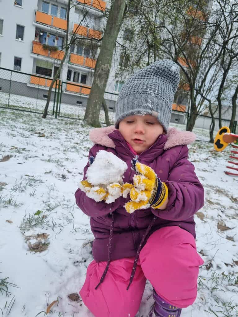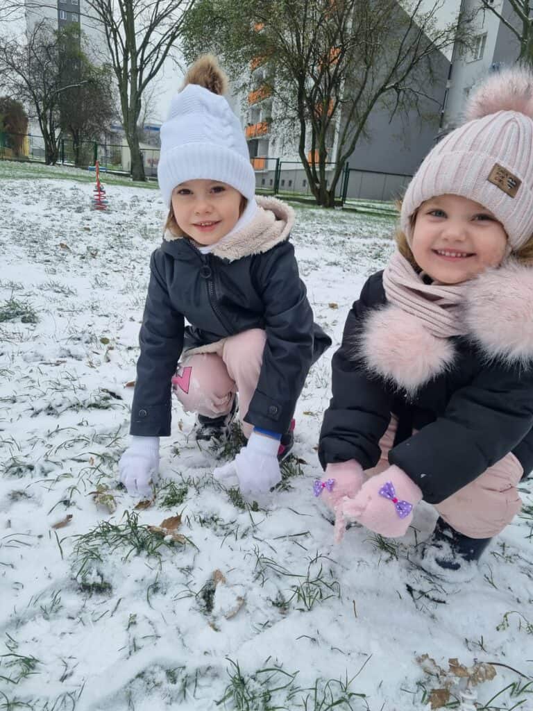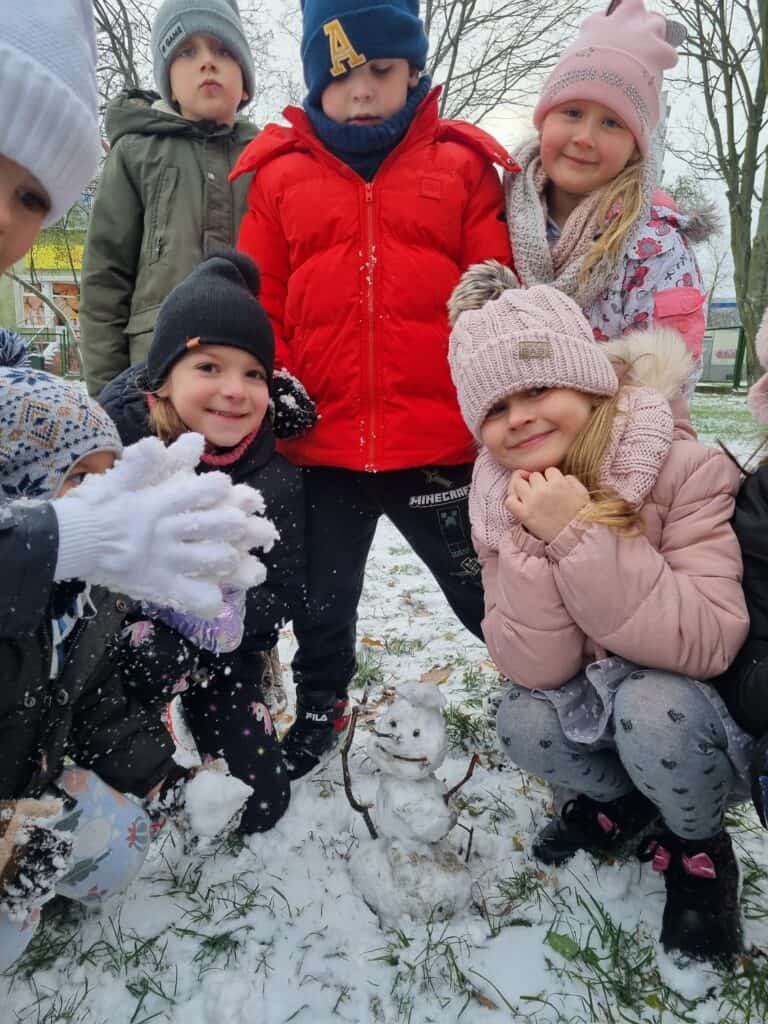 Pod koniec listopada przedszkolaki doczekały się pierwszego śniegu. Radość była ogromna! Udało nam się nawet ulepić pierwszego motylkowego bałwanka.