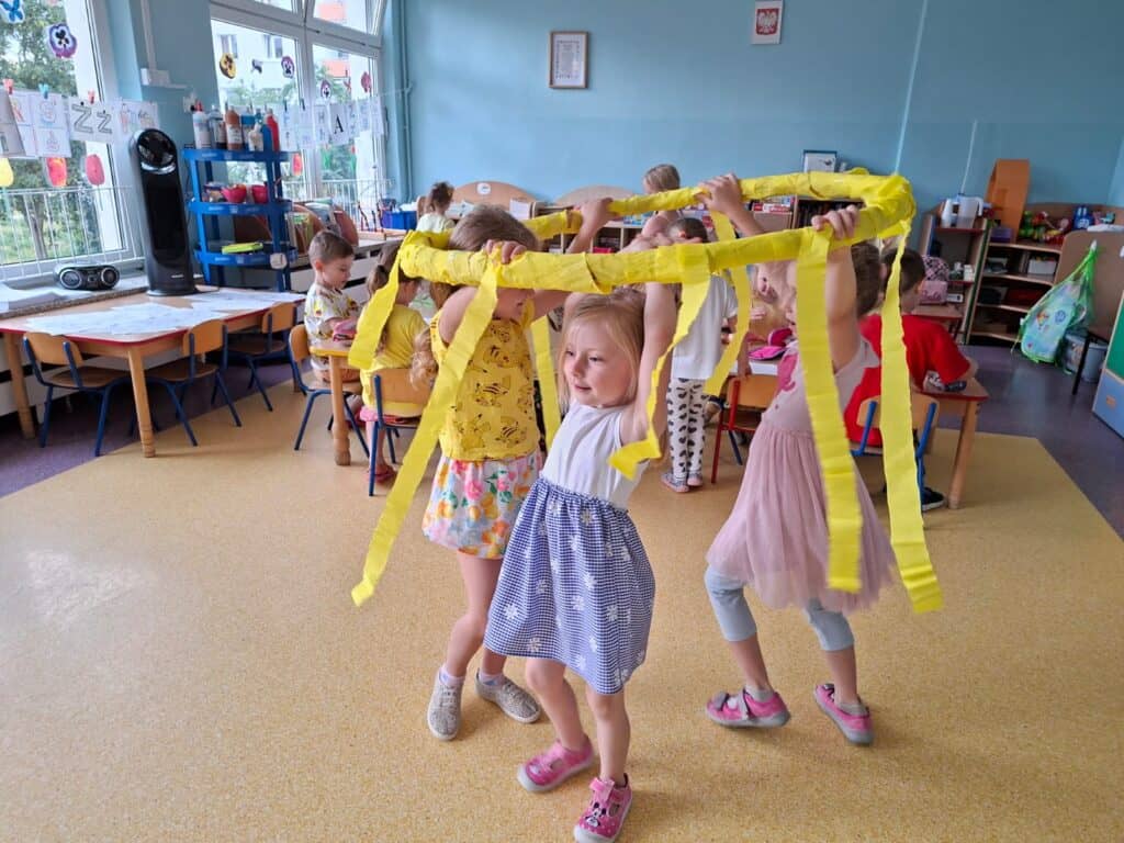 Kolorowa podróż tym razem była w kolorze żółtym, a jej hasło to: „Powitanie lata”. Były ćwiczenia gimnastyczne, tańce przy słonecznym hula hopie i kolorowanie obrazków.