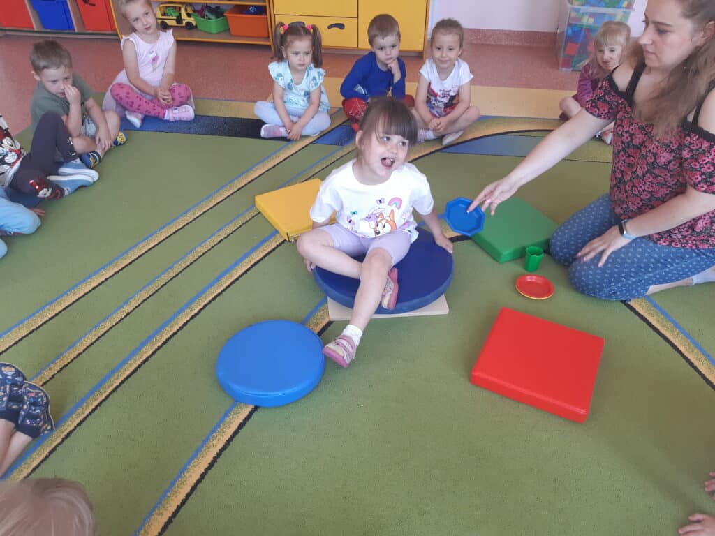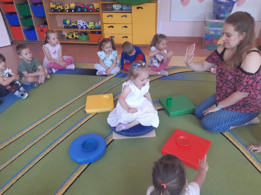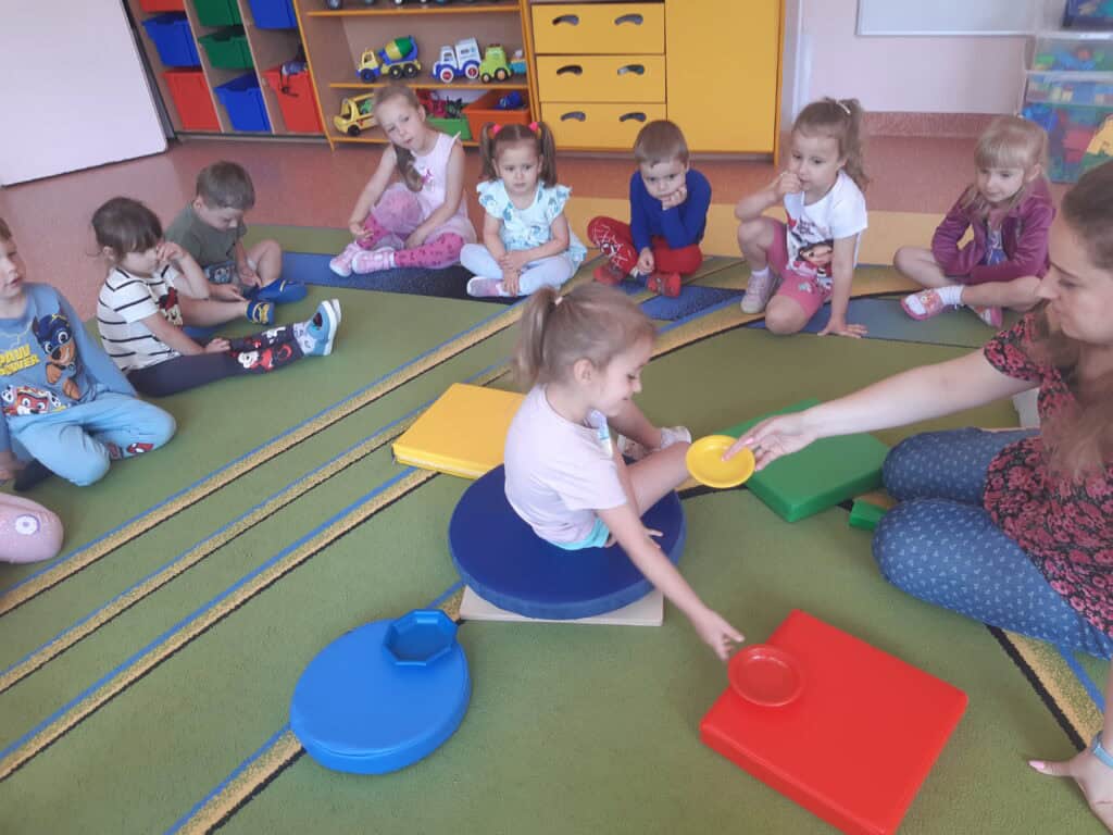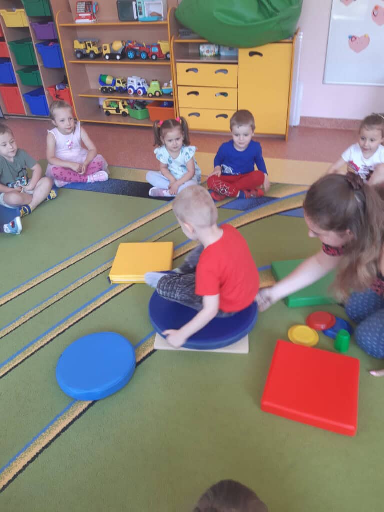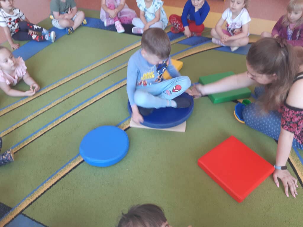 Pewnego czerwcowego poranka zawitała do nas Pani Psycholog. Pod jedną pachą trzymała deskę rotacyjną, a pod drugą wielkie kolorowe puzzle. Podczas świetnej zabawy na „karuzeli” rozwijaliśmy obustronną koordynację ruchową, kształtowaliśmy mechanizmy planowania motorycznego, schemat ciała i przestrzeni, rozwijaliśmy koordynację wzrokowo-ruchową oraz utrwalaliśmy znajomość kolorów. Dziękujemy pani Joasiu za wspaniałą zabawę.