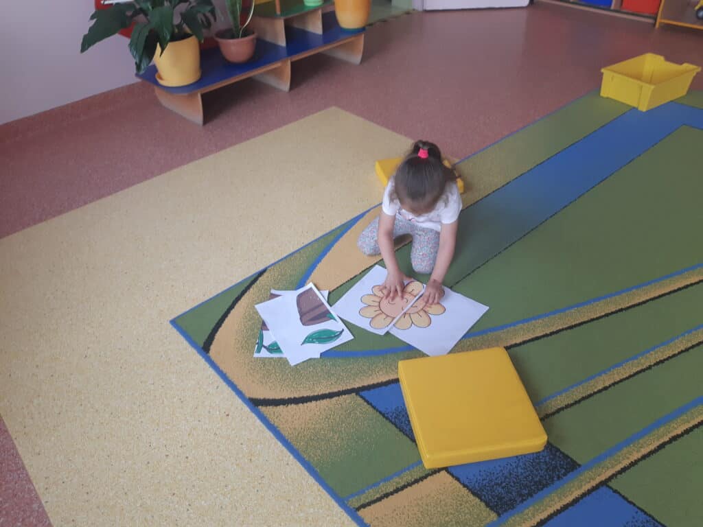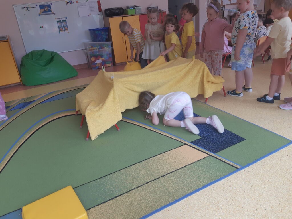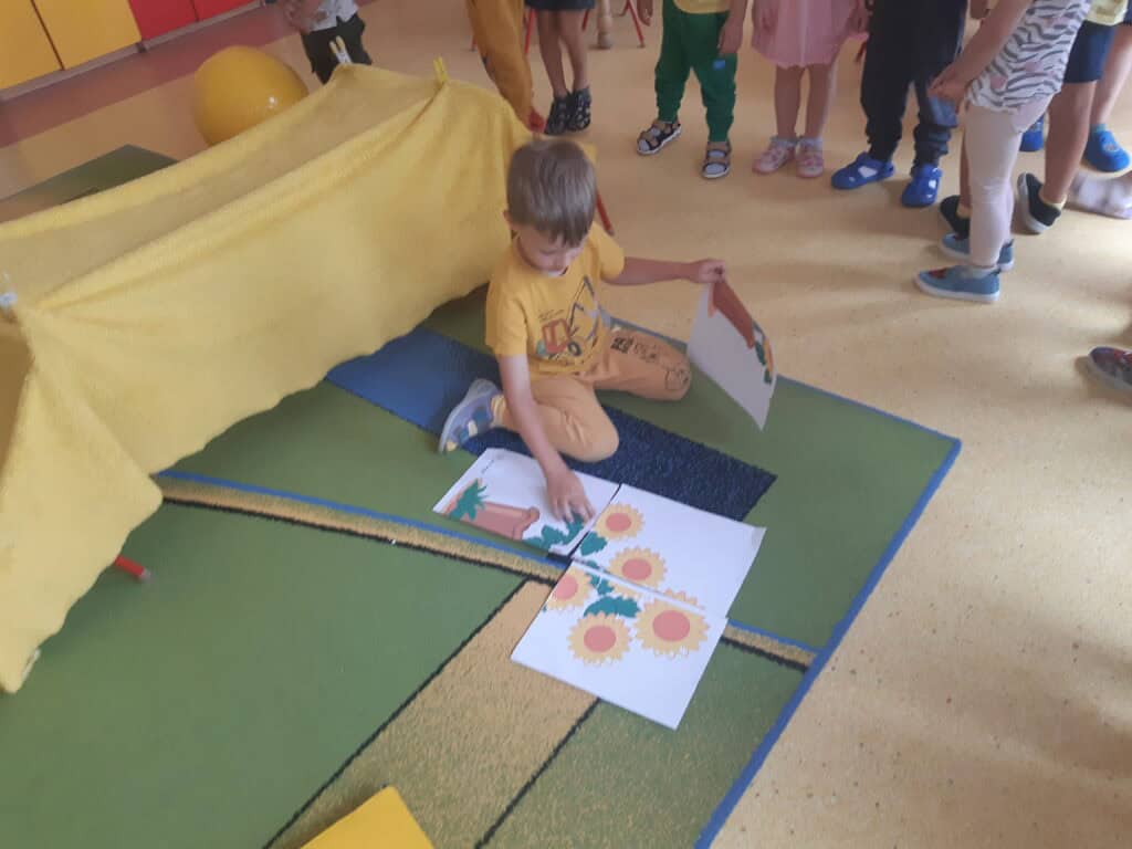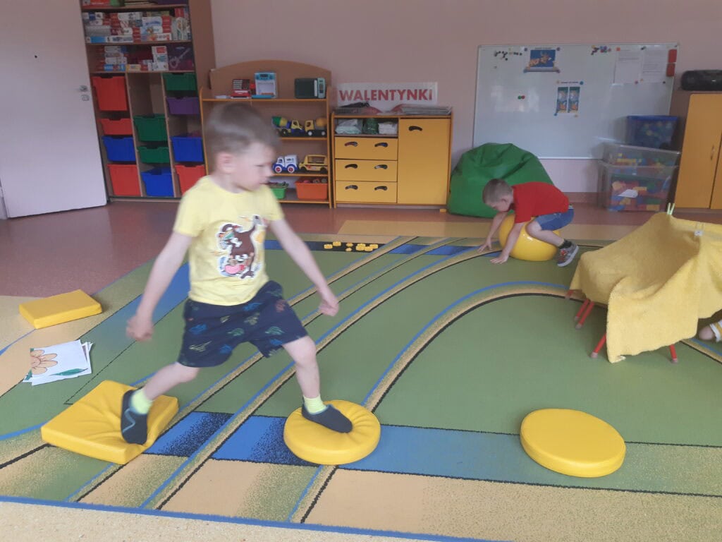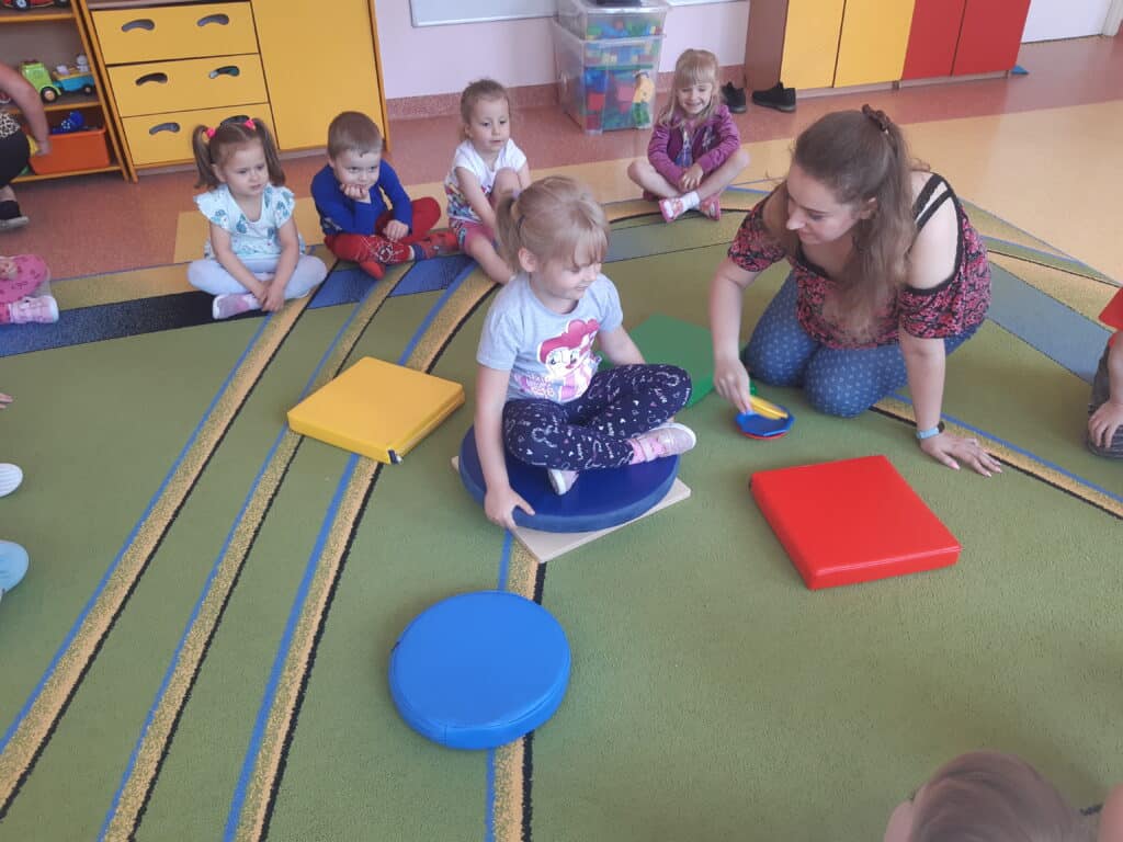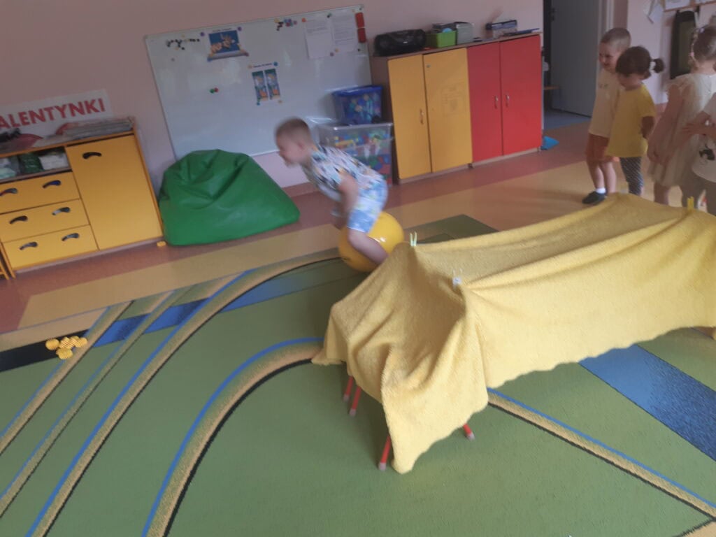 Pewnego czerwcowego poranka zawitała do nas Pani Psycholog. Pod jedną pachą trzymała deskę rotacyjną, a pod drugą wielkie kolorowe puzzle. Podczas świetnej zabawy na „karuzeli” rozwijaliśmy obustronną koordynację ruchową, kształtowaliśmy mechanizmy planowania motorycznego, schemat ciała i przestrzeni, rozwijaliśmy koordynację wzrokowo-ruchową oraz utrwalaliśmy znajomość kolorów. Dziękujemy pani Joasiu za wspaniałą zabawę.