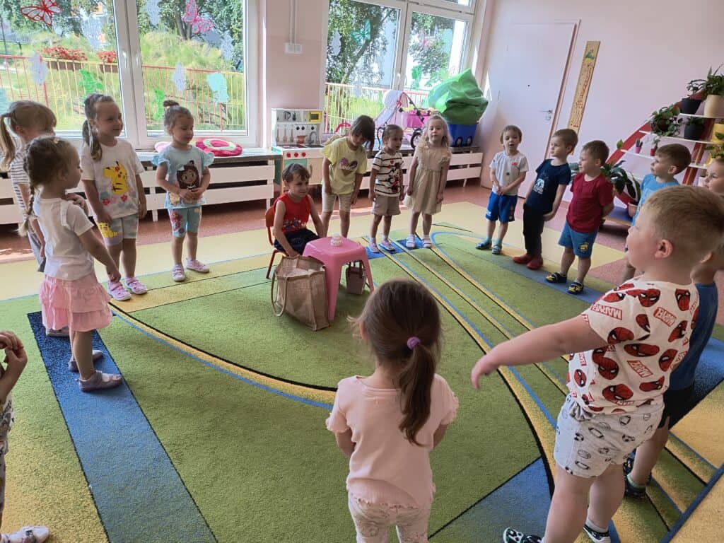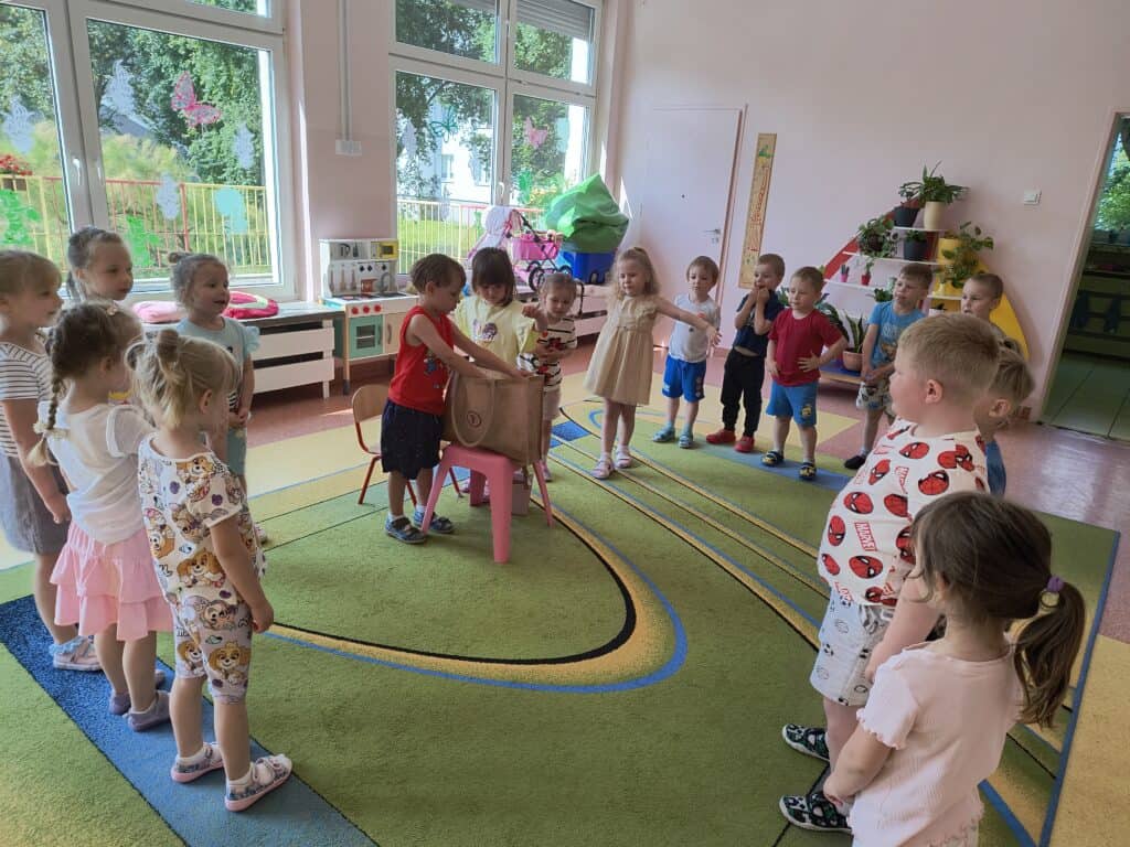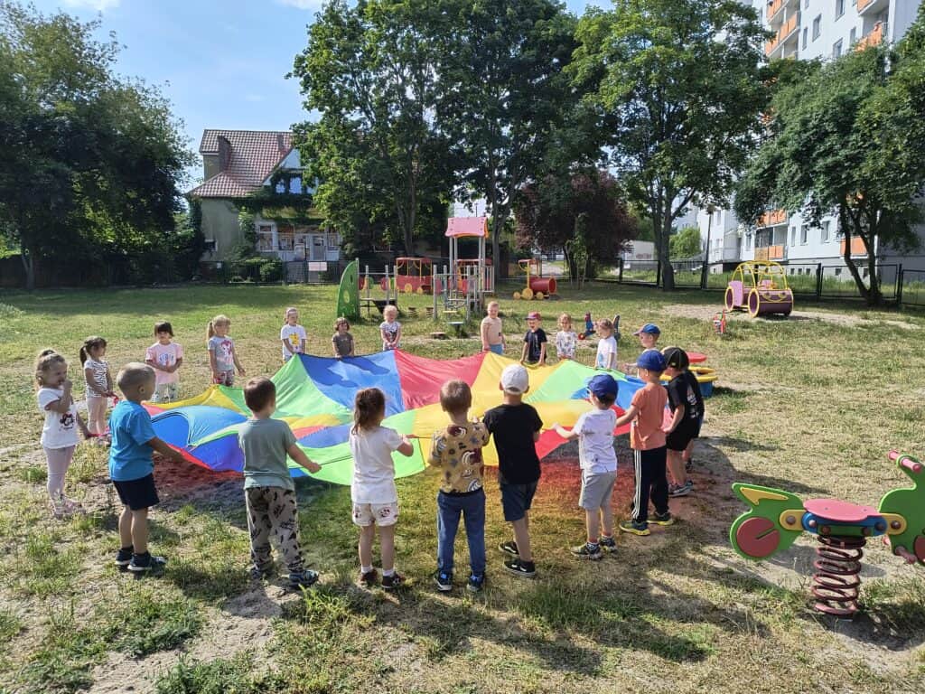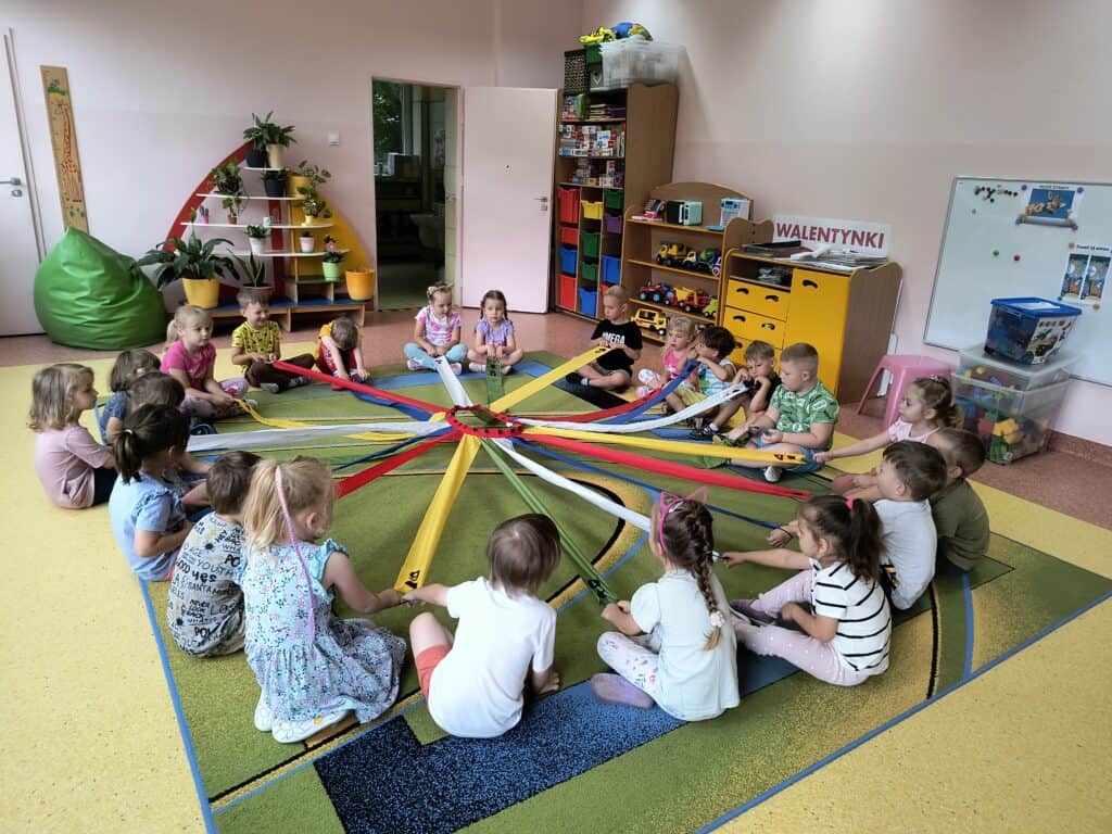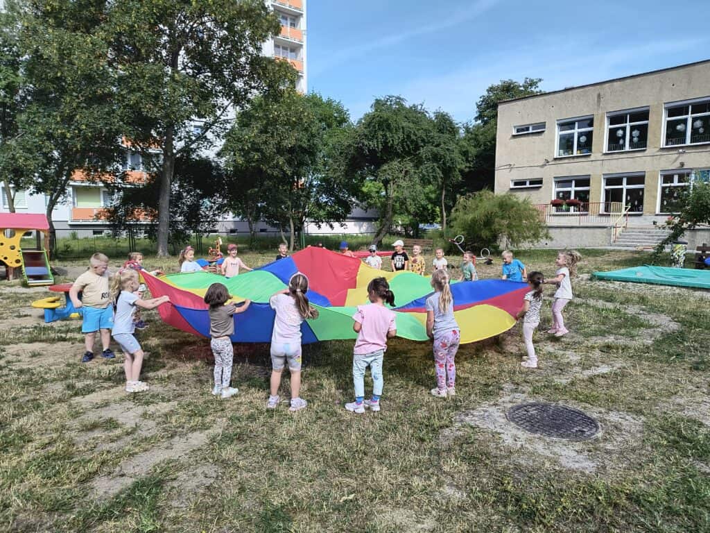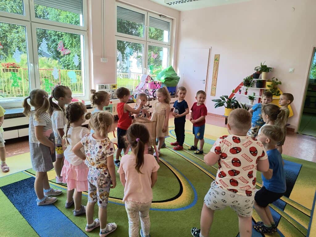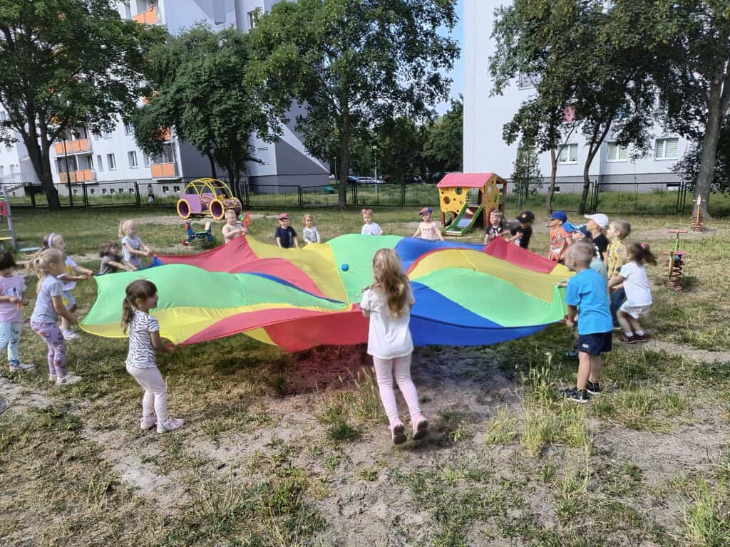 Przedszkolaki powitały swoją ukochaną porę roku – lato. Śpiewały piosenki, uczestniczyły w różnych zabawach i grach. Część dnia dzieci spędziły na zewnątrz: spacerowały, bawiły się chustą animacyjną, puszczały latawca na przedszkolnym placu zabaw. Dzieci wykonały także piękne prace plastyczne, aby przyozdobić nimi przedszkolną salę.