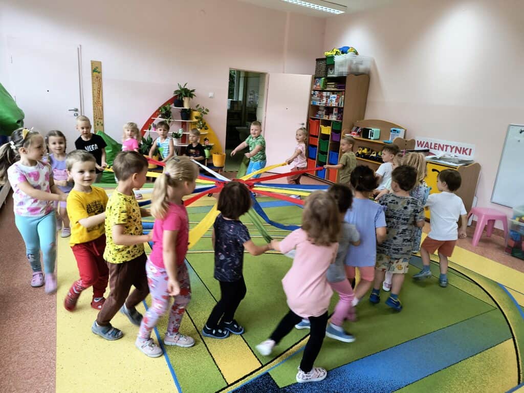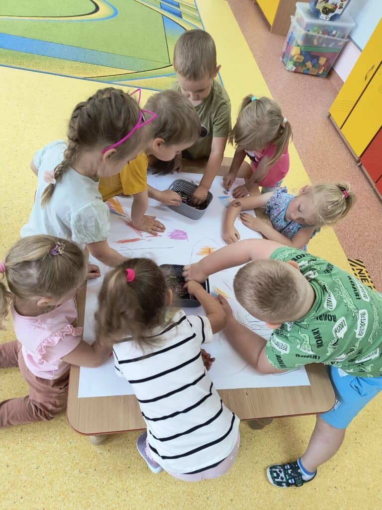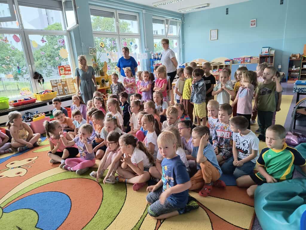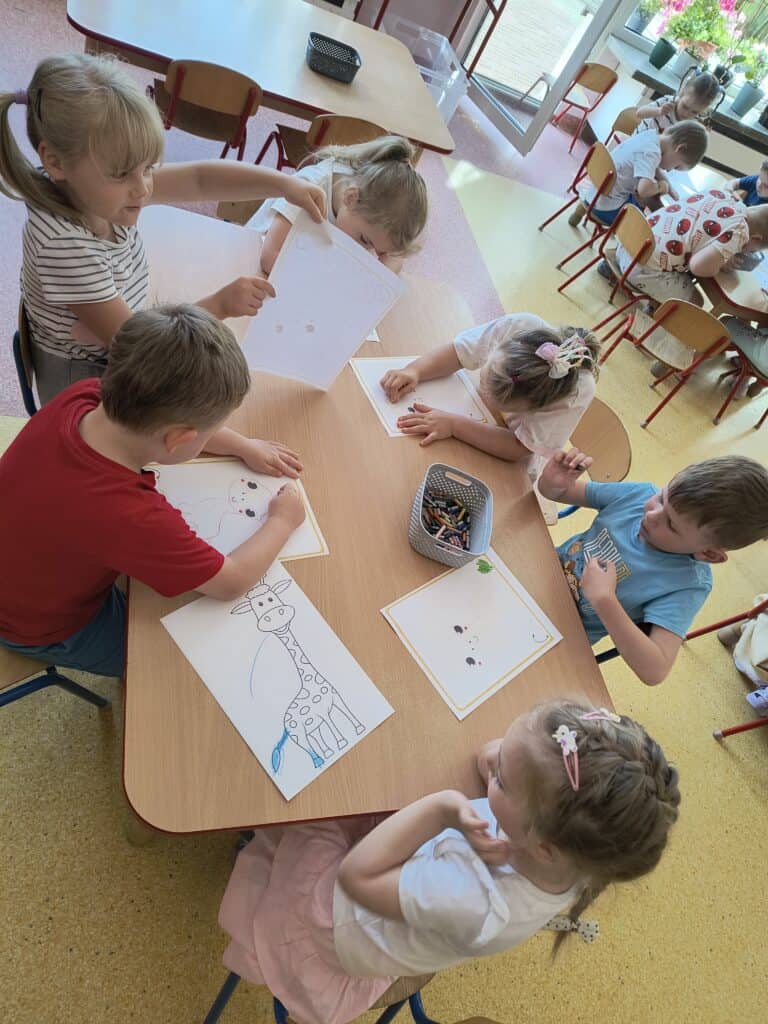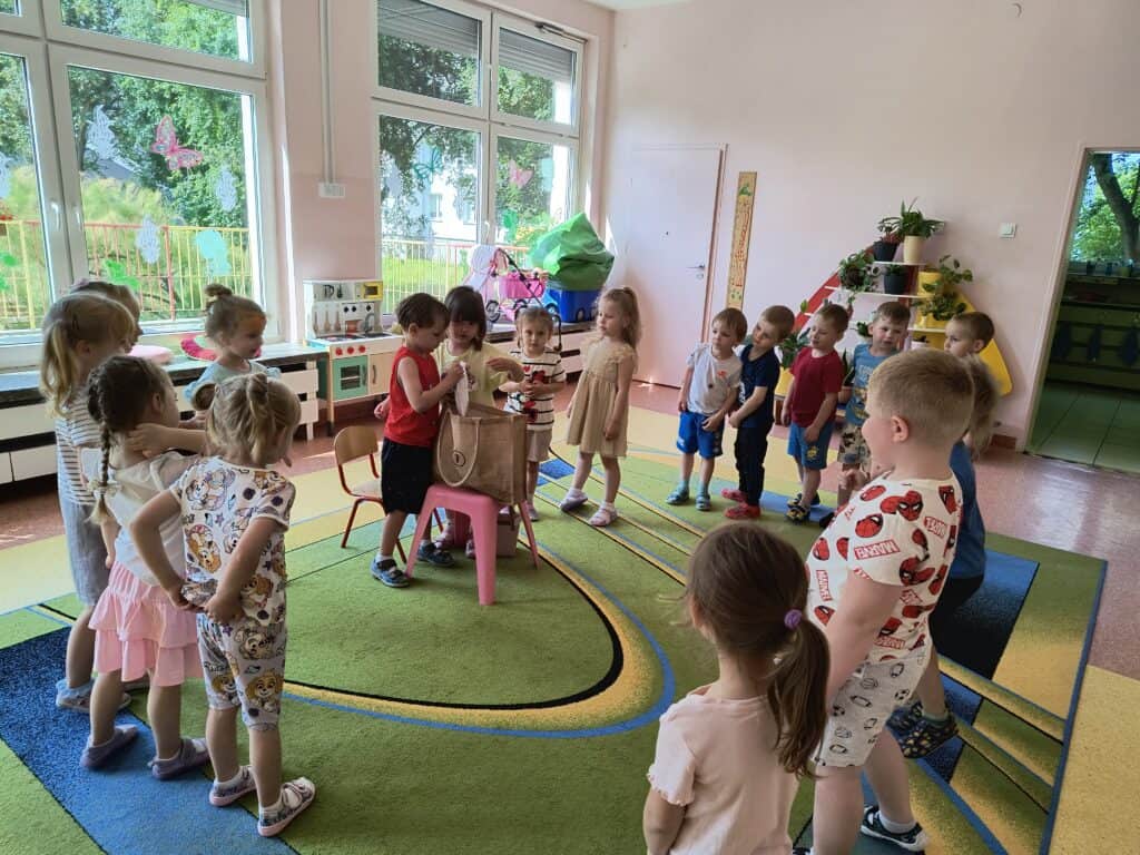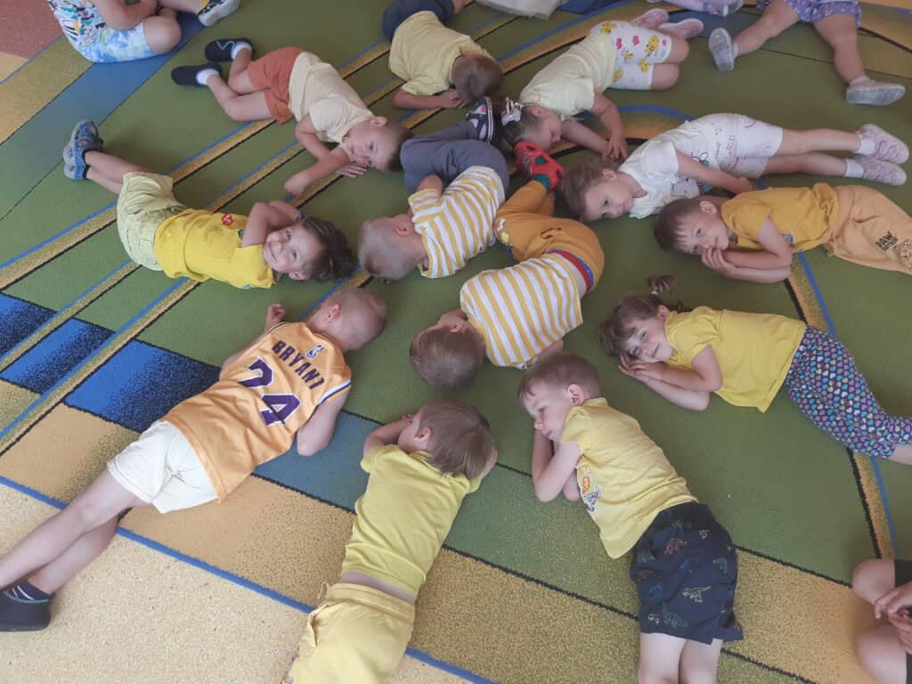 Przedszkolaki powitały swoją ukochaną porę roku – lato. Śpiewały piosenki, uczestniczyły w różnych zabawach i grach. Część dnia dzieci spędziły na zewnątrz: spacerowały, bawiły się chustą animacyjną, puszczały latawca na przedszkolnym placu zabaw. Dzieci wykonały także piękne prace plastyczne, aby przyozdobić nimi przedszkolną salę.