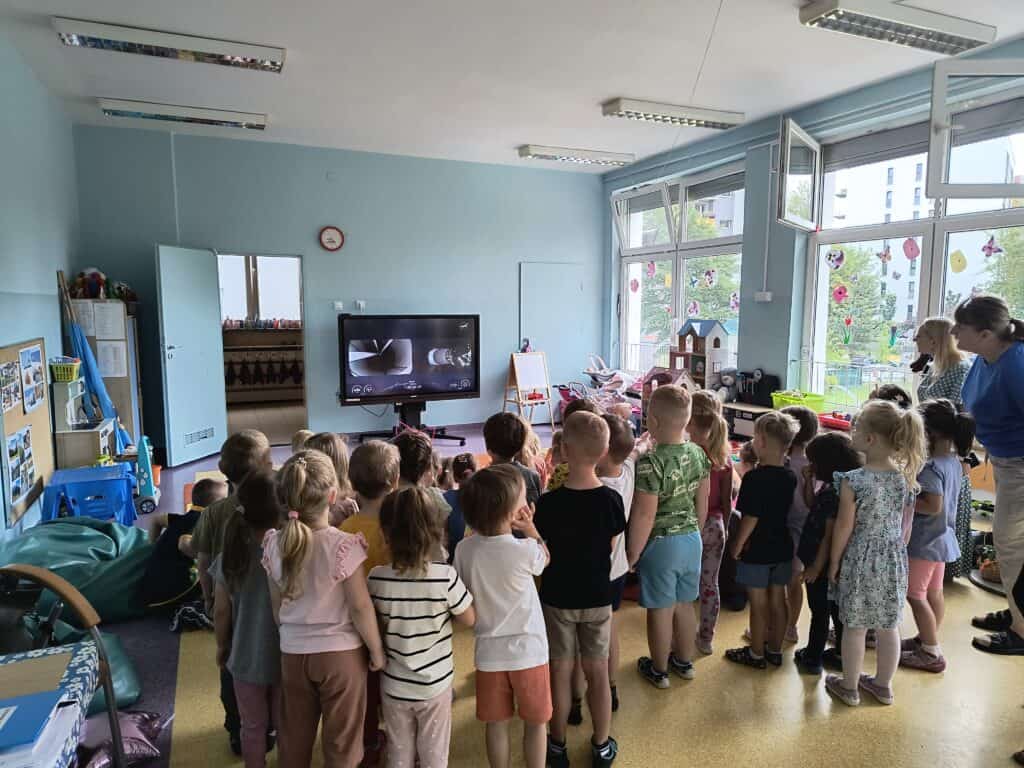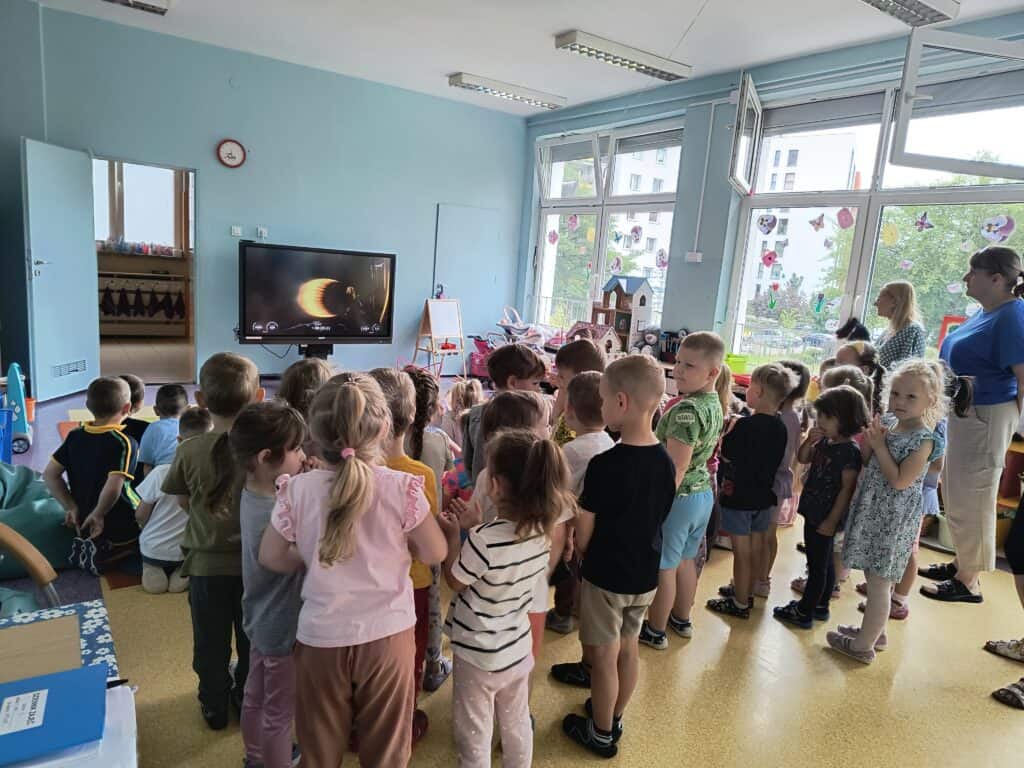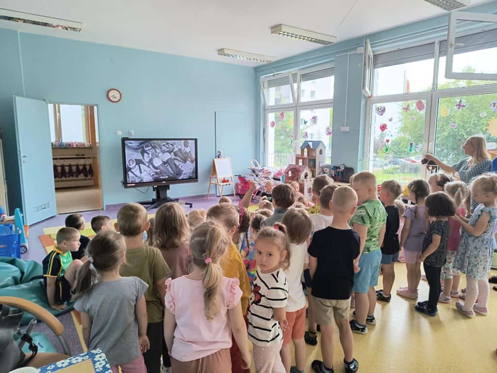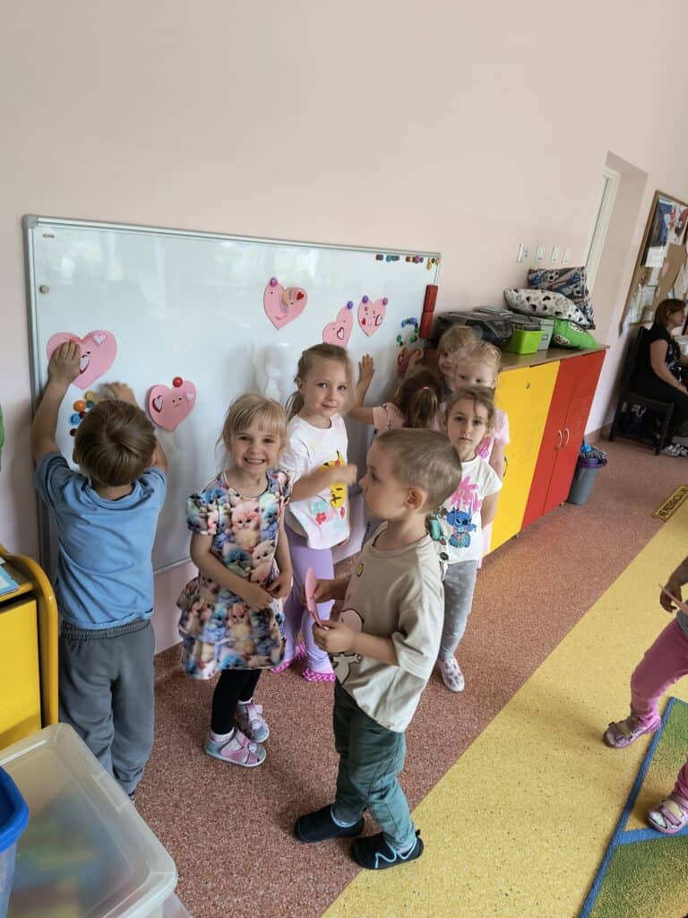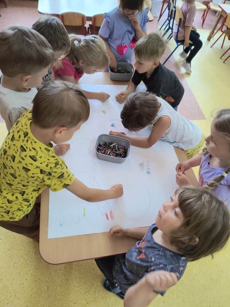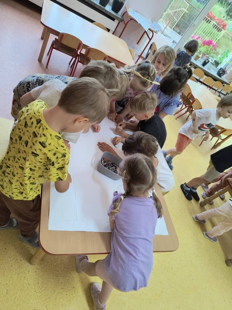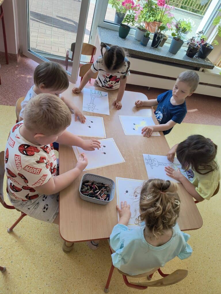 Przedszkolaki powitały swoją ukochaną porę roku – lato. Śpiewały piosenki, uczestniczyły w różnych zabawach i grach. Część dnia dzieci spędziły na zewnątrz: spacerowały, bawiły się chustą animacyjną, puszczały latawca na przedszkolnym placu zabaw. Dzieci wykonały także piękne prace plastyczne, aby przyozdobić nimi przedszkolną salę.
