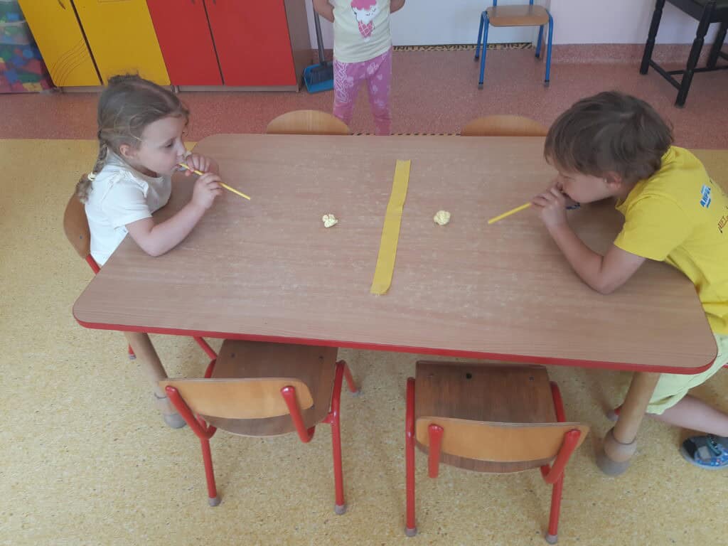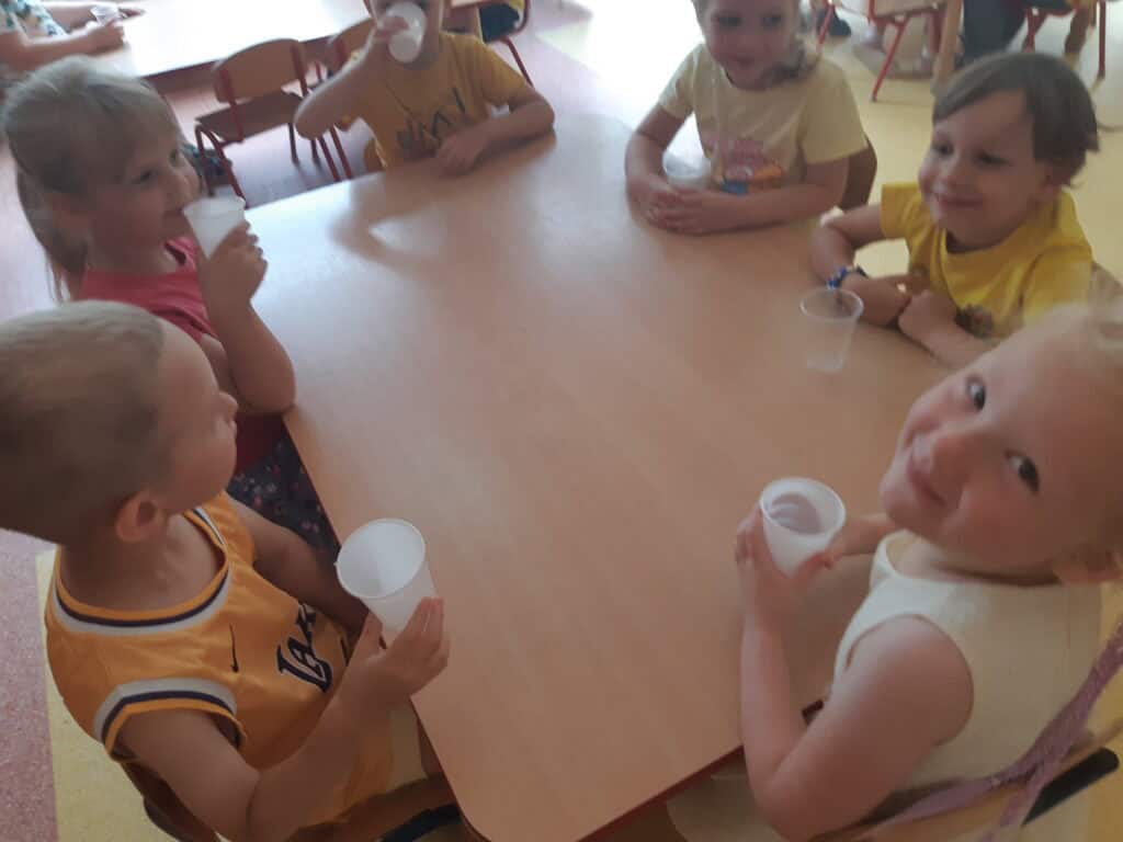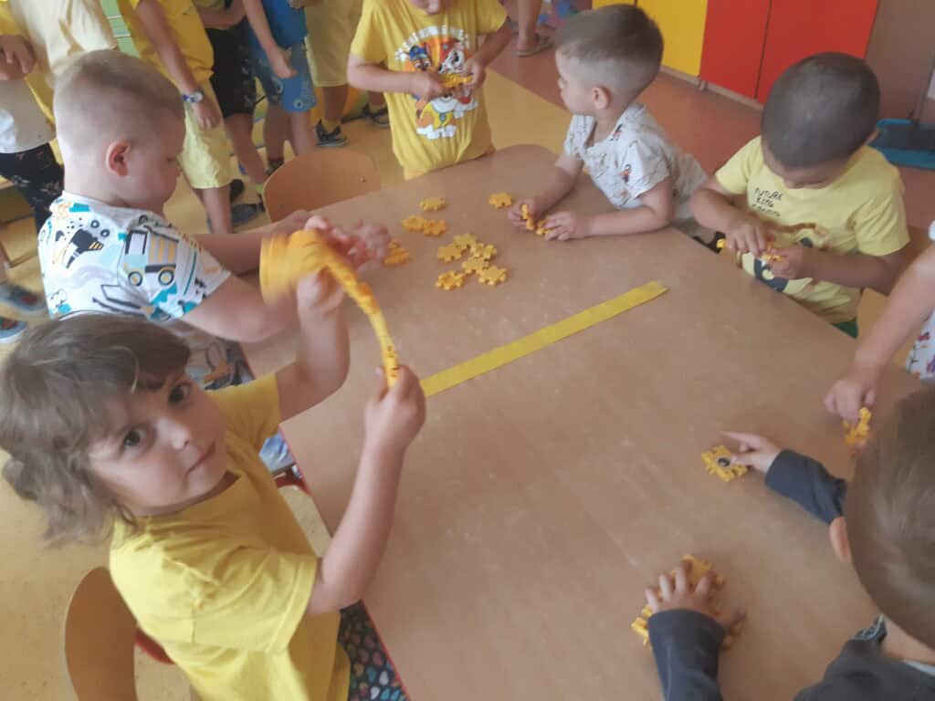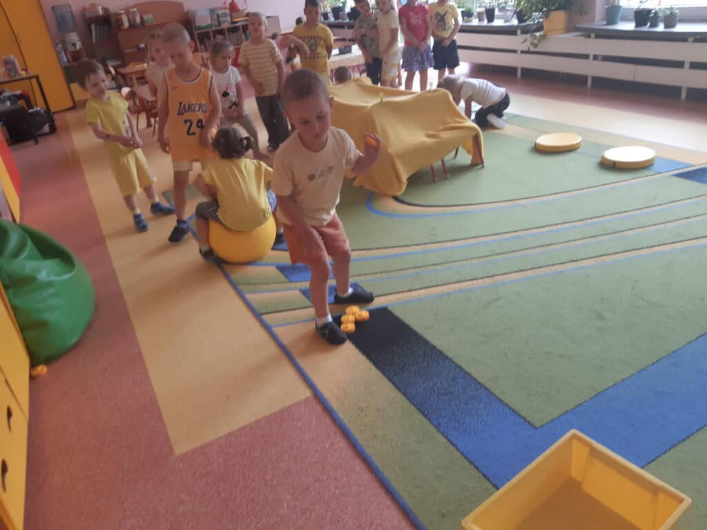 Pod koniec czerwca odbyły się kolejne zajęcia Kolorowej podróży. Tym razem wszystkie dzieci przyszły do przedszkola ubrane na żółto. Bawiliśmy się pod hasłem „Lato”. W naszej sali przedszkolaki miały okazję wykonać pracę plastyczną „Żółte słoneczniki”, a także pokonać żółty zręcznościowy tor przeszkód. Układaliśmy także budowle z klocków i przedmuchiwaliśmy papierowe kulki. Na zakończenie zmagań degustowaliśmy orzeźwiającą lemoniadę – oczywiście zrobioną z żółtych cytryn. Była świetna zabawa.