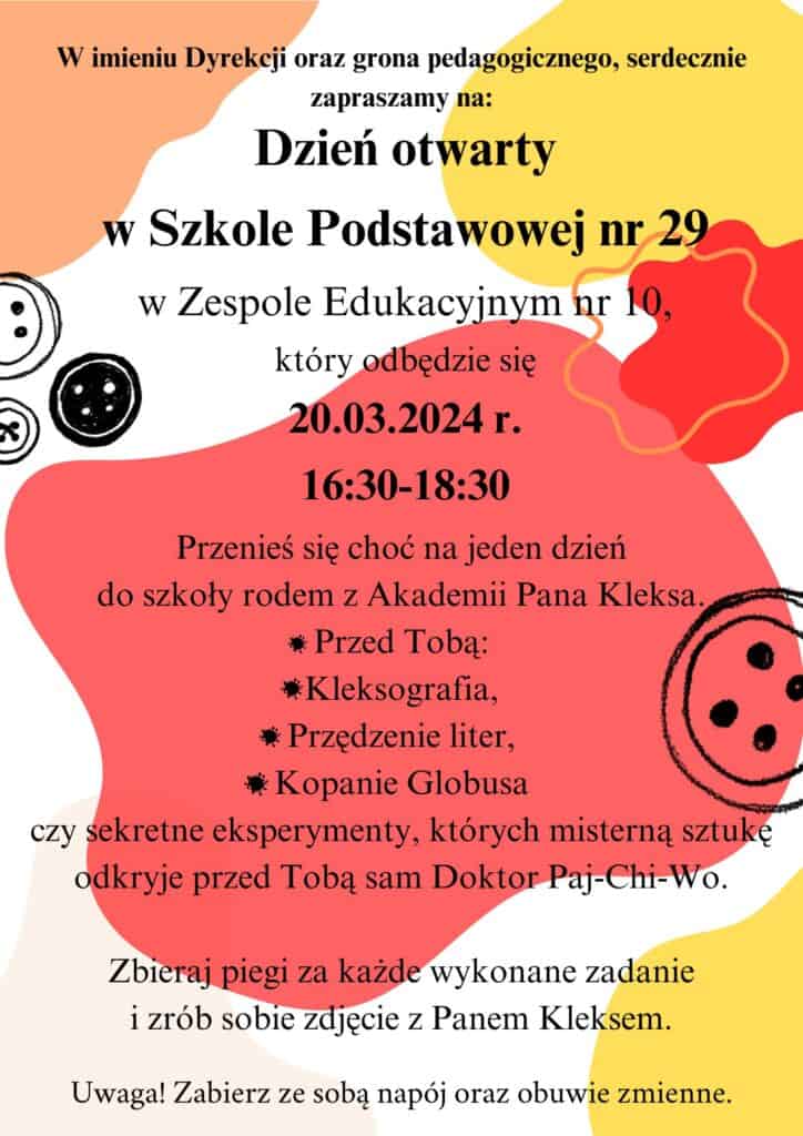 Zapraszamy na DZIEŃ OTWARTY w Szkole Podstawowej nr 29 w Zespole Edukacyjnym nr 10 w Zielonej Górze. Szczegóły na plakacie.