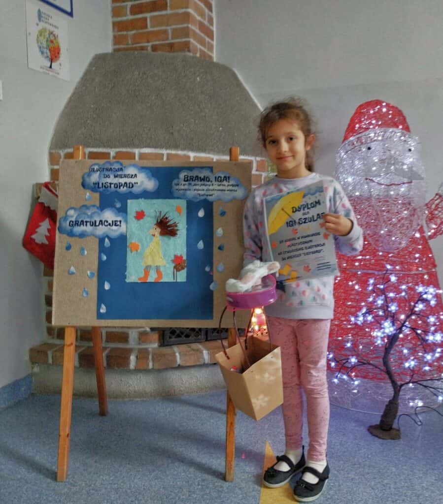W holu można podziwiać pracę finałowa konkursu plastyczno-literackiego „Listopad”. Konkurs trwał do dwudziestego piątego listopada i był przeznaczony dla dzieci sześcioletnich, które uczęszczają do naszego przedszkola. Zadaniem było stworzenie metodą wydzieranki lub kolażu ilustracji do wiersza Wandy Grodzieńskiej pt. „Listopad”. W konkursie wzięła udział jedna osoba. Jesteśmy pod wielkim wrażeniem pracy plastycznej, która została wykonana metodą wydzieranki. W subtelny i przemyślany sposób użyto barw, które współgrają ze sobą, tworząc piękną i harmonijną kompozycję, idealnie wpisując się w ton wiersza.