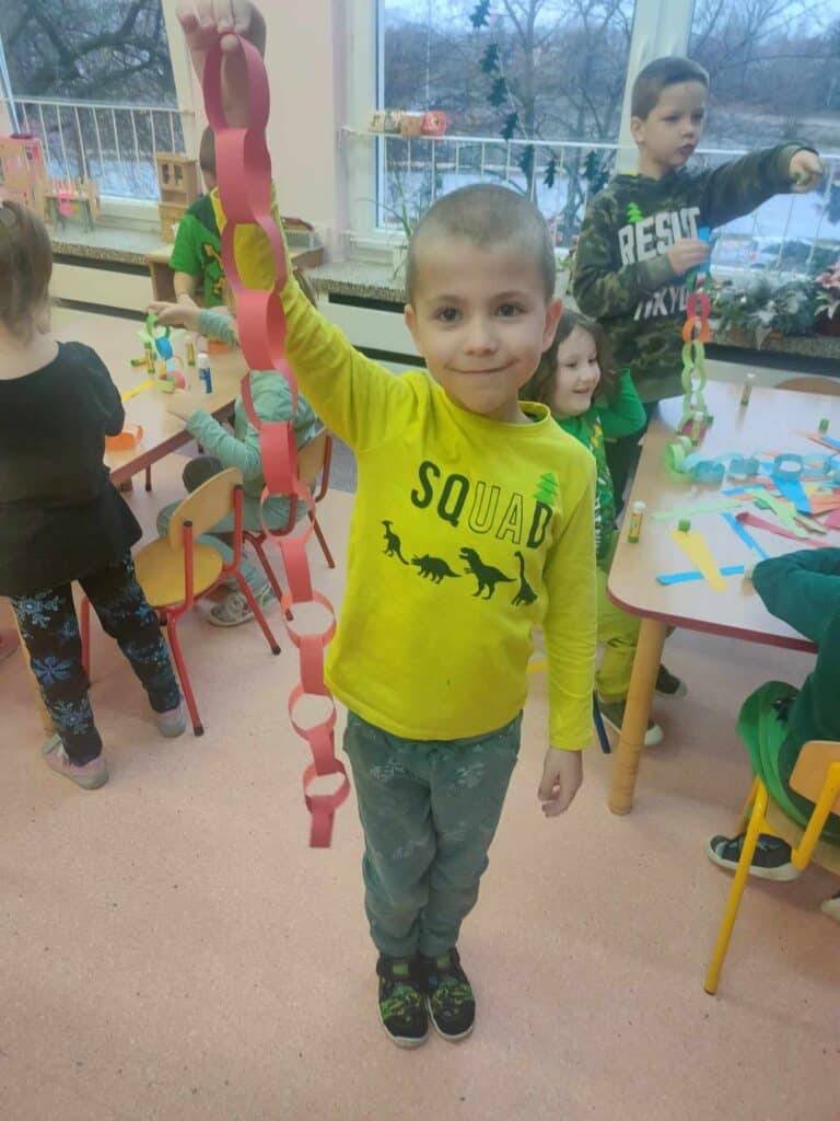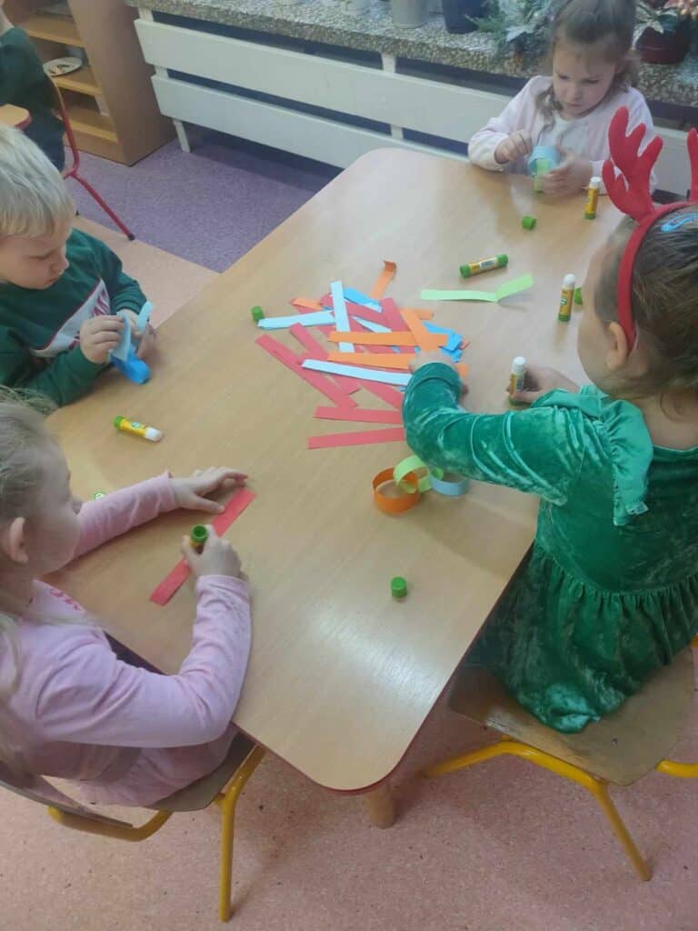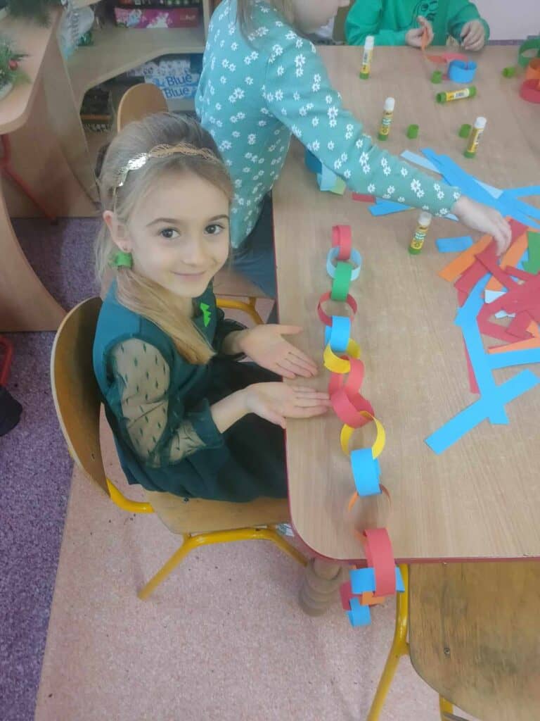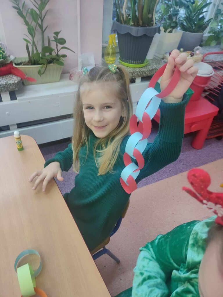 Grudniowa kolorowa podróż pod hasłem „Święta tuż tuż” odbyła się w kolorze zielonym. Było wiele ciekawych aktywności, m.in. dzieci wykonywały łańcuchy na choinkę.