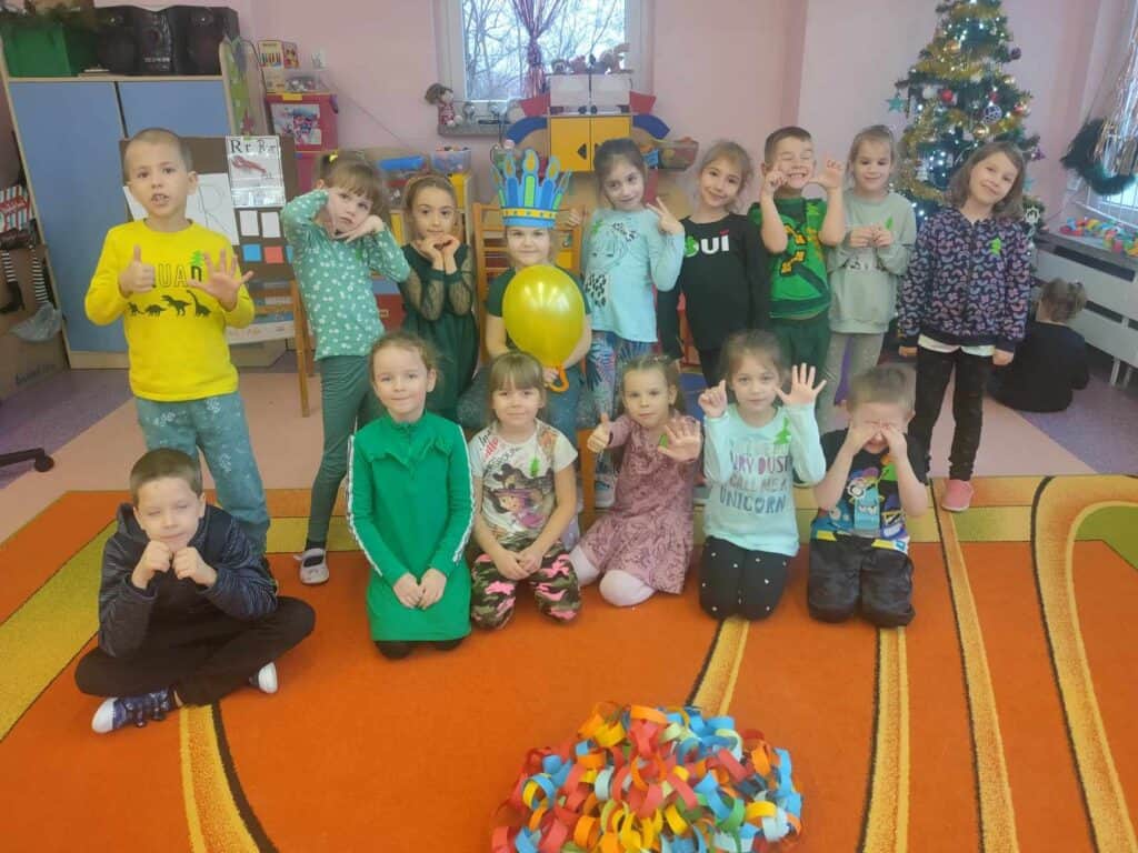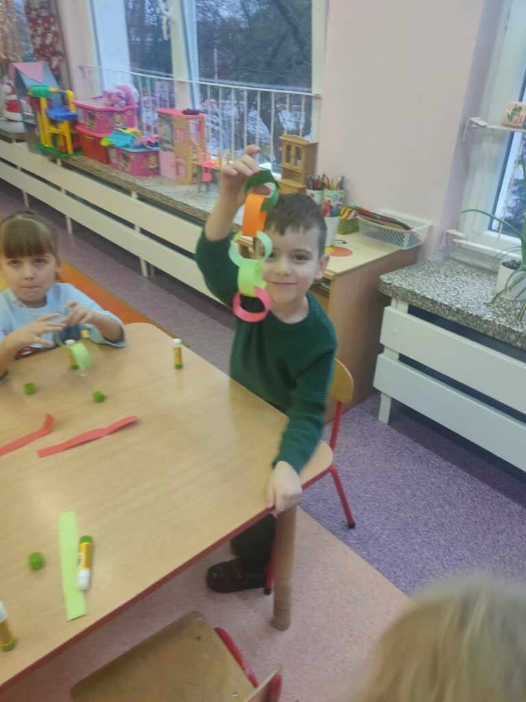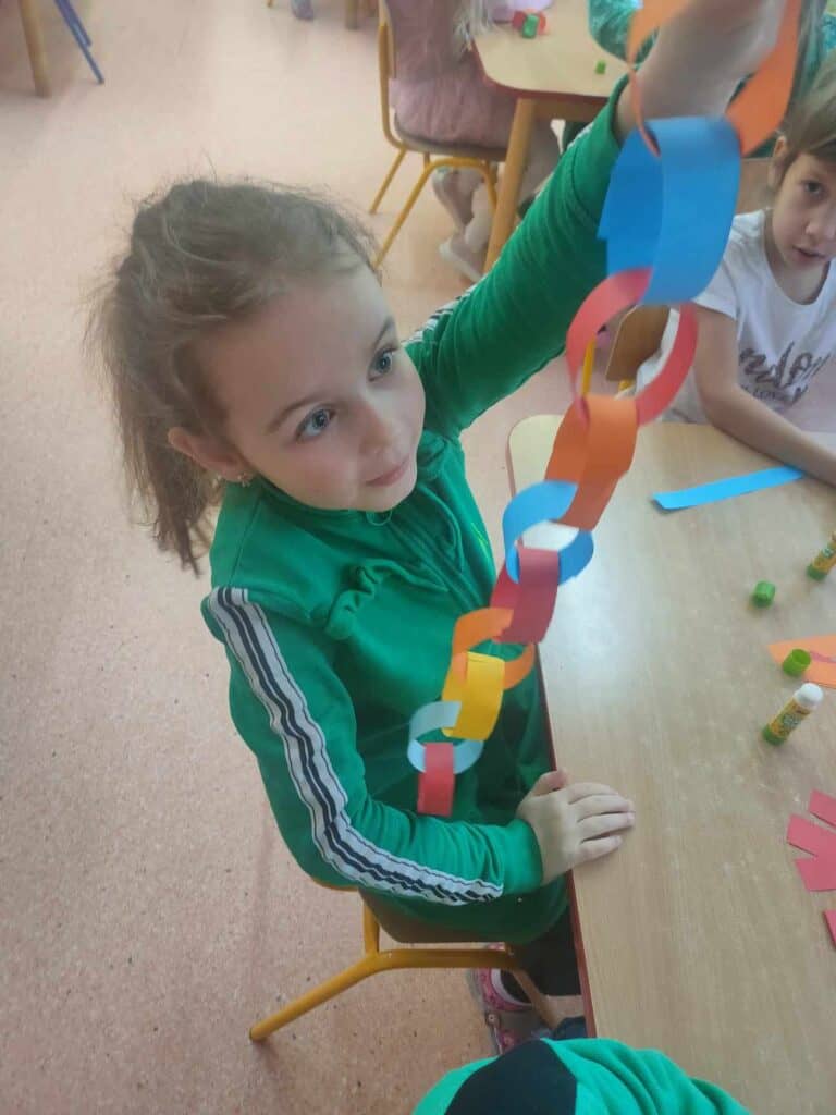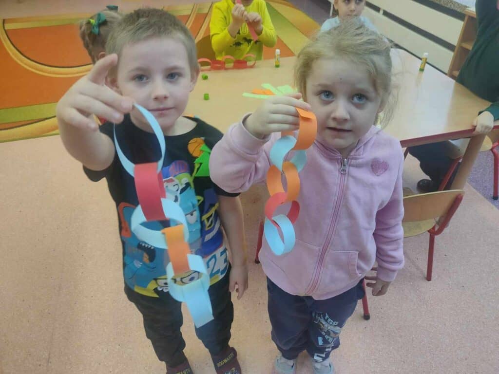 Grudniowa kolorowa podróż pod hasłem „Święta tuż tuż” odbyła się w kolorze zielonym. Było wiele ciekawych aktywności, m.in. dzieci wykonywały łańcuchy na choinkę.