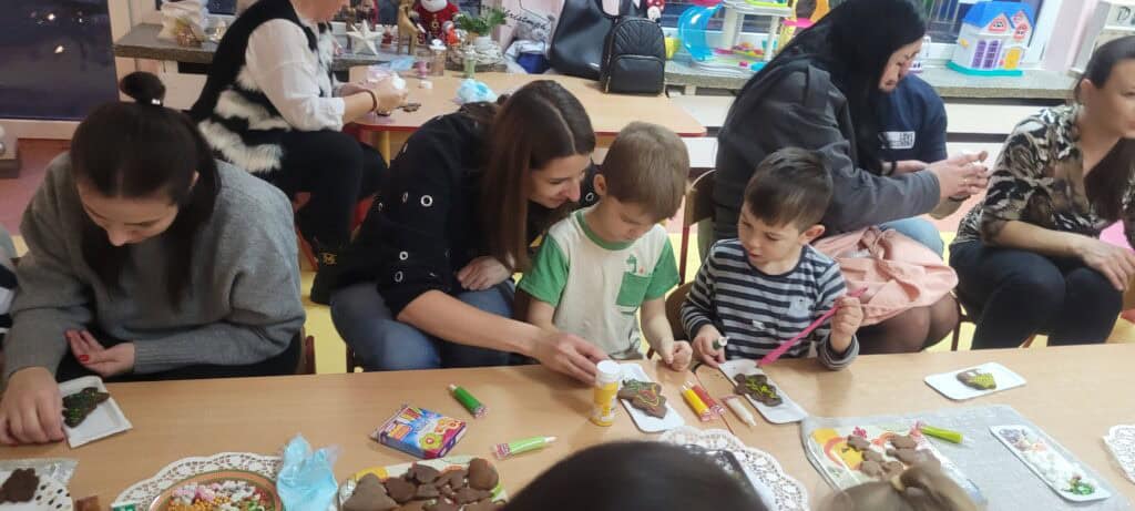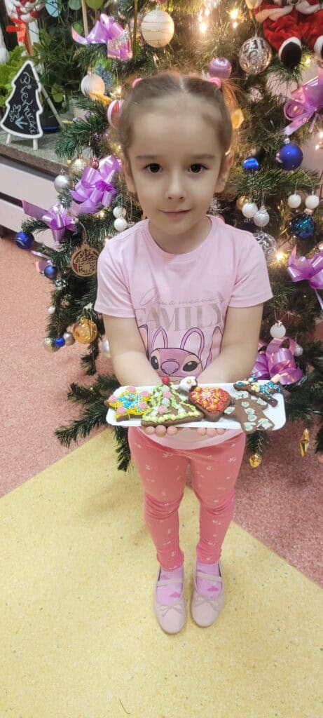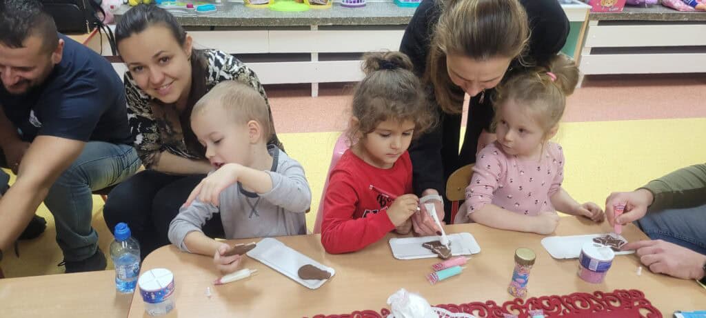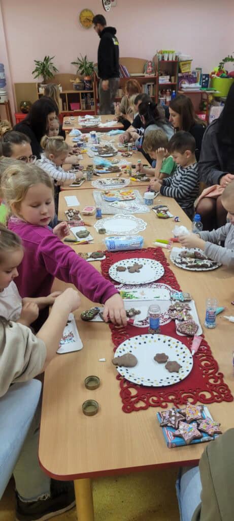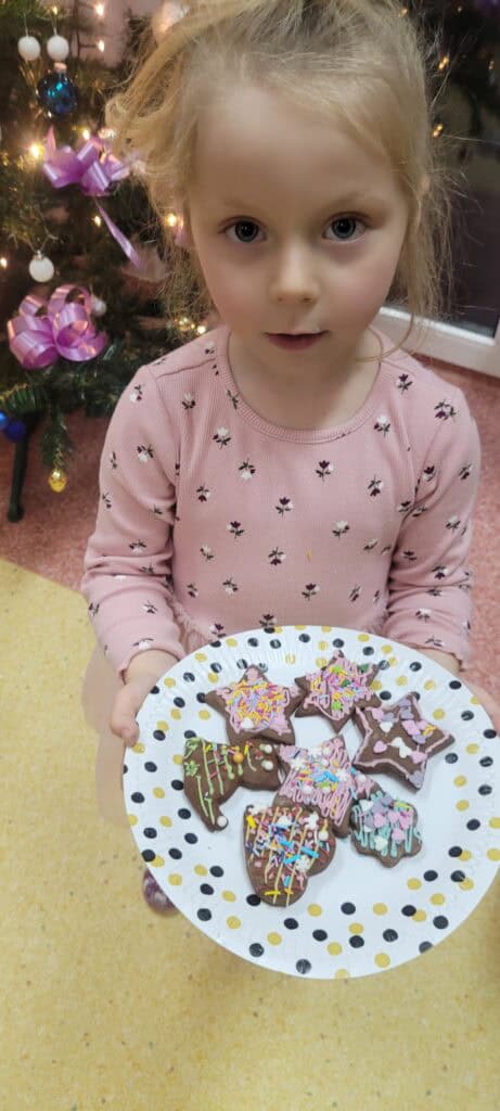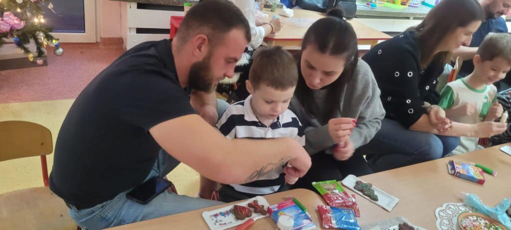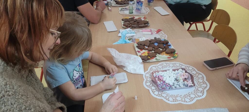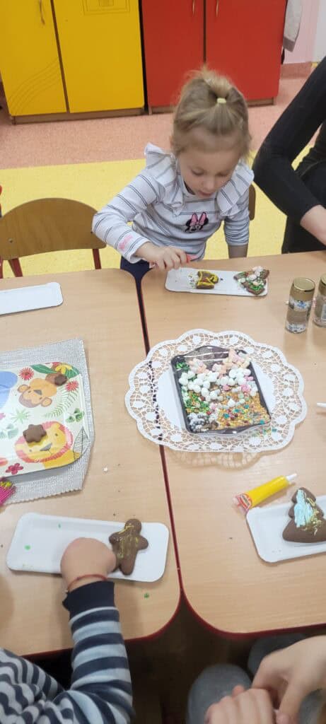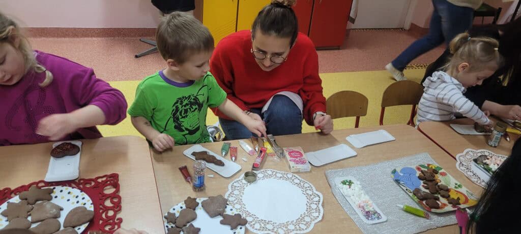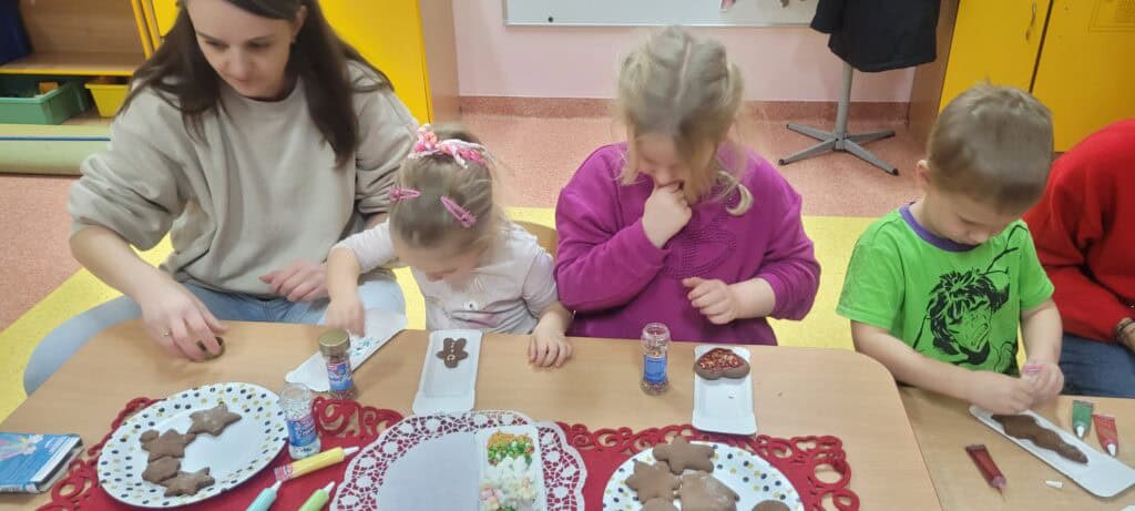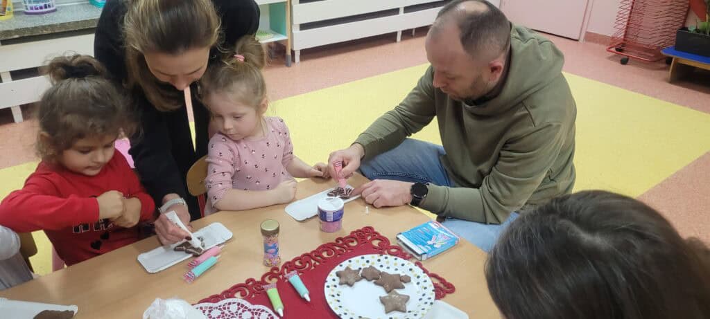 Zorganizowaliśmy również warsztaty pierniczkowe. Dzieci pomagały w przygotowywaniu pierniczków, a później wspólnie z zaproszonymi rodzicami dekorowaliśmy pierniczkowe wypieki.