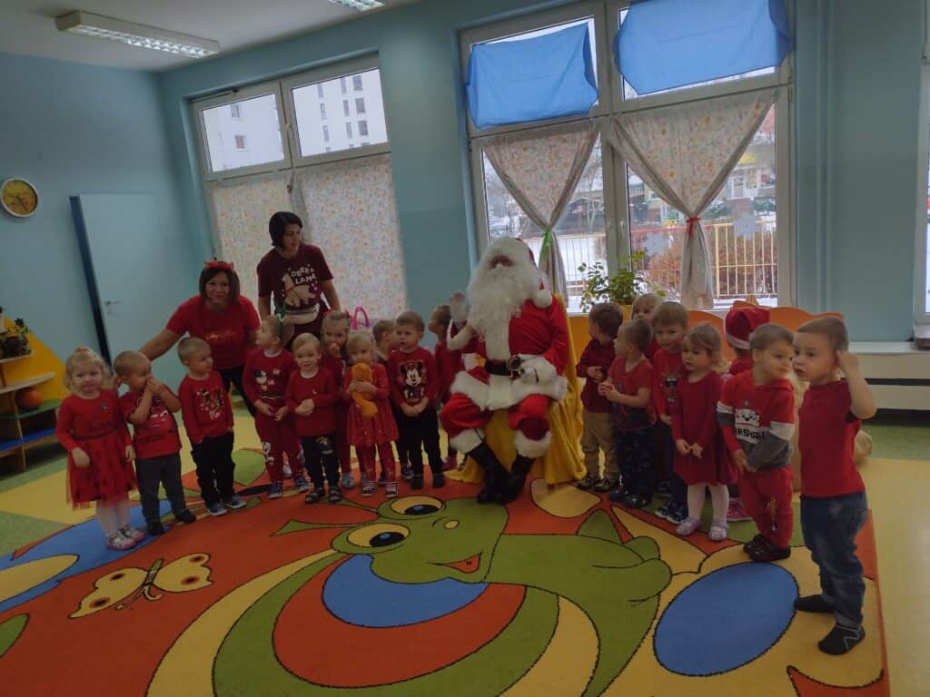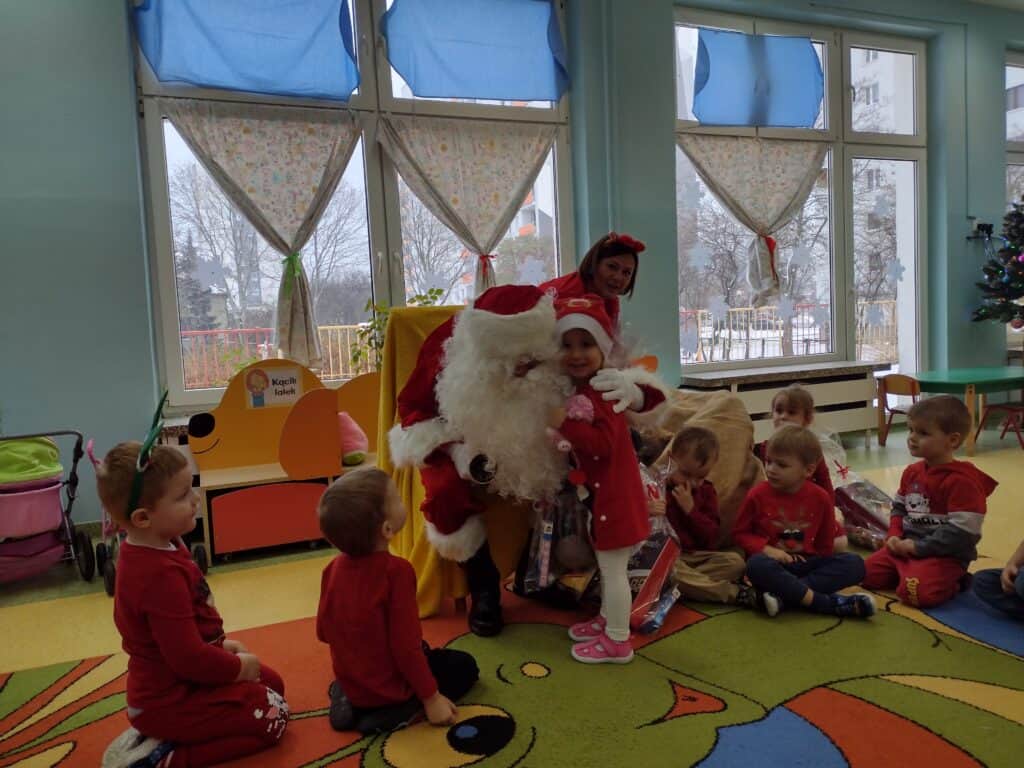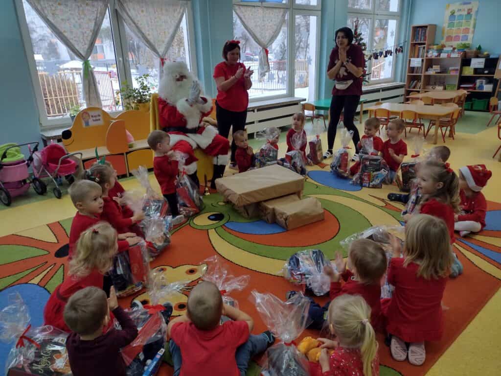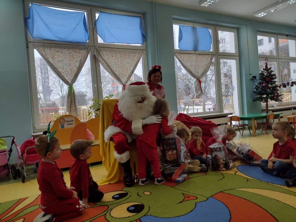 6 grudnia przyjechał z workiem pełnych prezentów Mikołaj. Każdemu dziecku wręczył wspaniałą paczkę co sprawiło, że twarze maluchów rozświetliły się świątecznym blaskiem. Mikołaj przyniósł także prezenty dla całej grupy: kolorowe pomysłowe zabawki, które dostarczyły wiele radości podczas zabawy. Nasze utalentowane Pszczółki postanowiły podziękować Mikołajowi za prezenty poprzez zaśpiewanie dla niego piosenki. Pod koniec pobytu Mikołaja w Sali gimnastycznej odbyła się niezapomniana impreza, podczas której przedszkolaki zatańczyły wspólnie z przemiłym gościem do świątecznych rytmów.