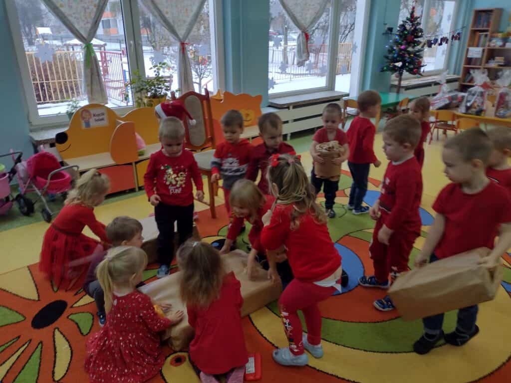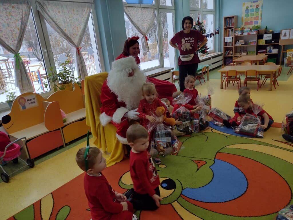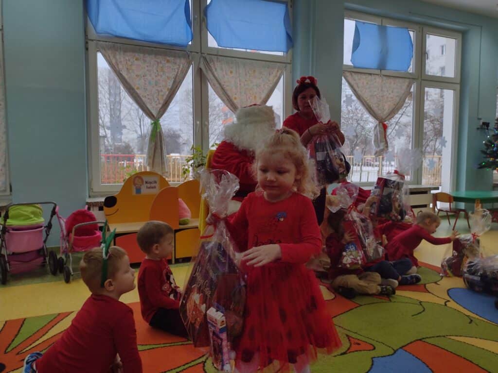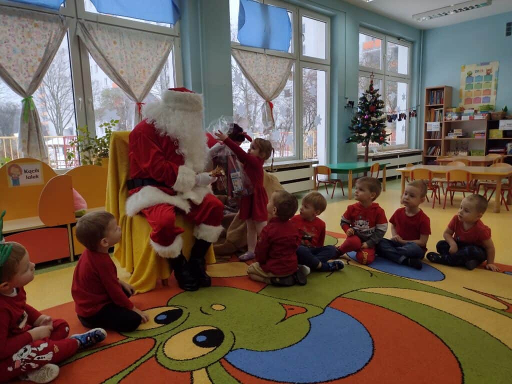 6 grudnia przyjechał z workiem pełnych prezentów Mikołaj. Każdemu dziecku wręczył wspaniałą paczkę co sprawiło, że twarze maluchów rozświetliły się świątecznym blaskiem. Mikołaj przyniósł także prezenty dla całej grupy: kolorowe pomysłowe zabawki, które dostarczyły wiele radości podczas zabawy. Nasze utalentowane Pszczółki postanowiły podziękować Mikołajowi za prezenty poprzez zaśpiewanie dla niego piosenki. Pod koniec pobytu Mikołaja w Sali gimnastycznej odbyła się niezapomniana impreza, podczas której przedszkolaki zatańczyły wspólnie z przemiłym gościem do świątecznych rytmów.