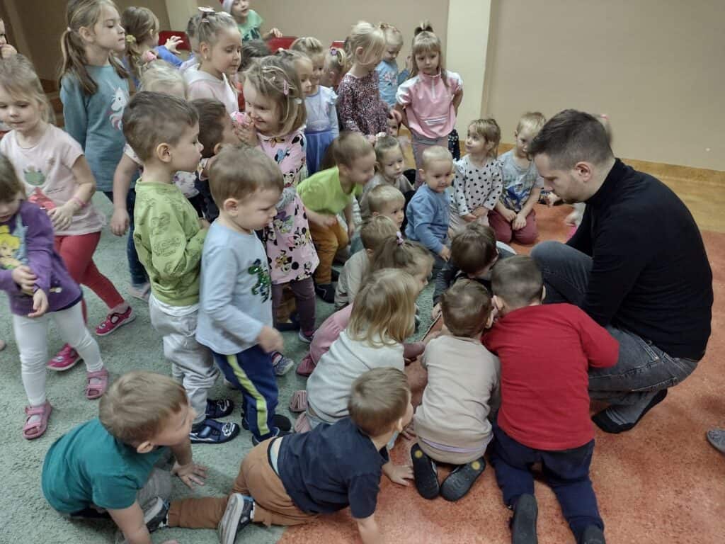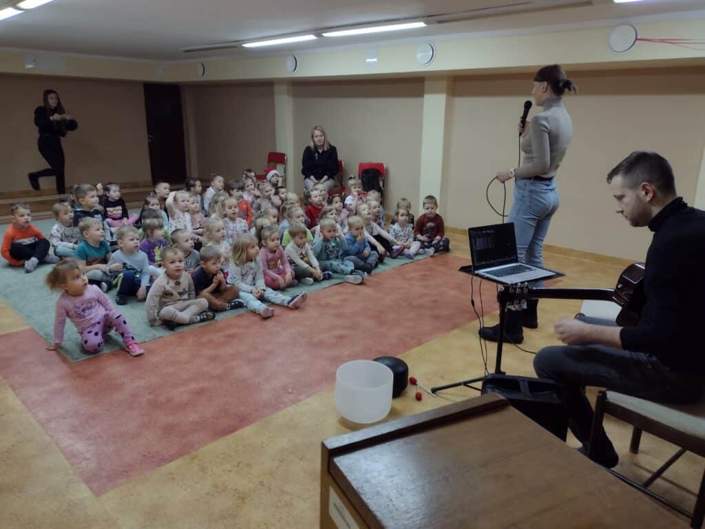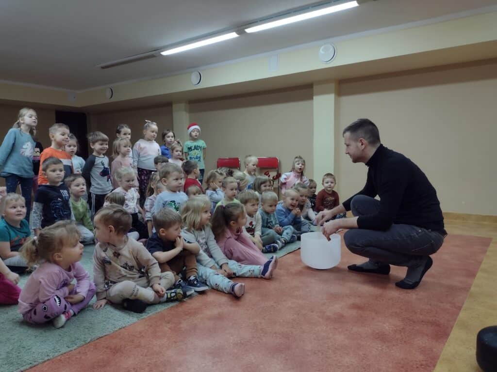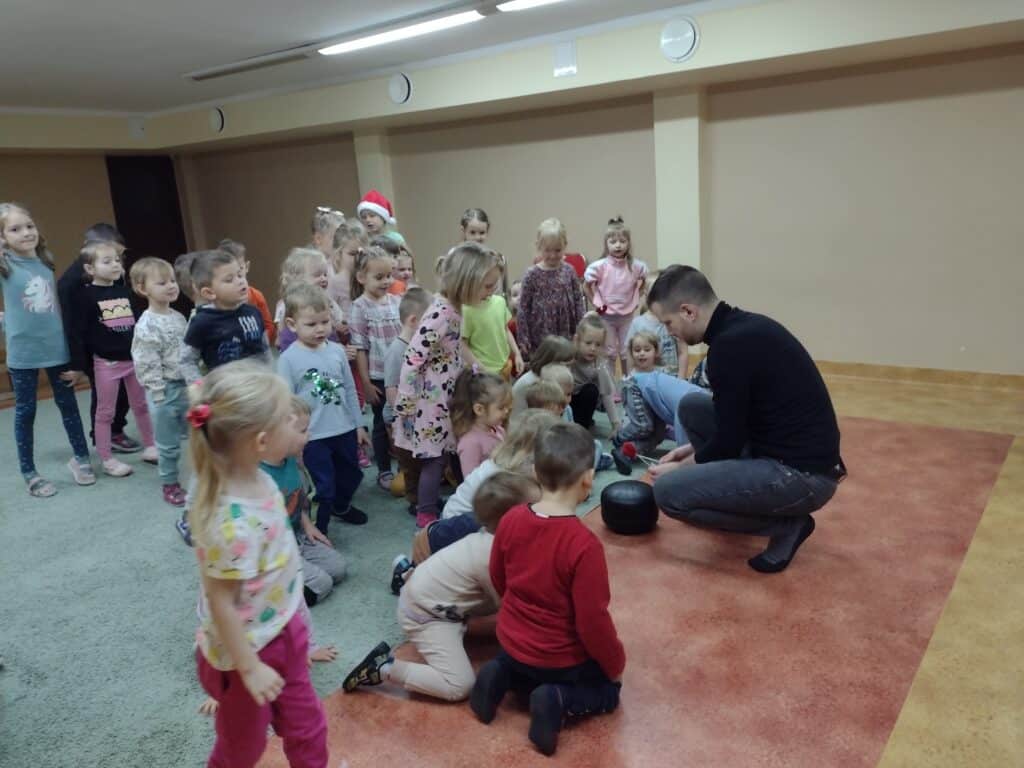7 grudnia dzieci wzięły udział w spotkaniu z niezwykłym artystą – Onkomuzykiem Michałem Dreznerem. Spotkanie z panem Michałem miało wyjątkowy charakter, wszyscy razem wzięliśmy udział w radosnym kolędowaniu. Dzieci śpiewały znane kolędy, tworząc magiczną atmosferę świąt.