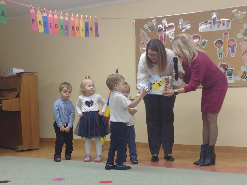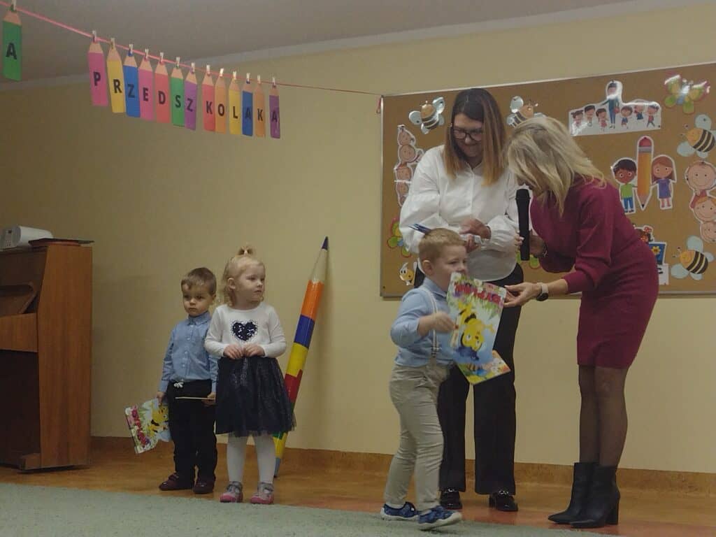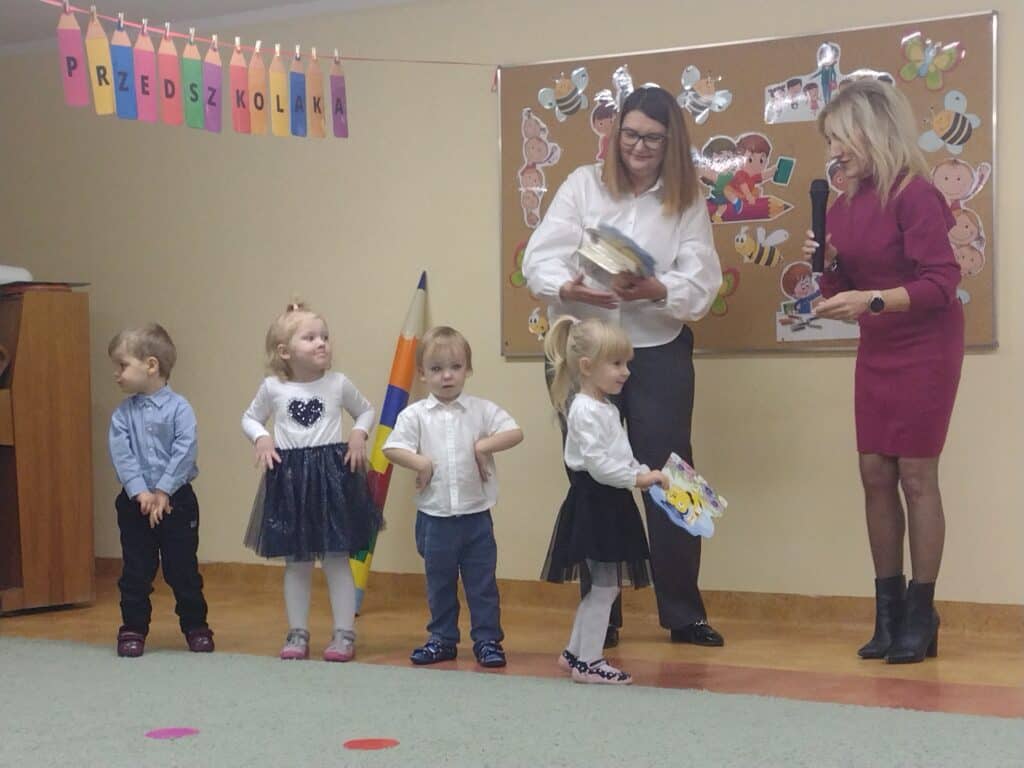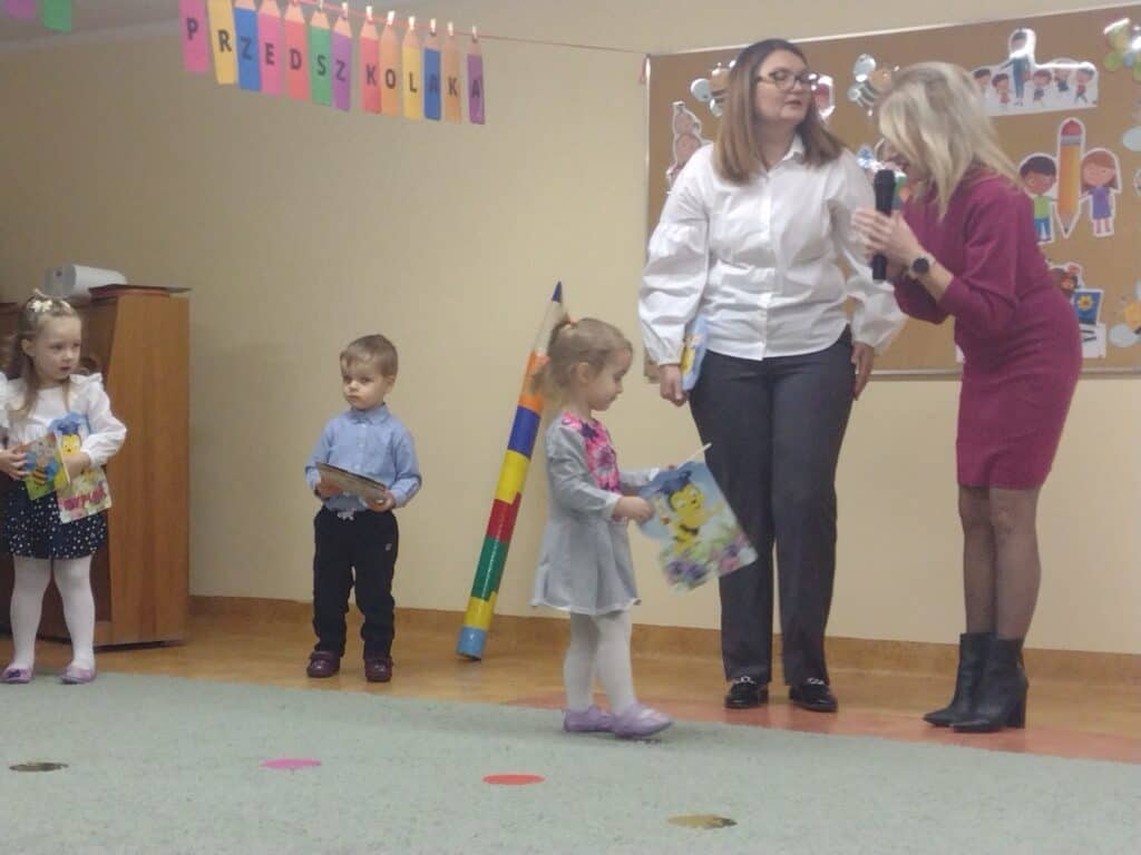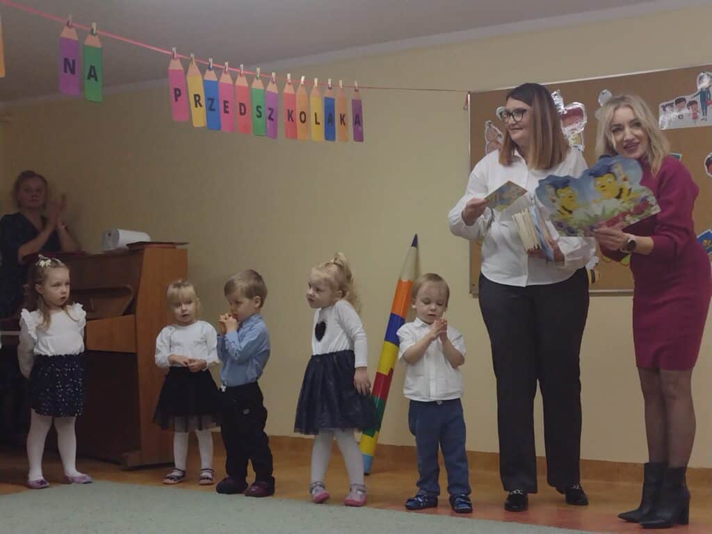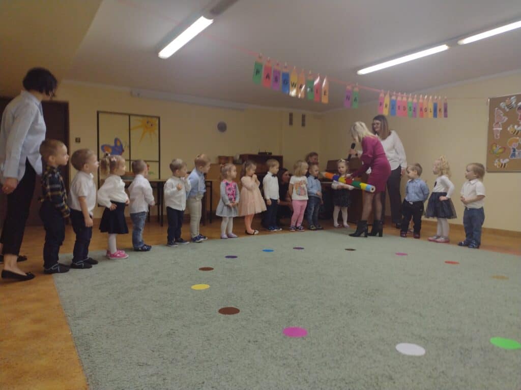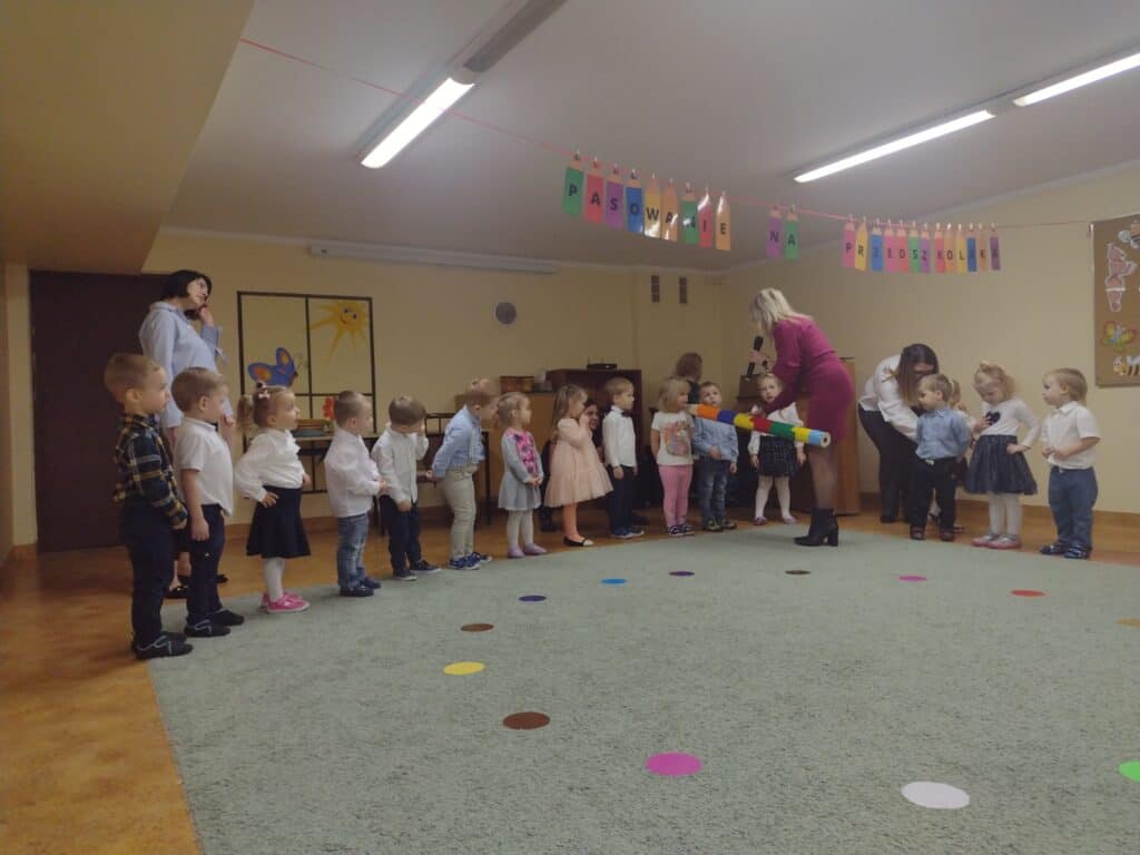 8 grudnia odbyła się w naszym przedszkolu uroczystość z okazji Pasowania na Przedszkolaka naszych maluchów. Tego dnia Pszczółki z radością wystąpiły po raz pierwszy przed rodzicami. Zaprezentowały swoje umiejętności taneczne i wokalne, emanując radościom i entuzjazmem. Na koniec występu Pani Basia, w zastępstwie Pani Dyrektor, indywidualnie pasowała każde dziecko na przedszkolaka. Dzieci otrzymały dyplomy potwierdzające ich oficjalne wejście w przedszkolną przygodę. Dodatkowo, jako pamiątkę, każde dziecko otrzymało także uroczy upominek – puzzle w kształcie Pszczółki. Po uroczystości czekała na naszych maluchów słodka niespodzianka – pyszny tort, który został zjedzony w atmosferze śmiechu i radości. Po oficjalnej części uroczystości dzieci wzięły udział we wspólnych zabawach tanecznych. Energia, śmiech i beztroska maluchów sprawiły, że sala rozbrzmiewała radosnym gwarem.
