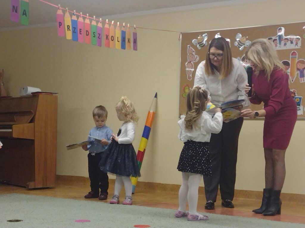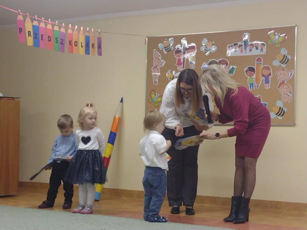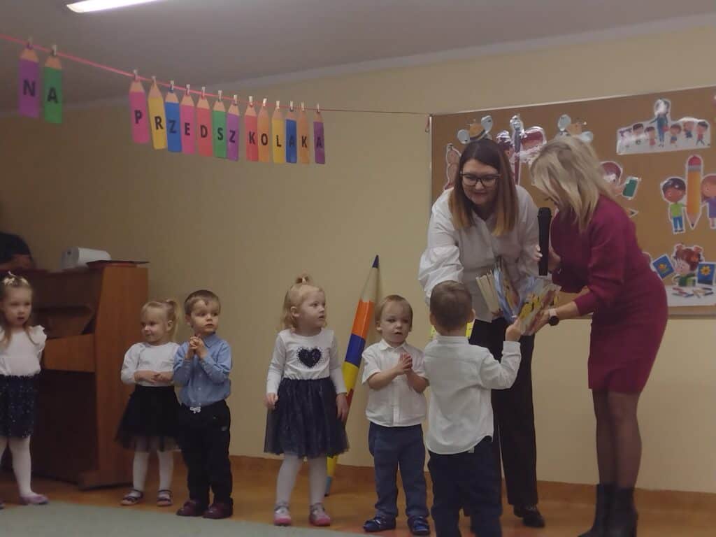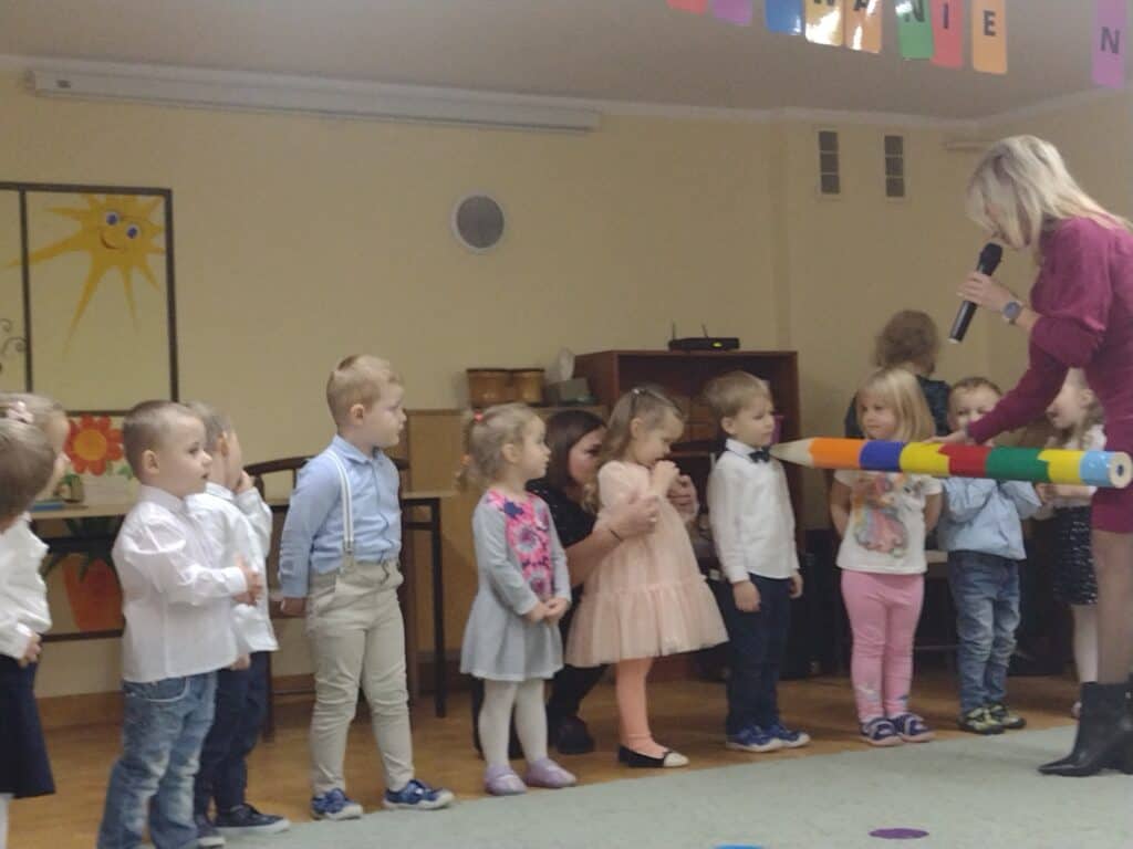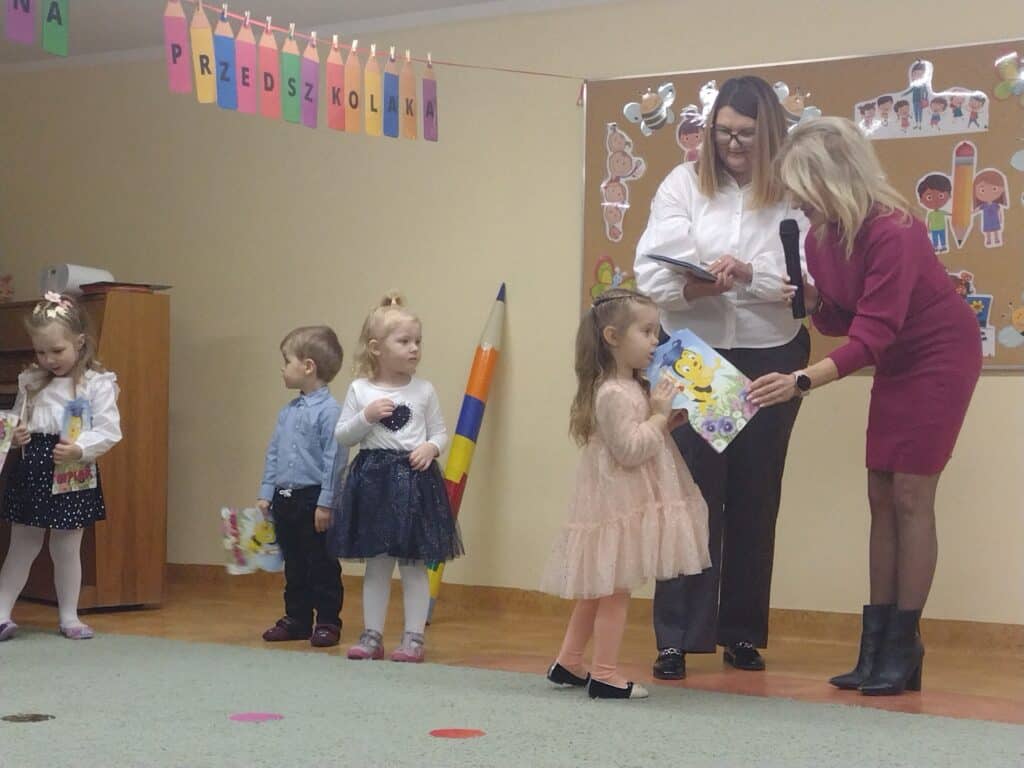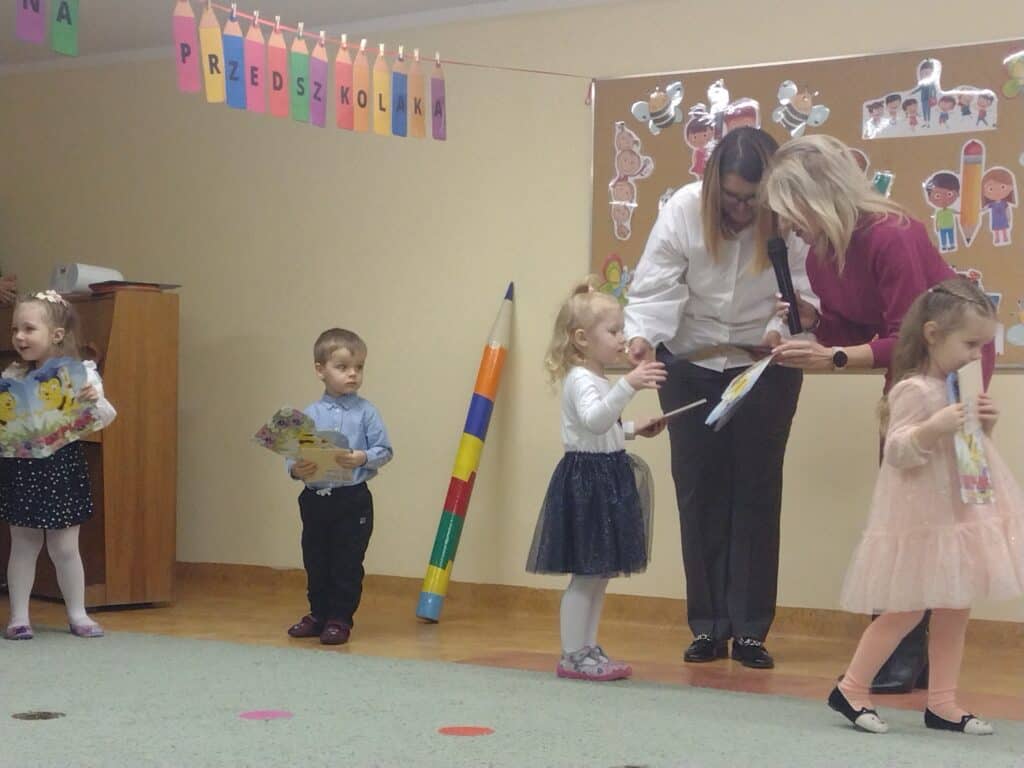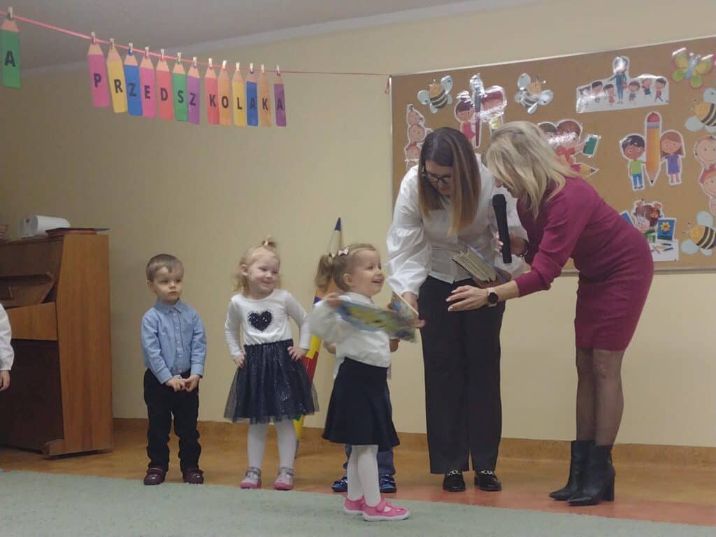8 grudnia odbyła się w naszym przedszkolu uroczystość z okazji Pasowania na Przedszkolaka naszych maluchów. Tego dnia Pszczółki z radością wystąpiły po raz pierwszy przed rodzicami. Zaprezentowały swoje umiejętności taneczne i wokalne, emanując radościom i entuzjazmem. Na koniec występu Pani Basia, w zastępstwie Pani Dyrektor, indywidualnie pasowała każde dziecko na przedszkolaka. Dzieci otrzymały dyplomy potwierdzające ich oficjalne wejście w przedszkolną przygodę. Dodatkowo, jako pamiątkę, każde dziecko otrzymało także uroczy upominek – puzzle w kształcie Pszczółki. Po uroczystości czekała na naszych maluchów słodka niespodzianka – pyszny tort, który został zjedzony w atmosferze śmiechu i radości. Po oficjalnej części uroczystości dzieci wzięły udział we wspólnych zabawach tanecznych. Energia, śmiech i beztroska maluchów sprawiły, że sala rozbrzmiewała radosnym gwarem.