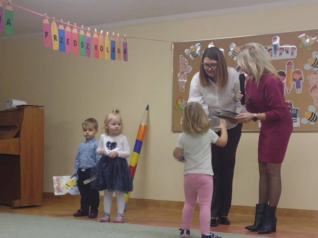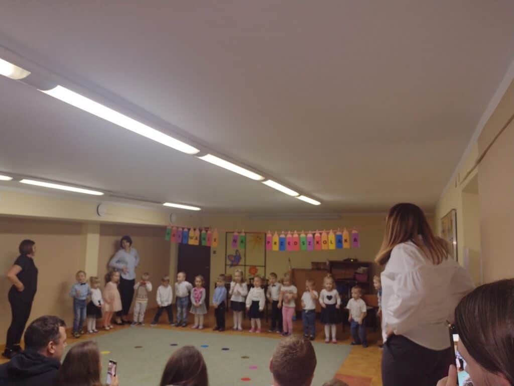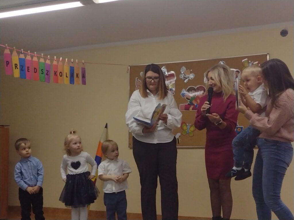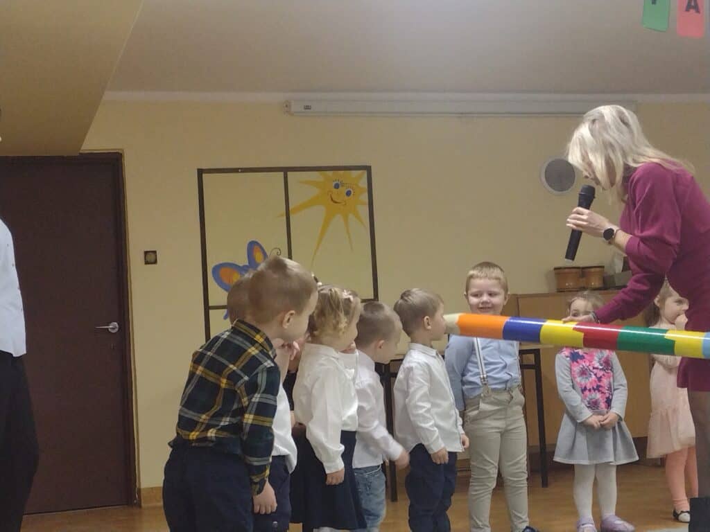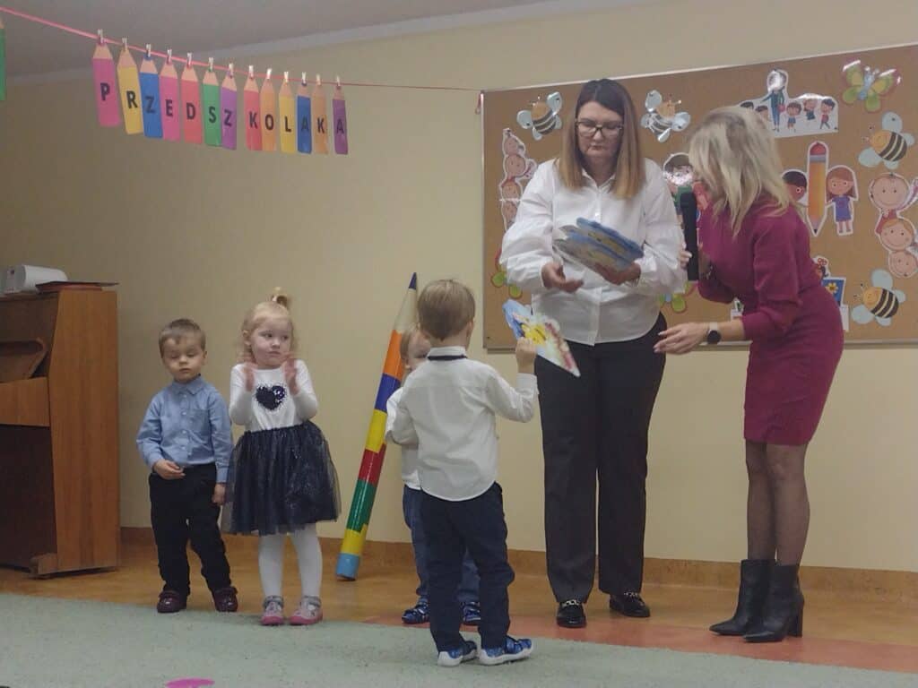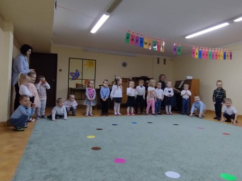 8 grudnia odbyła się w naszym przedszkolu uroczystość z okazji Pasowania na Przedszkolaka naszych maluchów. Tego dnia Pszczółki z radością wystąpiły po raz pierwszy przed rodzicami. Zaprezentowały swoje umiejętności taneczne i wokalne, emanując radościom i entuzjazmem. Na koniec występu Pani Basia, w zastępstwie Pani Dyrektor, indywidualnie pasowała każde dziecko na przedszkolaka. Dzieci otrzymały dyplomy potwierdzające ich oficjalne wejście w przedszkolną przygodę. Dodatkowo, jako pamiątkę, każde dziecko otrzymało także uroczy upominek – puzzle w kształcie Pszczółki. Po uroczystości czekała na naszych maluchów słodka niespodzianka – pyszny tort, który został zjedzony w atmosferze śmiechu i radości. Po oficjalnej części uroczystości dzieci wzięły udział we wspólnych zabawach tanecznych. Energia, śmiech i beztroska maluchów sprawiły, że sala rozbrzmiewała radosnym gwarem.