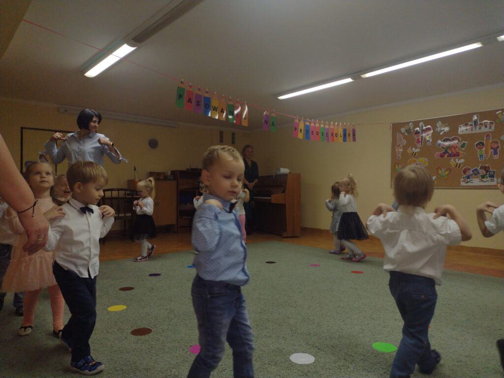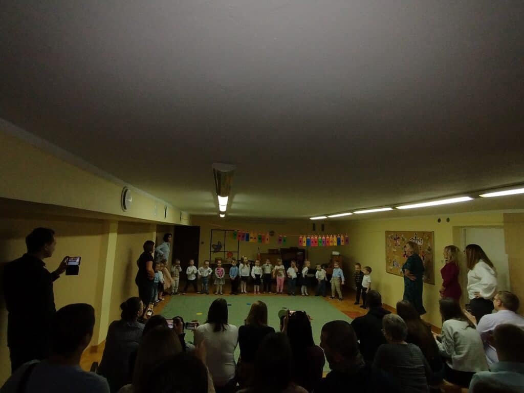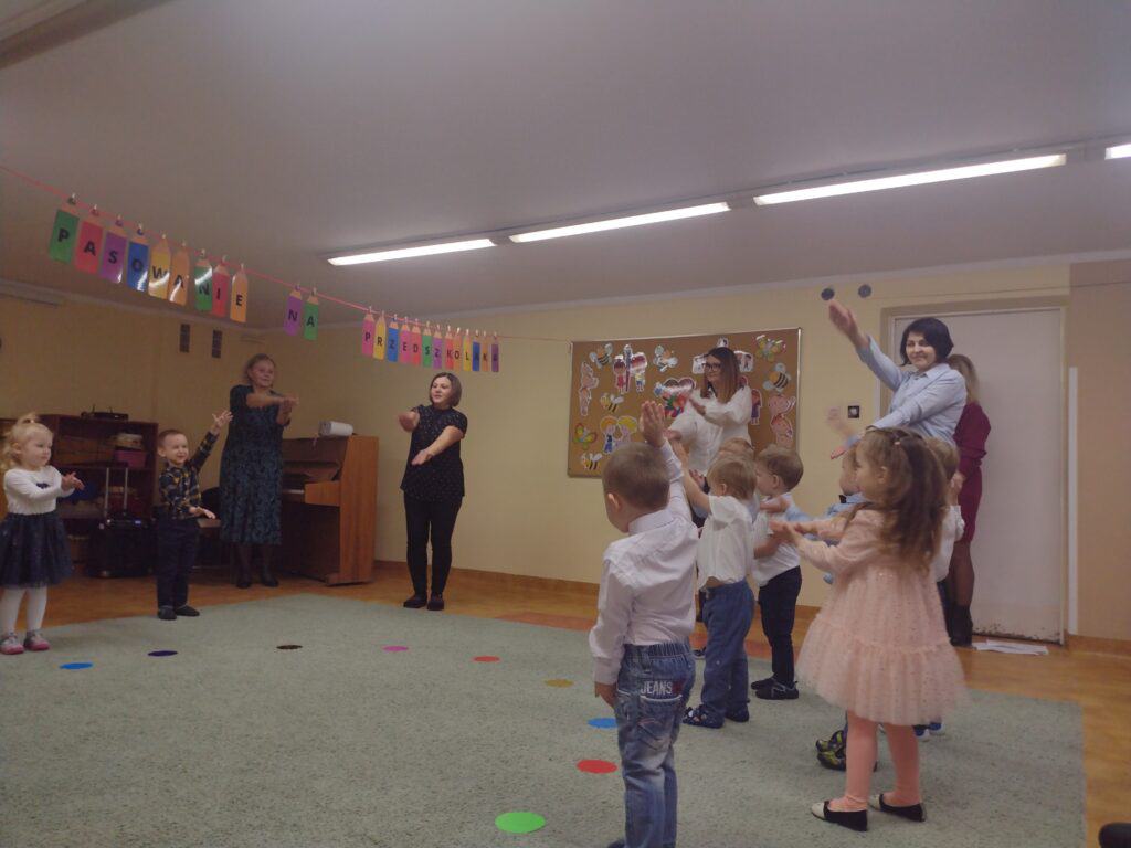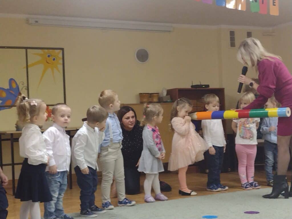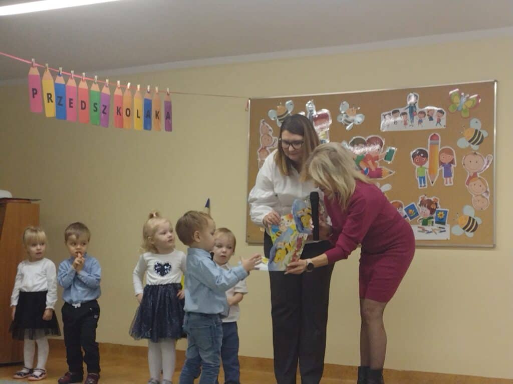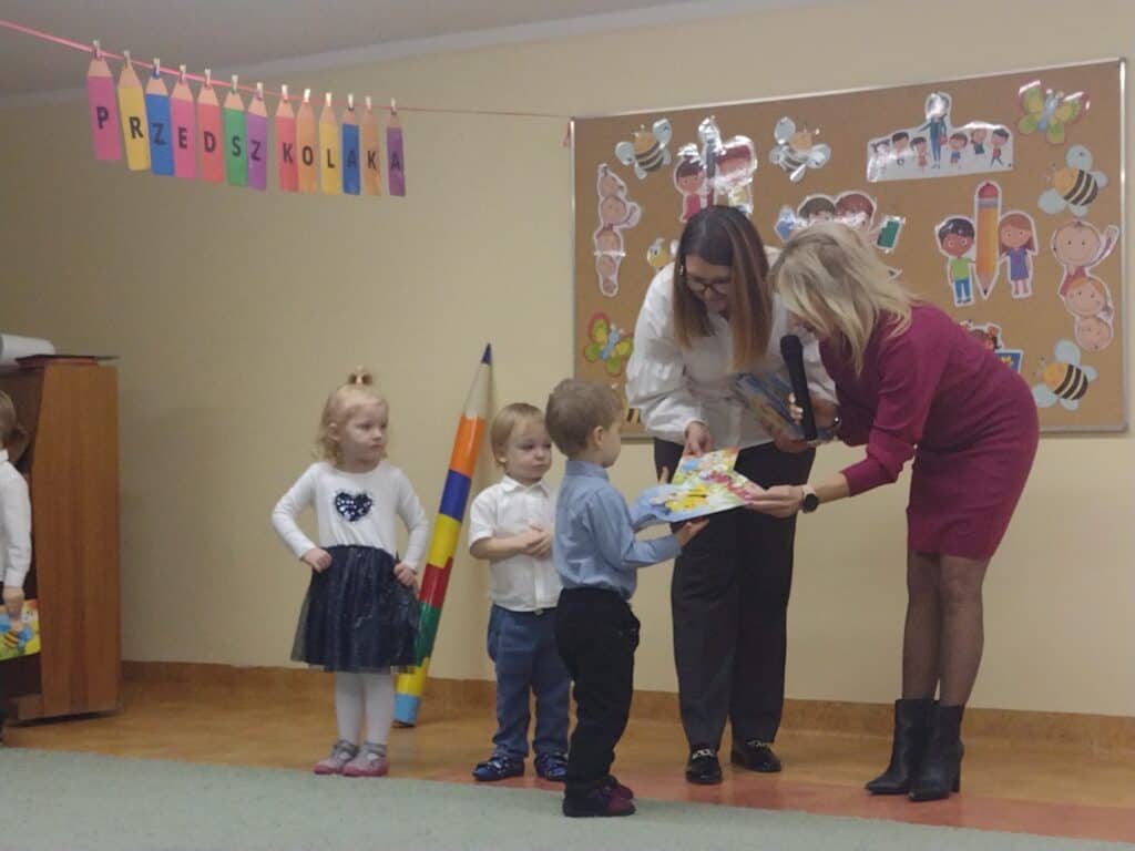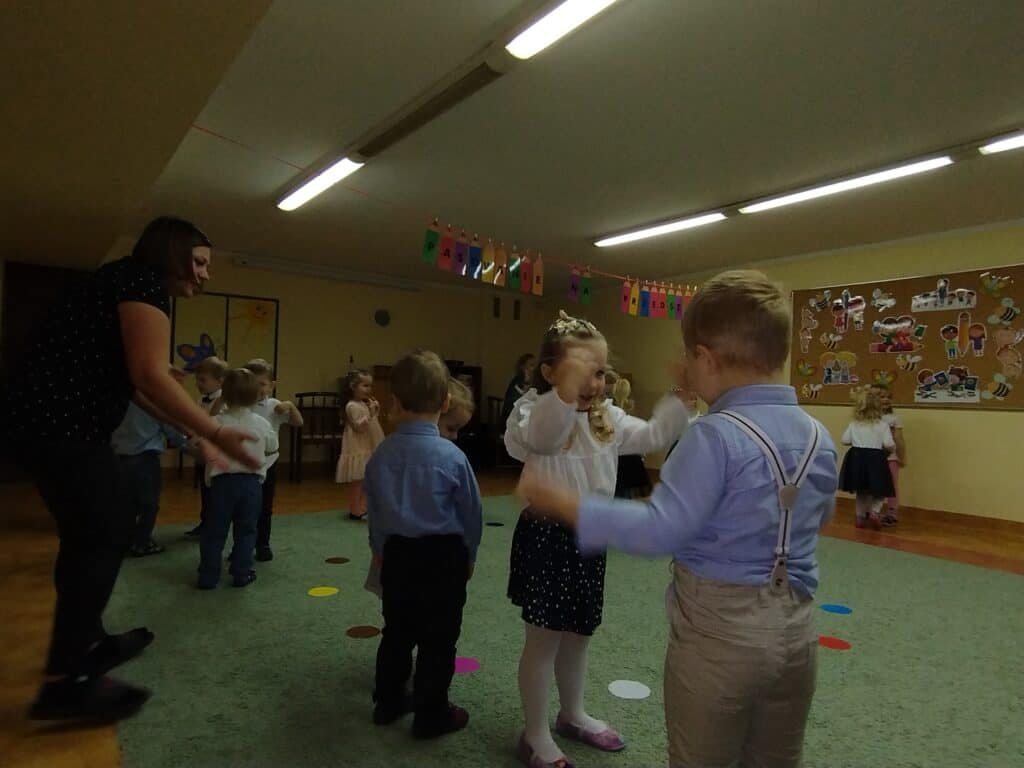 8 grudnia odbyła się w naszym przedszkolu uroczystość z okazji Pasowania na Przedszkolaka naszych maluchów. Tego dnia Pszczółki z radością wystąpiły po raz pierwszy przed rodzicami. Zaprezentowały swoje umiejętności taneczne i wokalne, emanując radościom i entuzjazmem. Na koniec występu Pani Basia, w zastępstwie Pani Dyrektor, indywidualnie pasowała każde dziecko na przedszkolaka. Dzieci otrzymały dyplomy potwierdzające ich oficjalne wejście w przedszkolną przygodę. Dodatkowo, jako pamiątkę, każde dziecko otrzymało także uroczy upominek – puzzle w kształcie Pszczółki. Po uroczystości czekała na naszych maluchów słodka niespodzianka – pyszny tort, który został zjedzony w atmosferze śmiechu i radości. Po oficjalnej części uroczystości dzieci wzięły udział we wspólnych zabawach tanecznych. Energia, śmiech i beztroska maluchów sprawiły, że sala rozbrzmiewała radosnym gwarem.