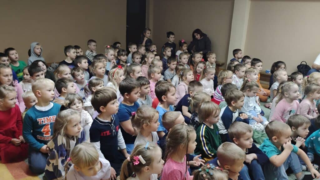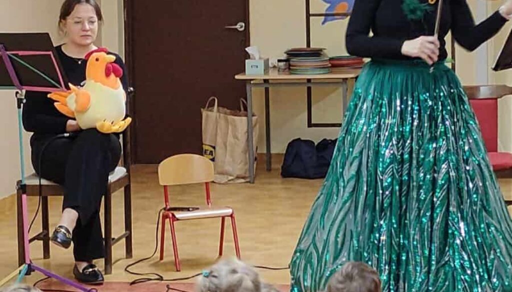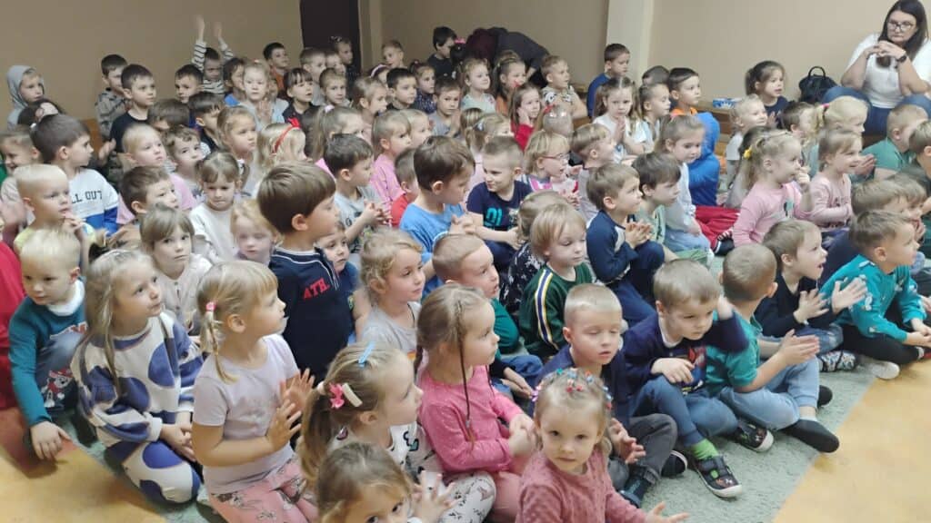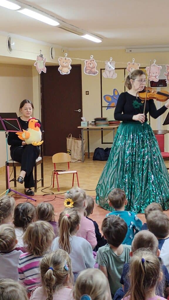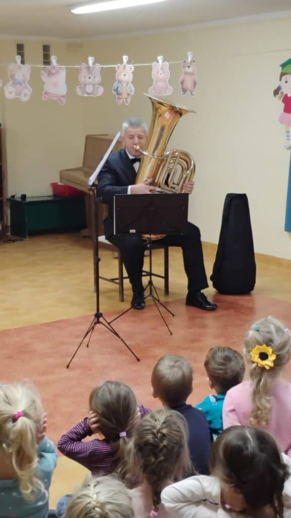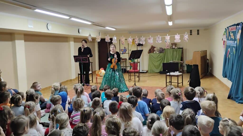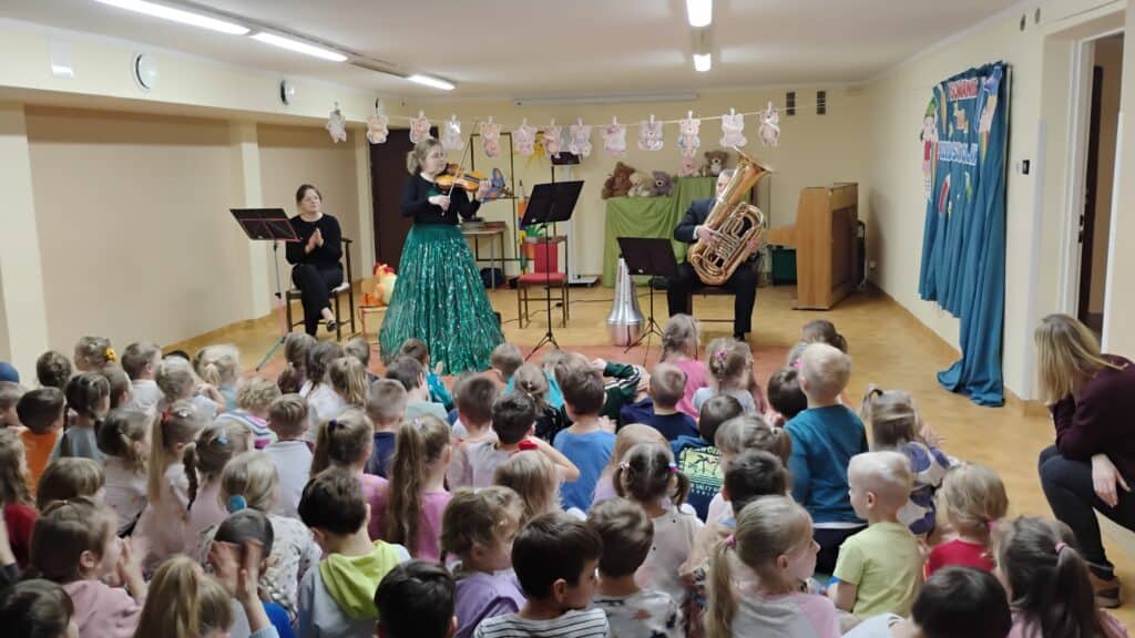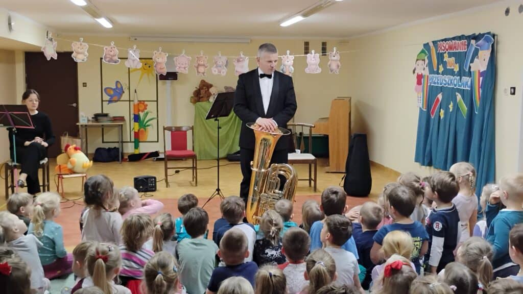 W naszym przedszkolu odbył się koncert pod tytułem „Miała babcia kokoszkę zwariowaną troszkę”. Była to wyjątkowa okazja, aby dzieci mogły wyruszyć w muzyczną podróż po świecie zwierząt. Podczas występu artyści zaprezentowali takie instrumenty jak skrzypce i tuba, które w magiczny sposób naśladowały odgłosy zwierząt. Dzięki muzyce dzieci mogły usłyszeć kurę, pszczołę, kota, słonia, krowę, osiołka i konia. Dodatkowo mali słuchacze mieli okazję poznać ciekawy dodatek do instrumentów – tłumik. Pan muzyk pokazał, jak za jego pomocą można zmieniać brzmienie instrumentu i zagrać odgłos łabędzia. Dzieci były zachwycone, nie możemy się więc doczekać kolejnych takich spotkań!