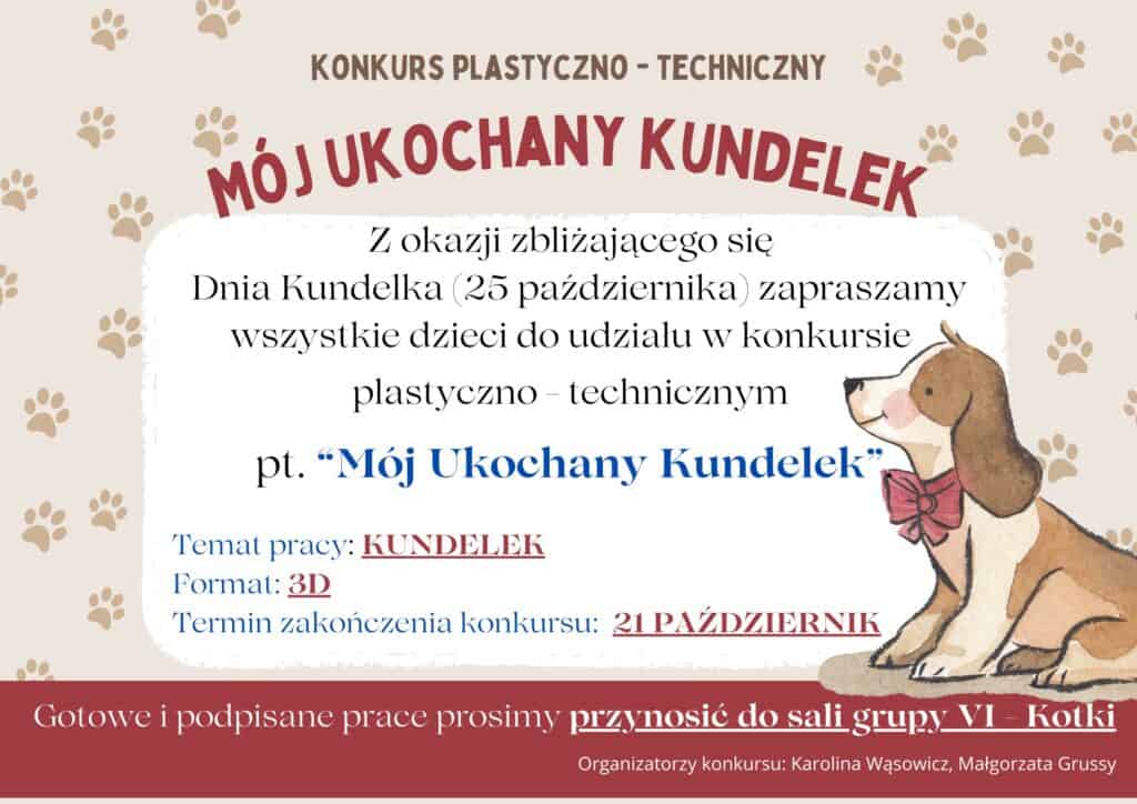 Z okazji zbliżającego się Dnia Kundelka (25 października) zapraszamy wszystkie dzieci do udziału w konkursie plastyczno-technicznym pt. “Mój Ukochany Kundelek”.