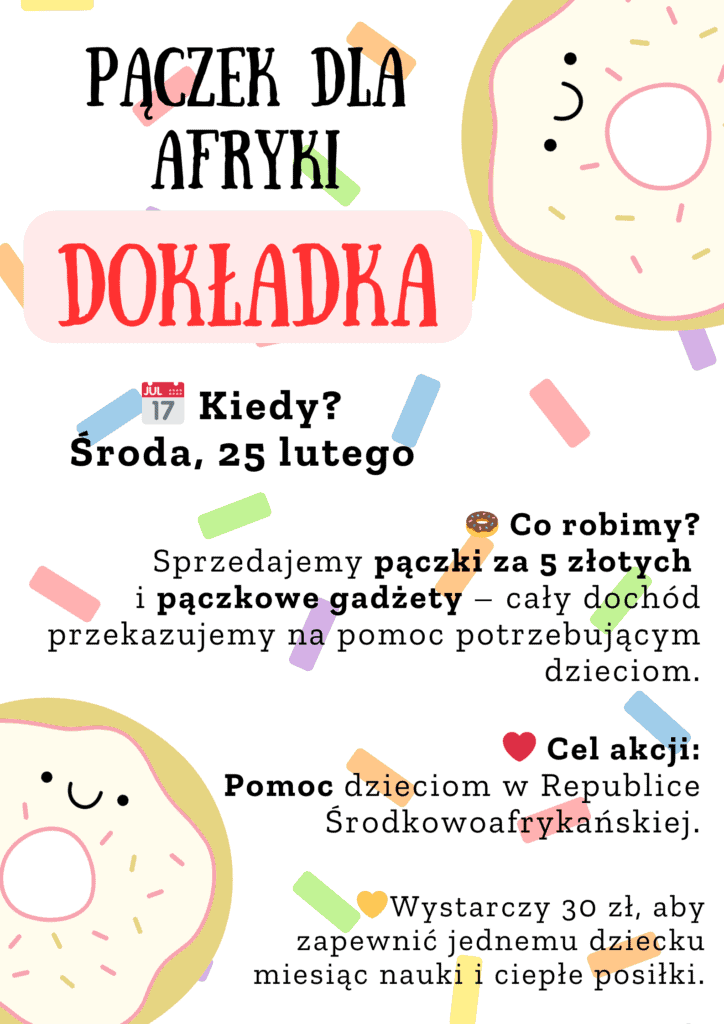 Już w środę, 25 lutego, w naszym przedszkolu odbędzie DOKŁADKA charytatywnej akcji „Pączek dla Afryki”, organizowana we współpracy z misjonarzami Kapucynami. Tego dnia będzie można kupić pyszne pączki w cenie 5 zł oraz pączkowe gadżety i w prosty sposób włączyć się w pomoc potrzebującym dzieciom. Zachęcamy całą społeczność przedszkola do włączenia się w akcję i wspólnego czynienia dobra!