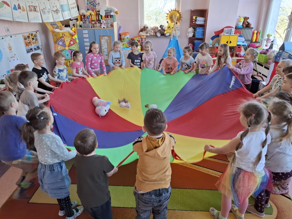 Dużo radości dały dzieciom zabawy sensoryczne z wykorzystaniem światła pod kierunkiem pani psycholog – Pani Asi, zabawy ze wstążkami podczas rytmiki oraz wesołe zabawy na świeżym powietrzu.
