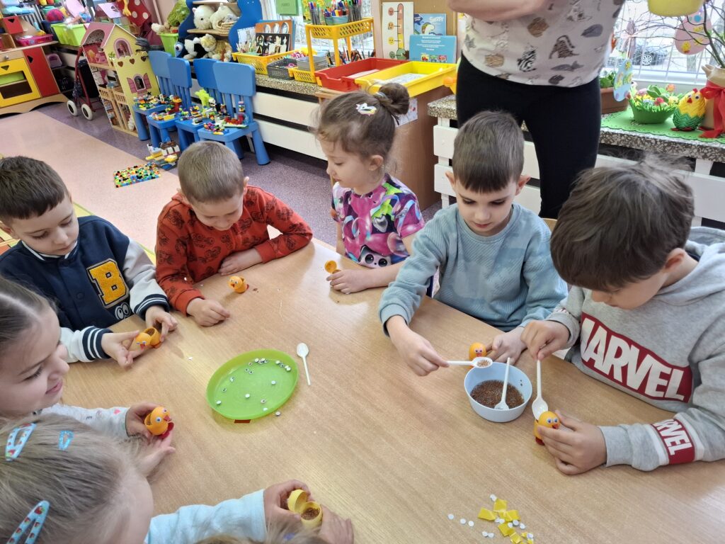 W tym czasie nie zabrakło wesołych zajączkowych zabaw ćwiczących u dzieci spostrzegawczość i pracę rąk.