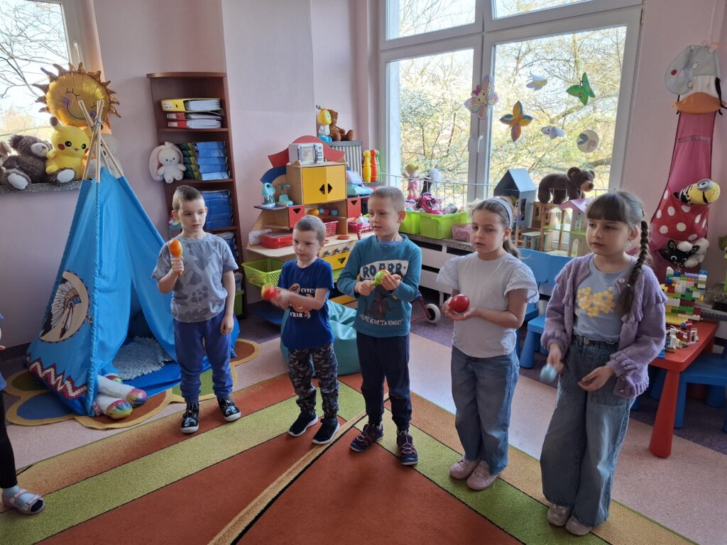 Dużo radości dały dzieciom zabawy sensoryczne z wykorzystaniem światła pod kierunkiem pani psycholog – Pani Asi, zabawy ze wstążkami podczas rytmiki oraz wesołe zabawy na świeżym powietrzu.