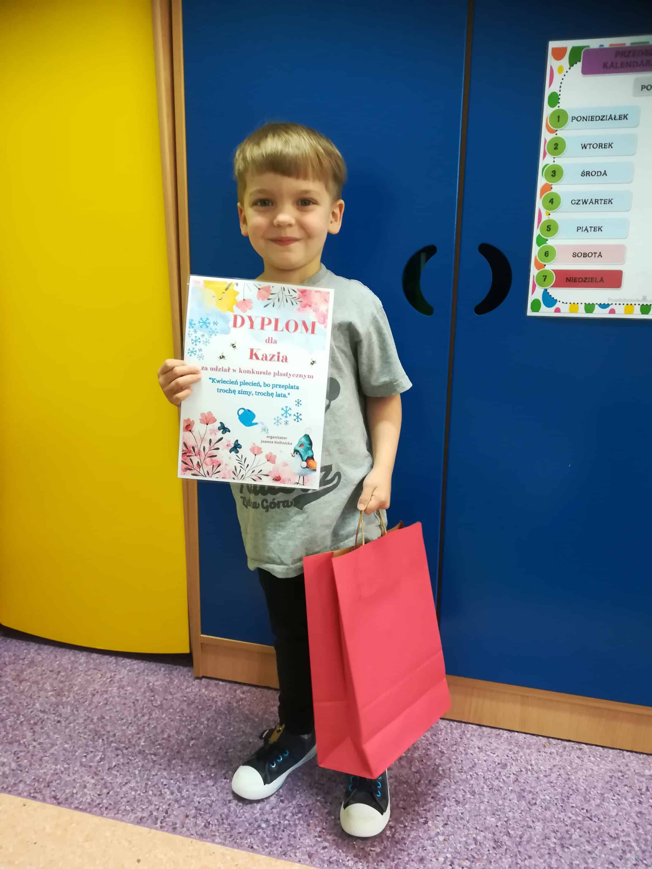 Laureaci konkursu plastycznego „Kwiecień plecień, bo przeplata trochę zimy, trochę lata”. Gratuluję i dziękuję wszystkim dzieciom za udział. Pani Asia