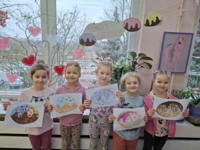 A Tłusty Czwartek? Oczywiście nie zapomnieliśmy o pączkach! Dzieci zajadały się pysznymi pączkami, a razem z panią Gosią przygotowały własne mini pączki, które potem udekorowały i wręczyły pracownikom przedszkola.