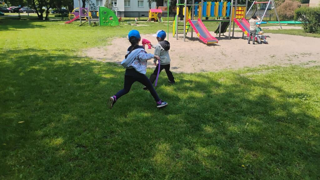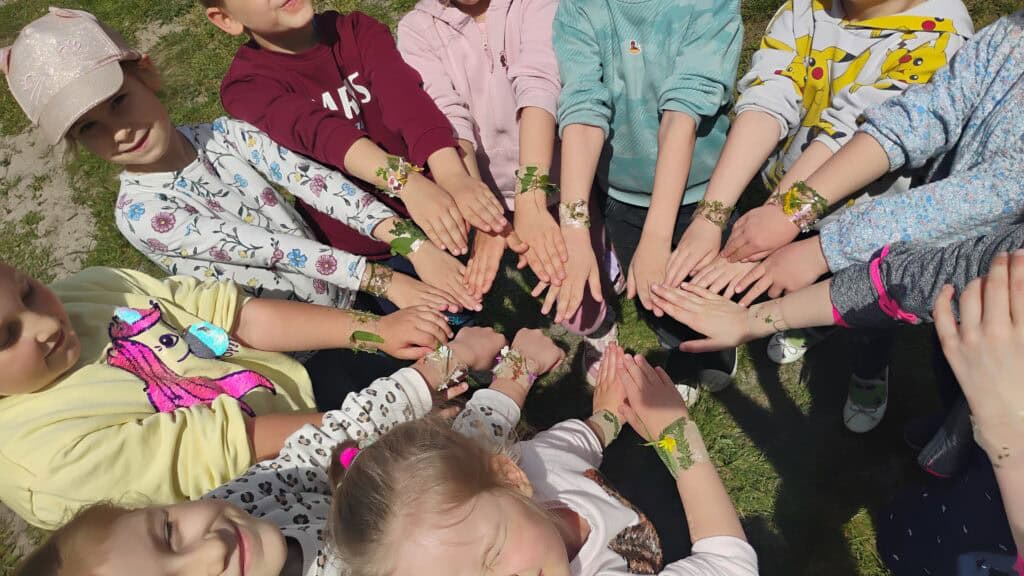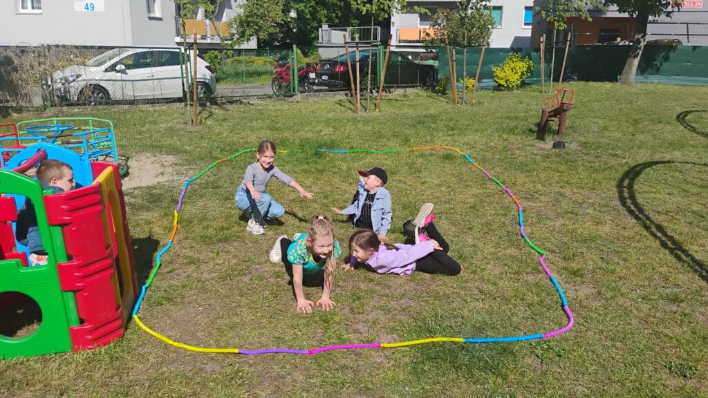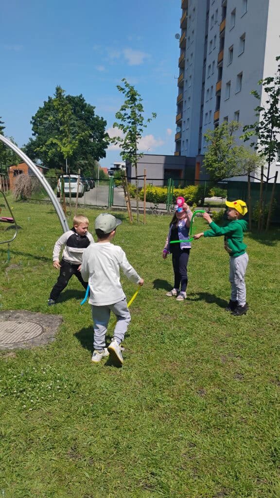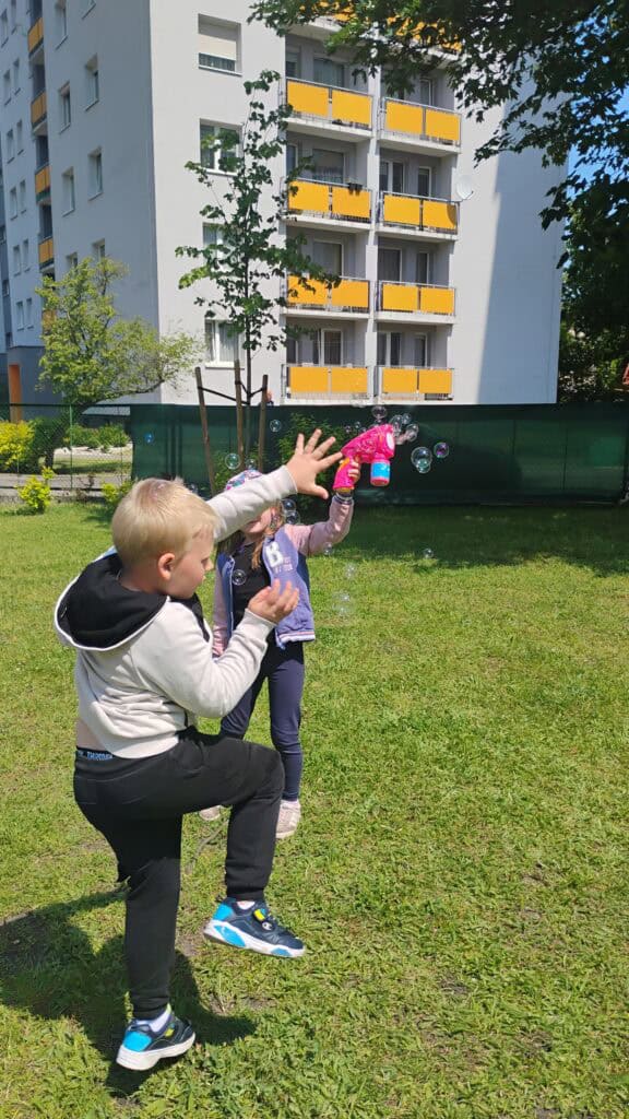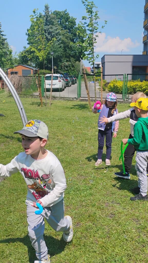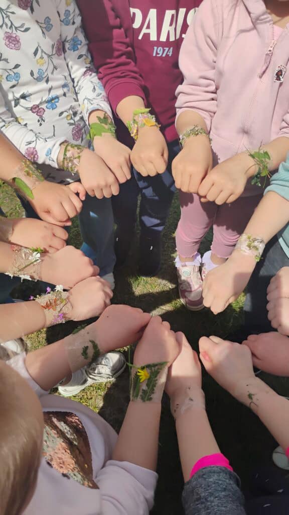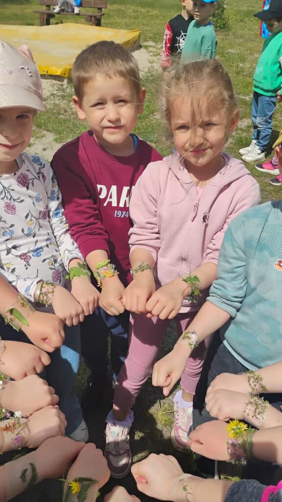 Nie zapomnieliśmy też o zabawach na świeżym powietrzu. Robiliśmy bańki, biegaliśmy z sensorycznymi rurkami, ćwiczyliśmy, szukaliśmy czterolistnej koniczyny i tworzyliśmy naturalne bransoletki z kwiatków i listków.