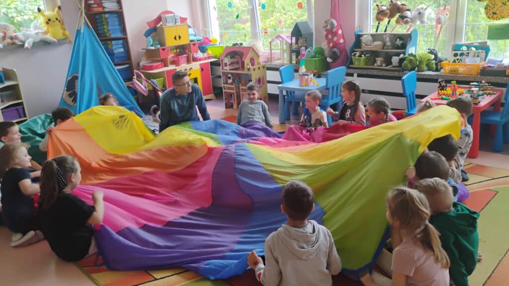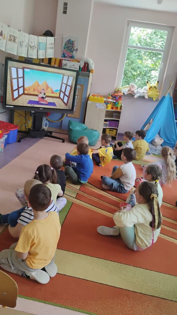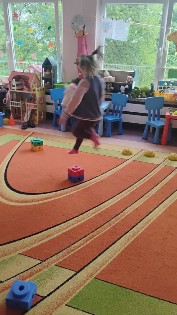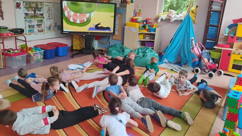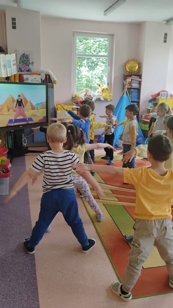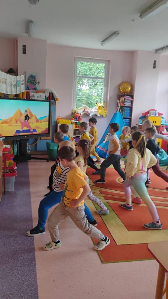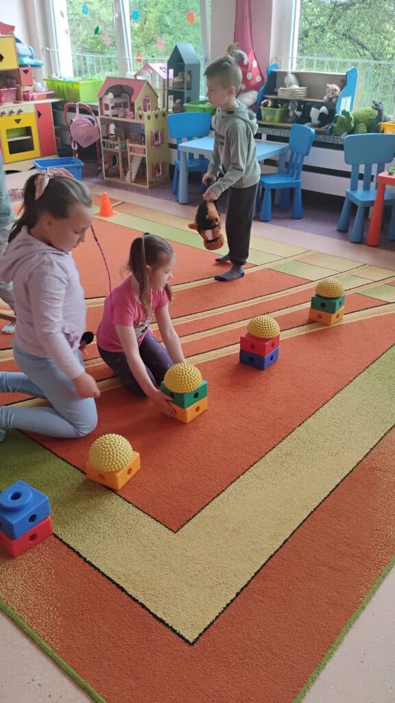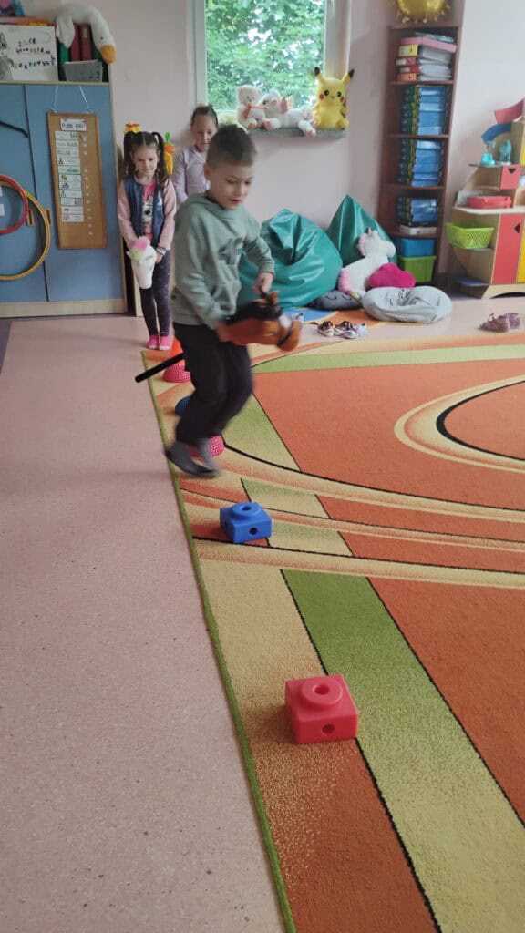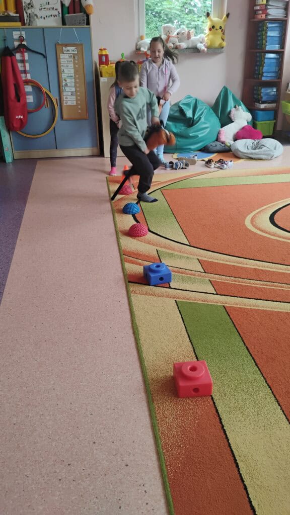 Kiedy pogoda płatała figle, bawiliśmy się w sali – tworzyliśmy własne tory przeszkód, skakaliśmy z konikami i ćwiczyliśmy jogę, którą naprawdę polubiliśmy.