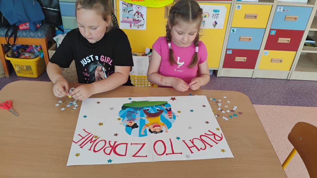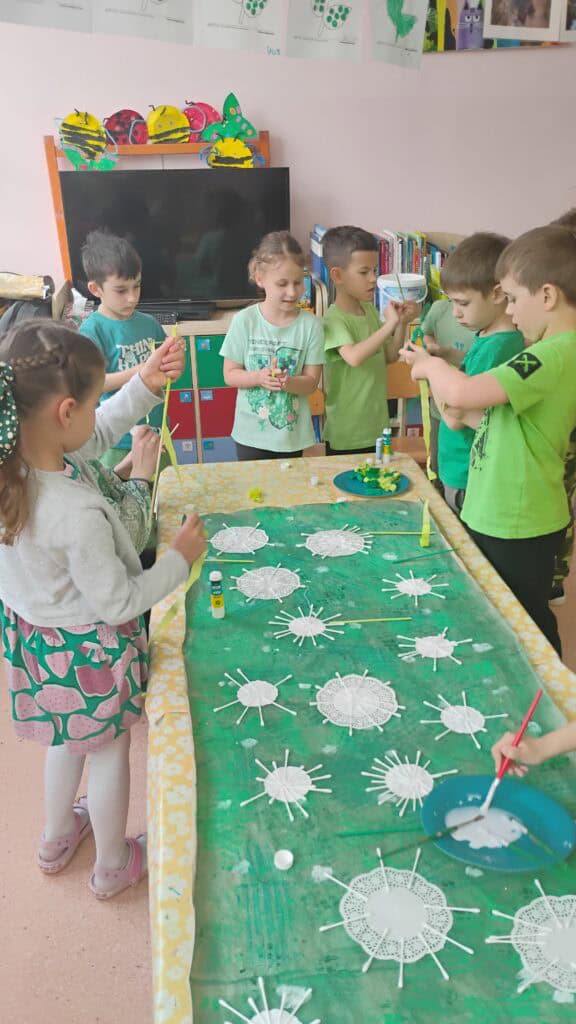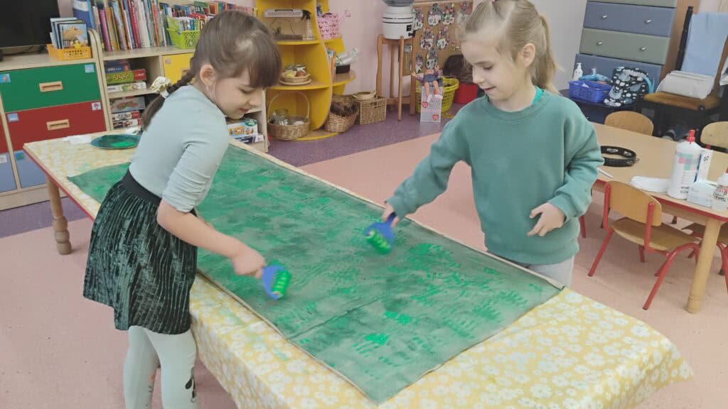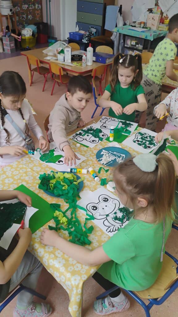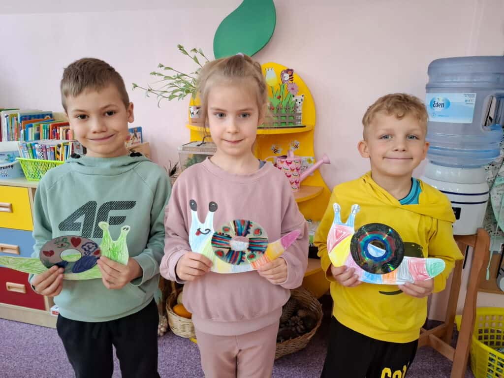 Nasze plastyczne talenty też nie miały majówki! Robiliśmy ślimaczki z błyszczących płyt CD, tworzyliśmy swoje portrety i wspólnie z grupami Żabki i Biedronki stworzyliśmy ogromną, zieloną pracę plastyczną w ramach kolorowej podróży. Było przy tym mnóstwo śmiechu, kleju na palcach i brokatu we włosach.