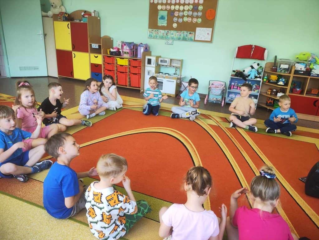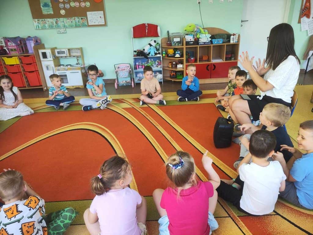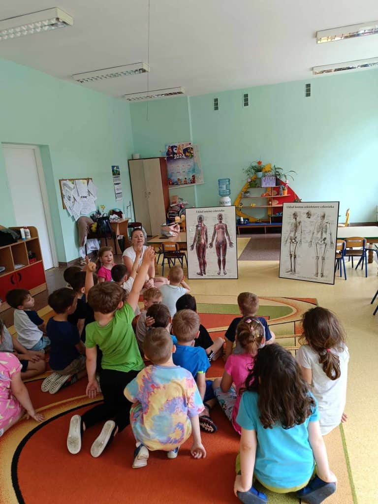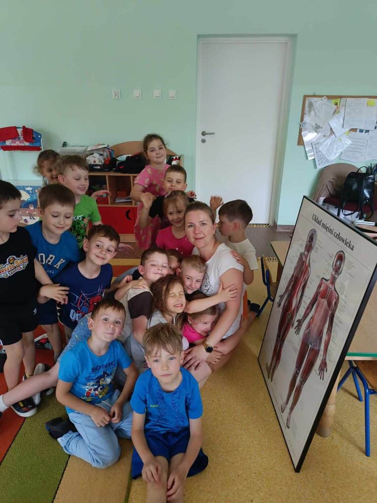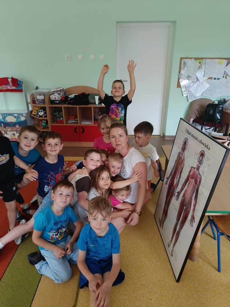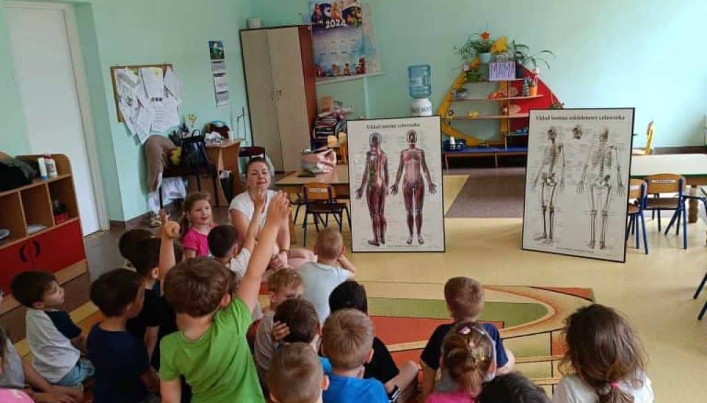 Gdy strumyk płynie z wolna… Cóż to był za maj! W tym miesiącu działo się tak wiele, że Żabki miały prawdziwe “urwanie głowy”. Zaczynając od mamy, która odwiedziła przedszkolaki w sali, idąc przez wycieczkę połączoną z warsztatami, do tego odbyły się urodziny, wyjścia na dwór, a także nauczycielki wymyślały kolejne ciekawe zabawy! A jak się najlepiej uczy? Właśnie przez zabawę! Na samym początku zacznijmy od gościa, a dokładnie rzecz ujmując Mamy Amelki, która odwiedziła nas z ciekawymi zajęciami. Mama Amelki jest fizjoterapeutką i zajmuje się masażem, który przedstawiła nam na własnych ciałach. Pokazała jak masować swoje ręce, by mogły odpocząć po całym dniu rysowania i prób pisania. Nasz gość opowiedział dzieciom również o tym, jak wygląda ciało człowieka, a w sumie to co znajduje się pod skórą i jak to wszystko działa.