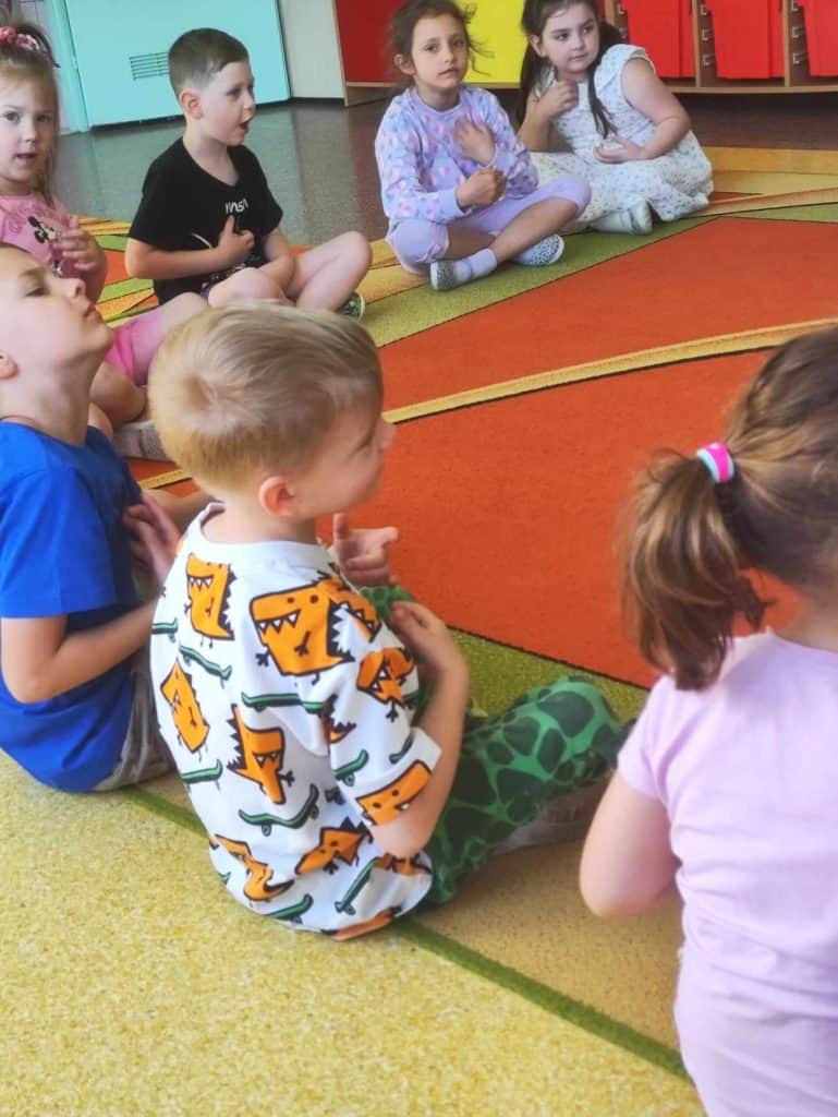 Drugim gościem, który odwiedza nas co miesiąc była Pani zajmująca się i ucząca nas języka migowego. Żabki migają piosenki i wybrane słowa w zachwycający sposób, bardzo szybko opanowując kolejne gesty.