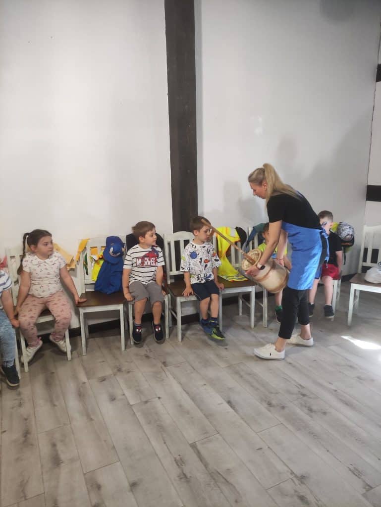 Następną atrakcją było wyjście na warsztaty „Masło i… maślanka z maśniczki do dzbanka” w Skansenie w Ochli. Oczywiście, żeby dotrzeć na te warsztaty wybraliśmy autobus MZK, a to – jak się okazało – było największą przygodą! Nikomu nie przeszkadzał brak miejsca siedzącego, a wręcz przeciwnie – zabawa jakiej dzieci doświadczyły trzymając się kurczowo poręczy i ćwicząc swoją równowagę była przednia! Na warsztatach przedszkolaki dowiedziały się jak wytwarza się masło i mogły go spróbować na chlebie. Każdy prosił o dokładkę zachwycając się smakiem śmietankowego masła własnego wytwórstwa. Jeszcze raz bardzo dziękujemy mamie Igi za pomoc!