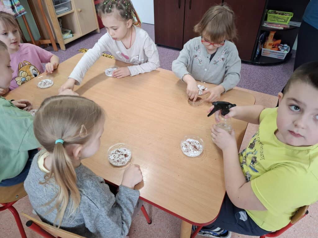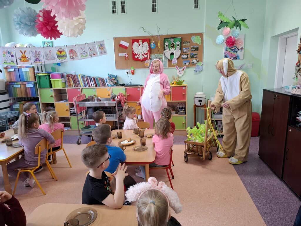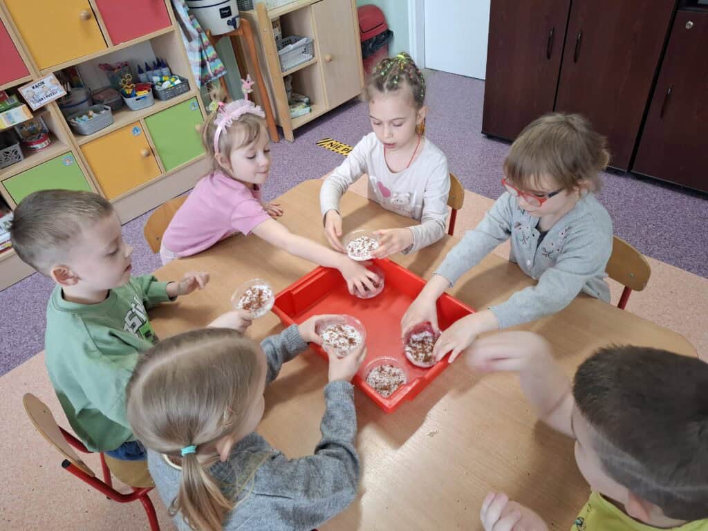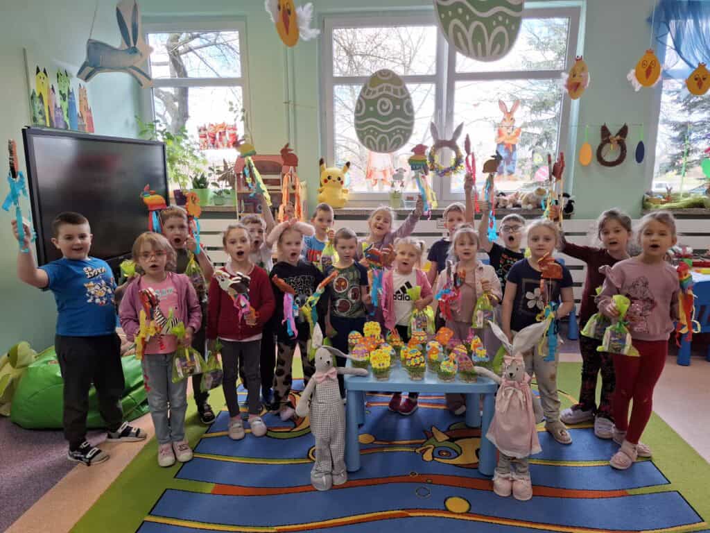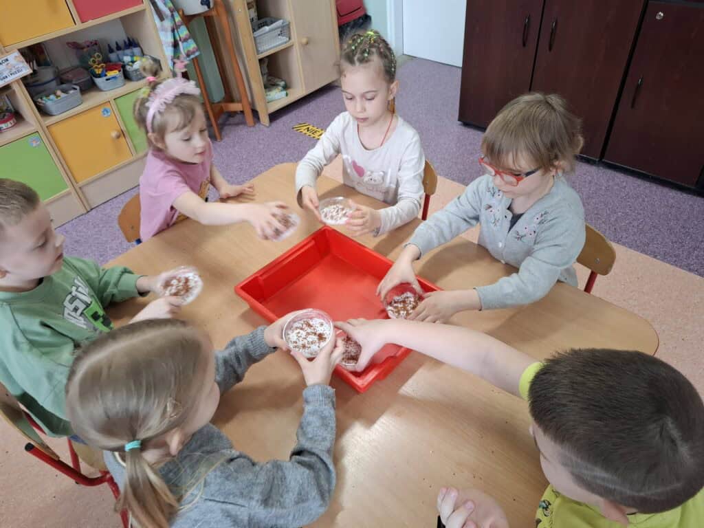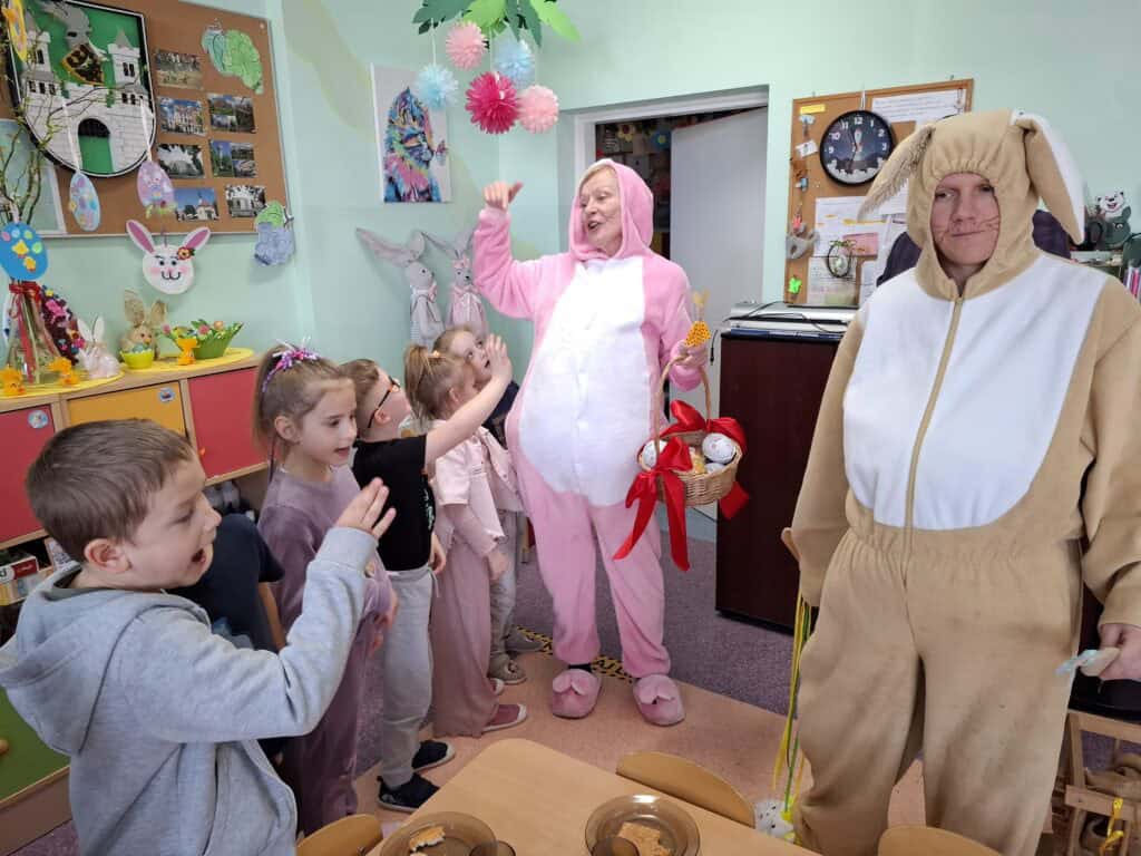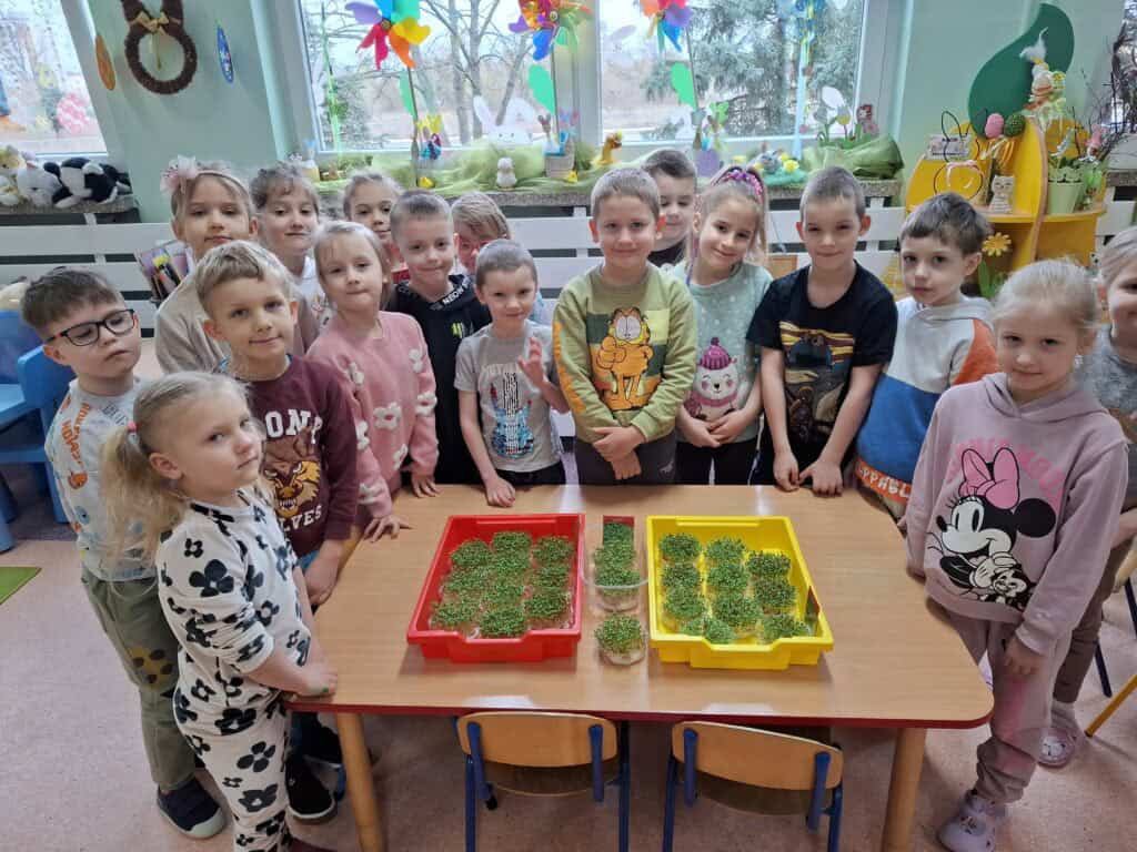Koniec marca spędziliśmy na obserwacji przyrody, czy rzeczywiście przyszła już Wiosna oraz na przygotowaniach do Świąt Wielkanocnych. Pięknie udekorowaliśmy naszą salę oraz przygotowaliśmy niespodziankę dla naszych rodziców. Na początku posialiśmy rzeżuchę w pojemnikach i opiekowaliśmy się nią dobrze, bo wspaniale wyrosła. Po czym przystroiliśmy pojemniczki świątecznymi dekoracjami i już niespodzianka wielkanocna była gotowa. Wesołym świątecznym akcentem dla wszystkich dzieci były odwiedziny Zajączków, które przyniosły im słodkie niespodzianki.