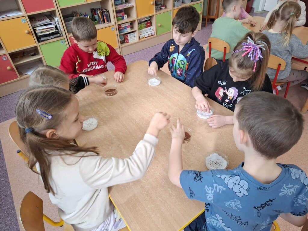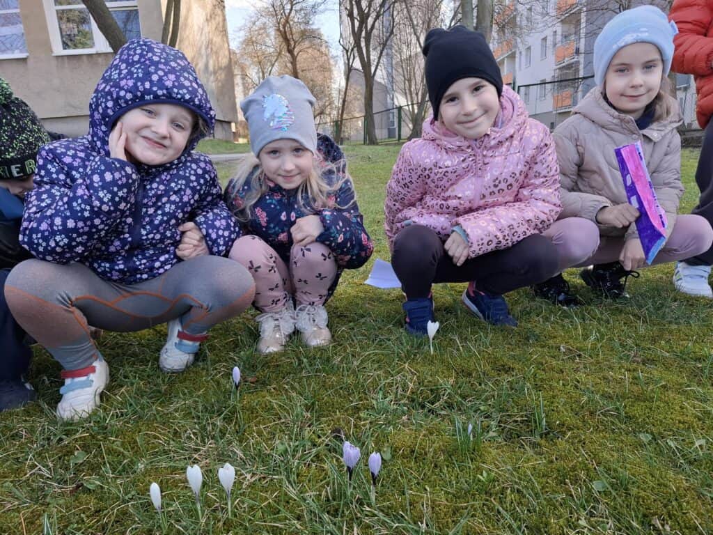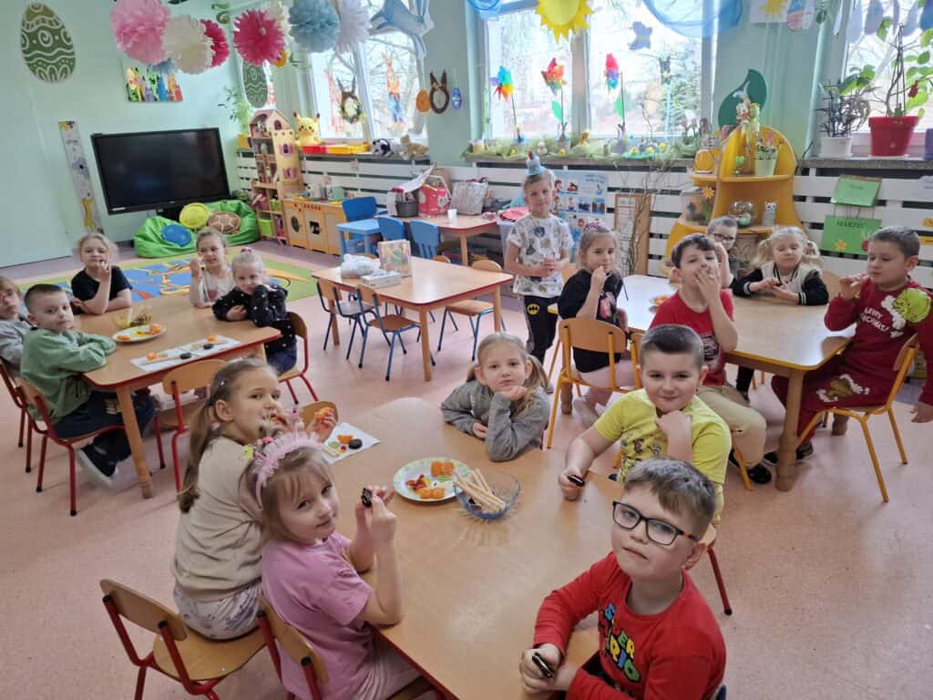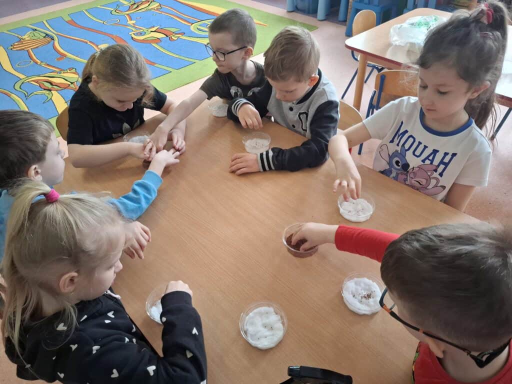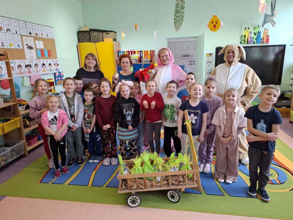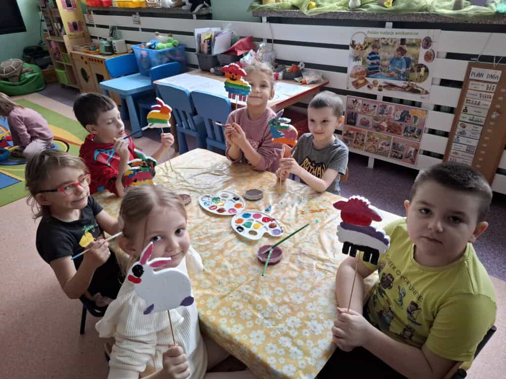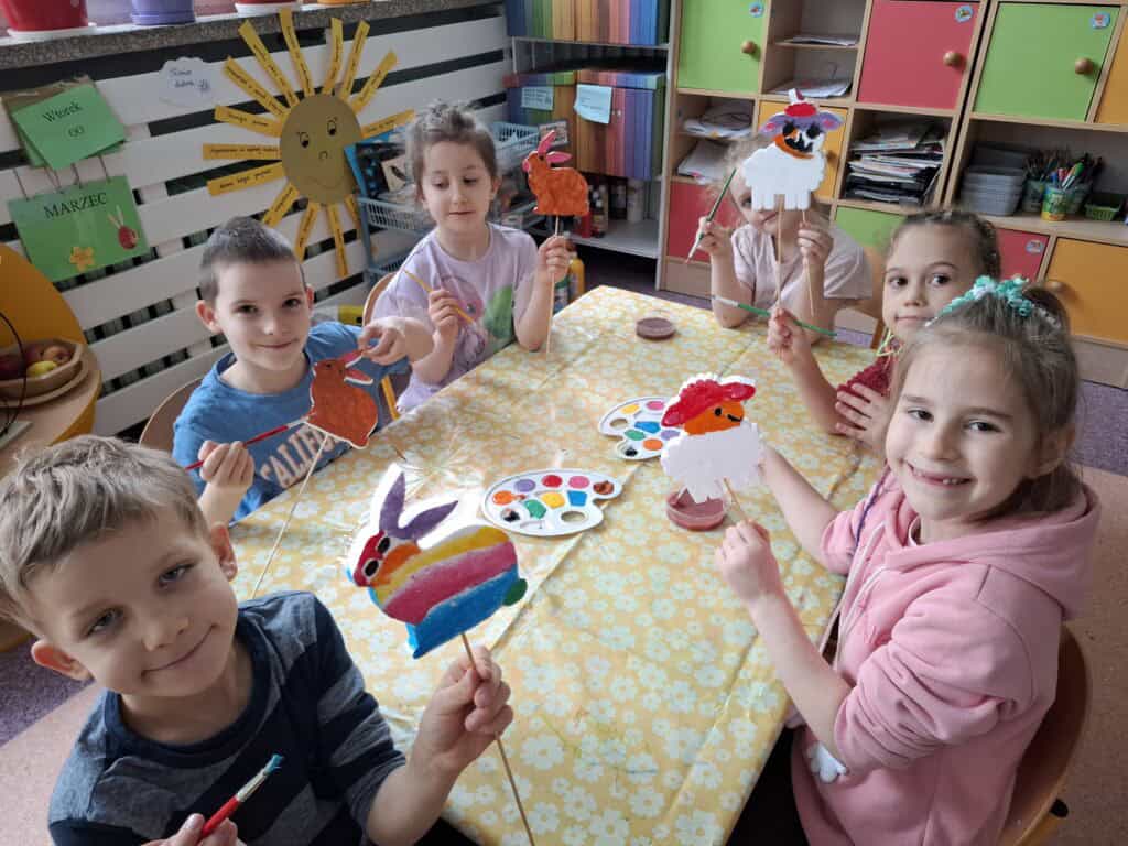 Koniec marca spędziliśmy na obserwacji przyrody, czy rzeczywiście przyszła już Wiosna oraz na przygotowaniach do Świąt Wielkanocnych. Pięknie udekorowaliśmy naszą salę oraz przygotowaliśmy niespodziankę dla naszych rodziców. Na początku posialiśmy rzeżuchę w pojemnikach i opiekowaliśmy się nią dobrze, bo wspaniale wyrosła. Po czym przystroiliśmy pojemniczki świątecznymi dekoracjami i już niespodzianka wielkanocna była gotowa. Wesołym świątecznym akcentem dla wszystkich dzieci były odwiedziny Zajączków, które przyniosły im słodkie niespodzianki.