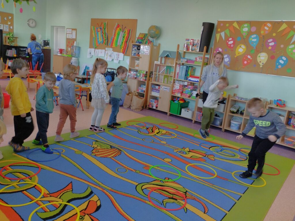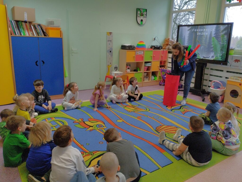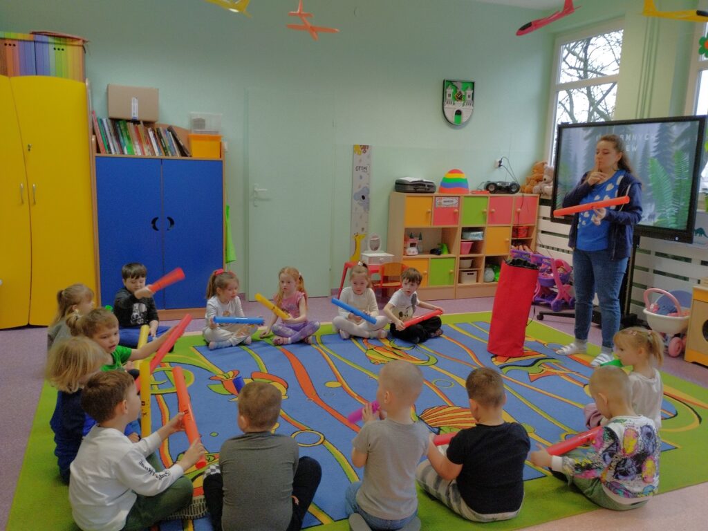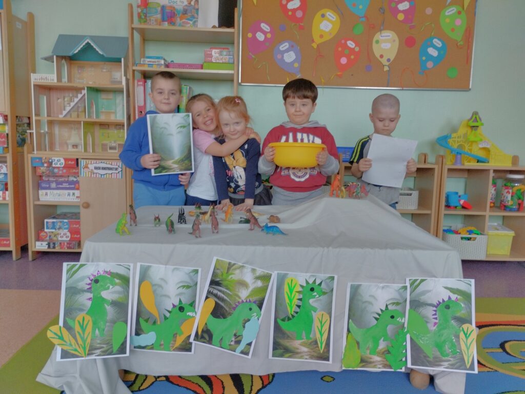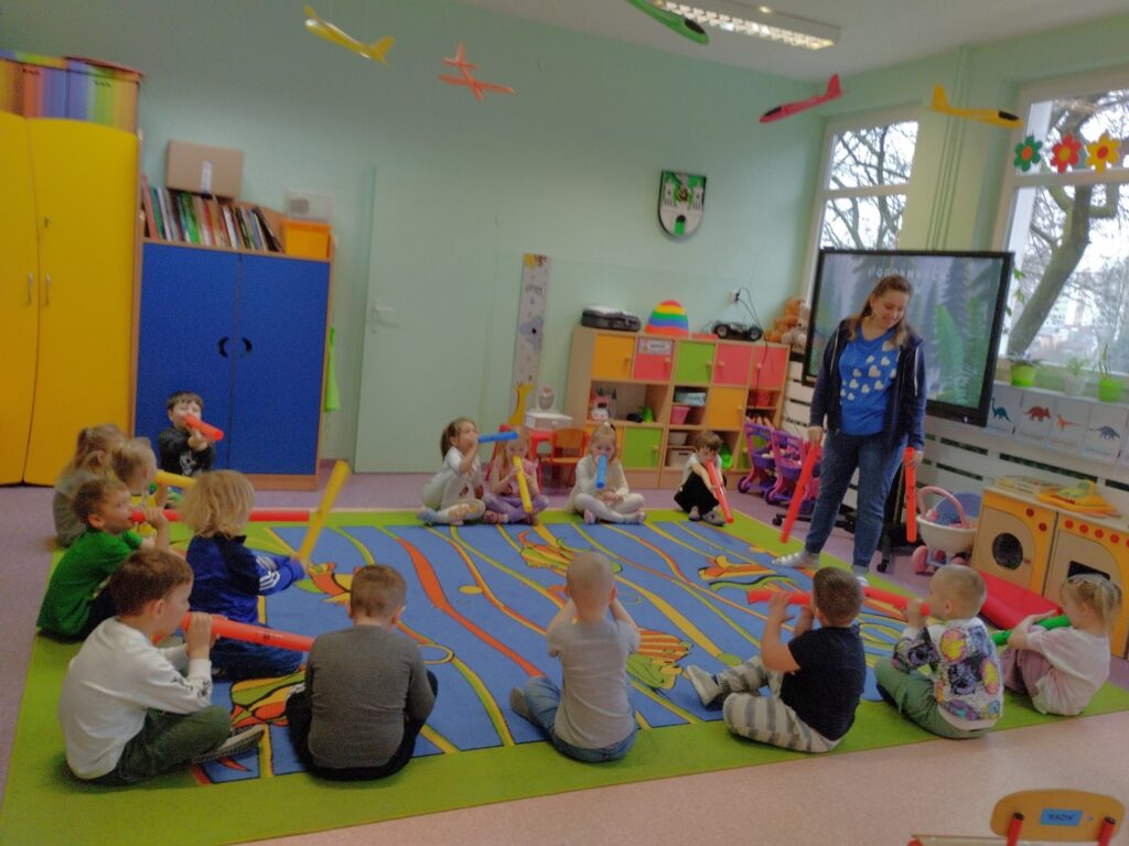 Dodatkowo, dzięki wizycie naszej Pani psycholog, która przyniosła tajemnicze instrumenty – bum bum rurki, dzieci miały okazję odkryć ich niezwykłe brzmienie. Bum bum rurki to kolorowe, muzyczne tuby, które wydają dźwięki o różnych wysokościach w zależności od długości. Podczas zabawy dzieci uderzały nimi o podłogę, tworząc dźwięki przypominające kroki dinozaurów. Było to niezwykle ciekawe i angażujące doświadczenie, które połączyło naukę z muzyczną zabawą.