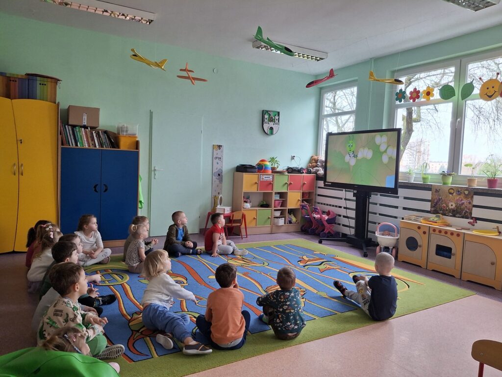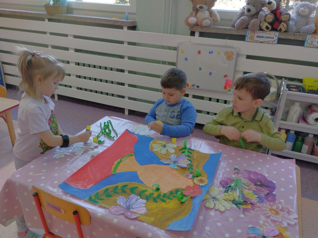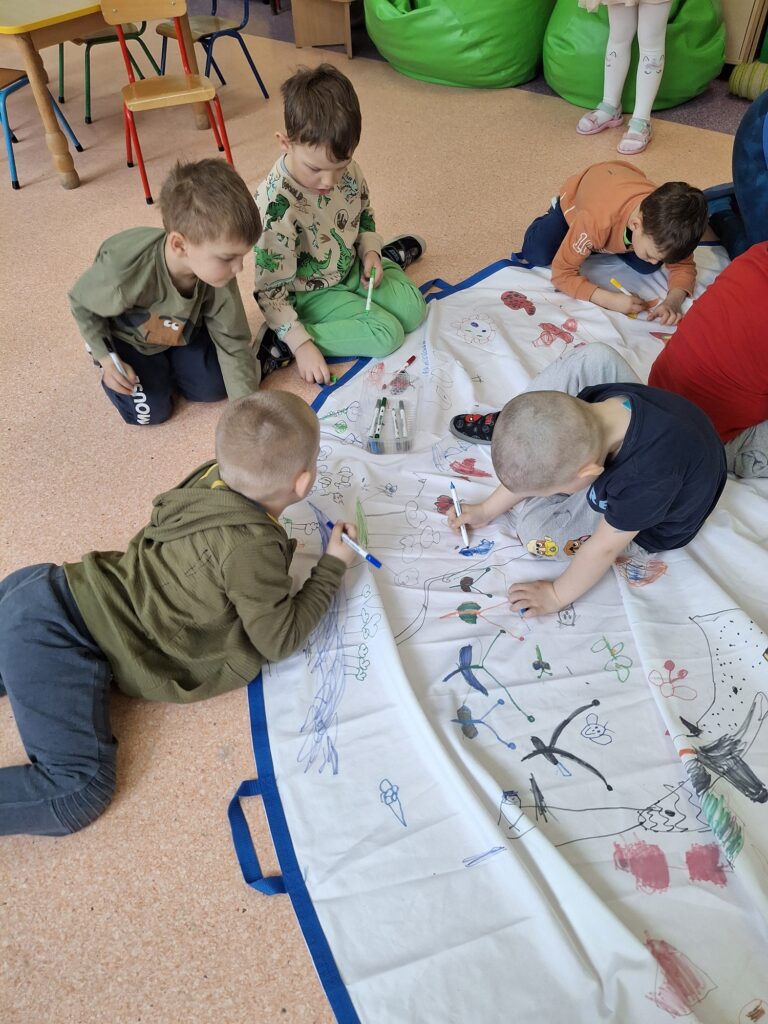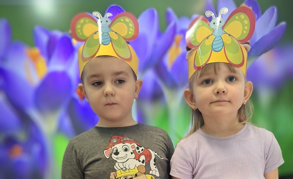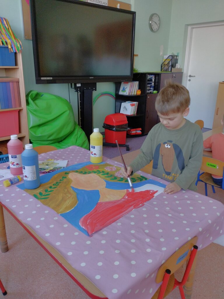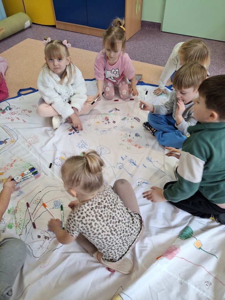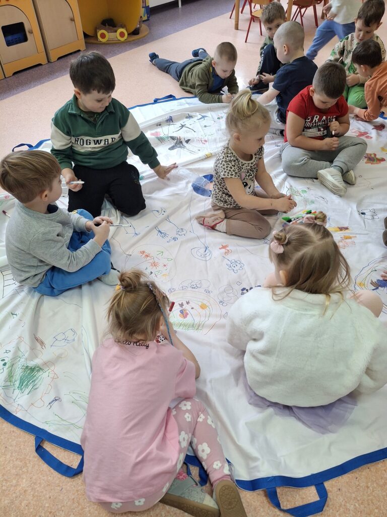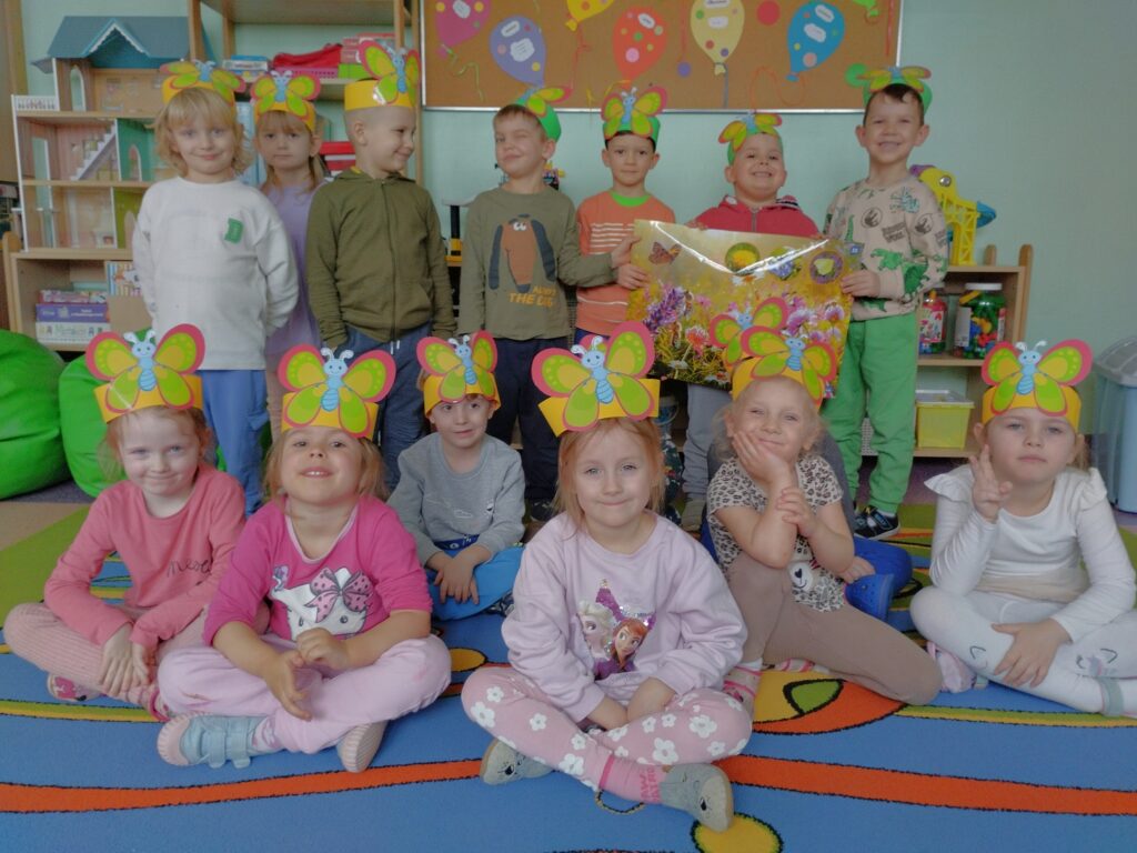 Kolejnym radosnym wydarzeniem był Dzień Motyla, który świętowaliśmy w naszej grupie w wyjątkowy sposób – w końcu jesteśmy Motylkami! Dzieci miały okazję dowiedzieć się, jak powstaje motyl i jakie etapy musi przejść – od małego jajeczka, przez gąsienicę, aż po pięknego, kolorowego owada. Następnie przedszkolaki z radością malowały wspaniałą łąkę na dużej macie do kolorowania, na której fruwały kolorowe motyle.
