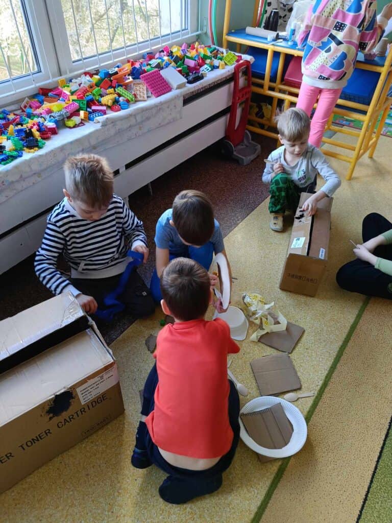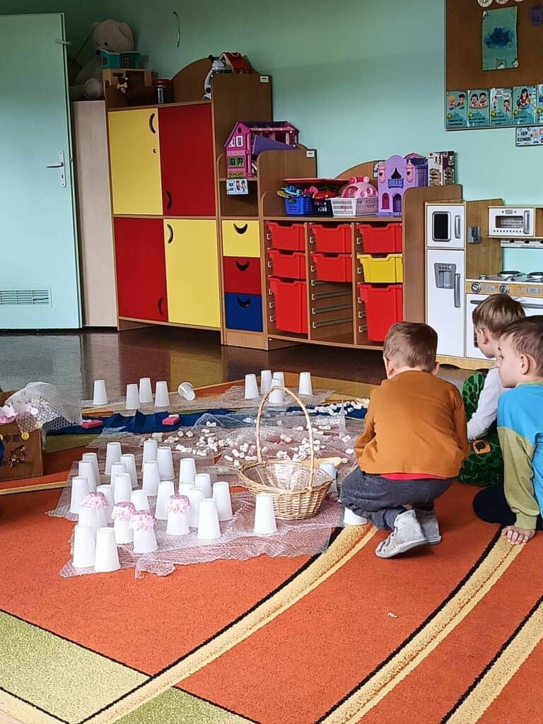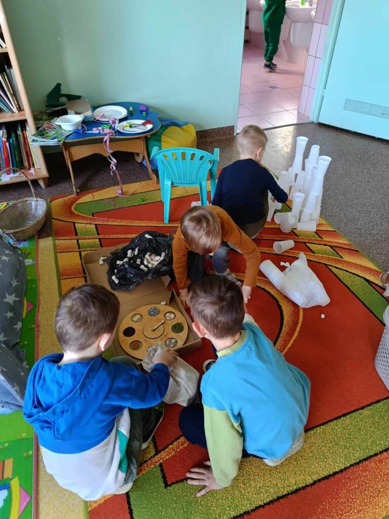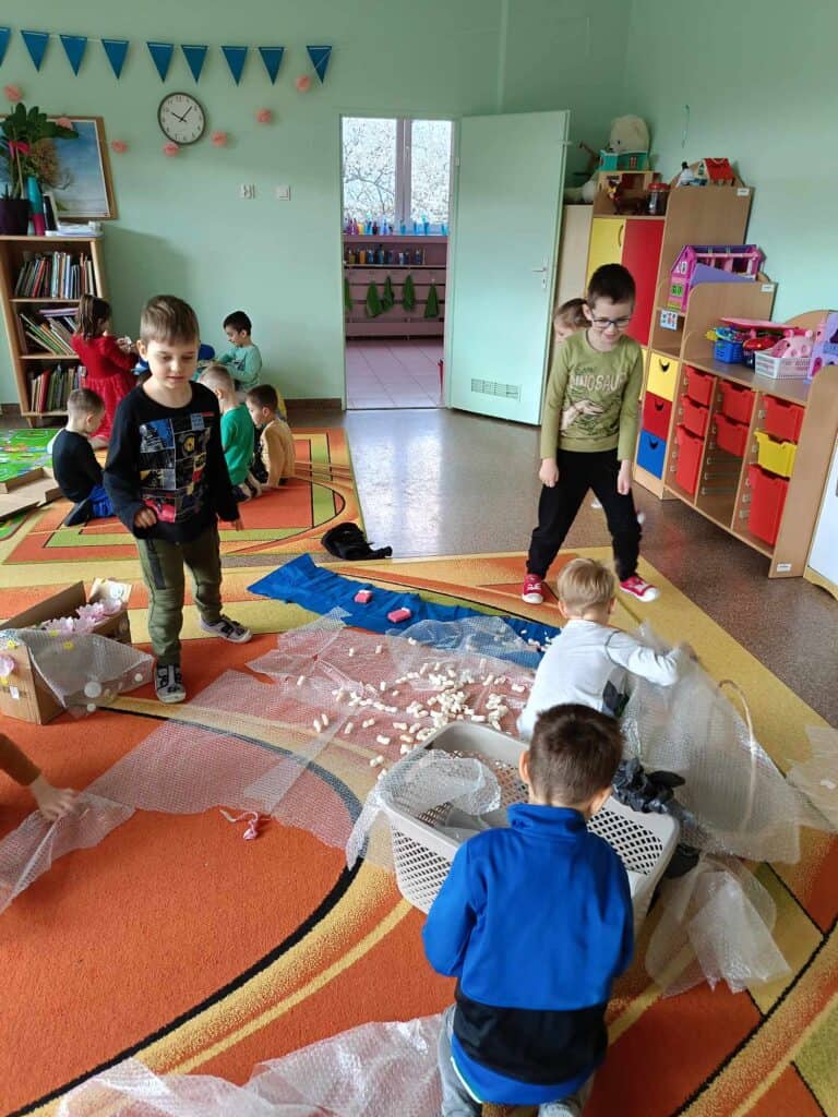 W oczekiwaniu na Panią Wiosnę, Nauczycielka przygotowała dla dzieci “Dzień bez zabawek”, który odbył się w ramach Dnia Recyklingu. Nikt nie korzystał z typowych zabawek, a wszystkie zostały zamienione na te z recyklingu. Żabki bawiły się folią, kubeczkami, kartonami, kuleczkami, gazetami i innymi rzeczami.