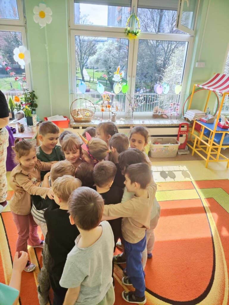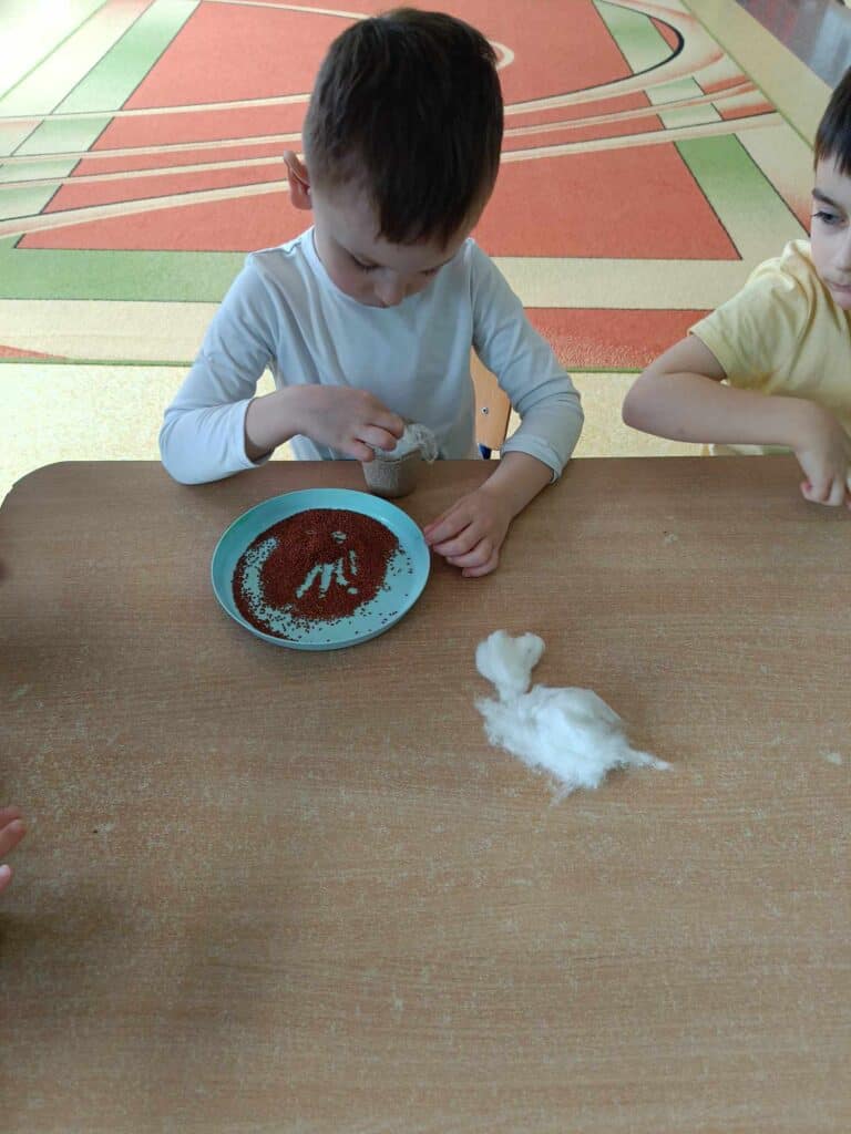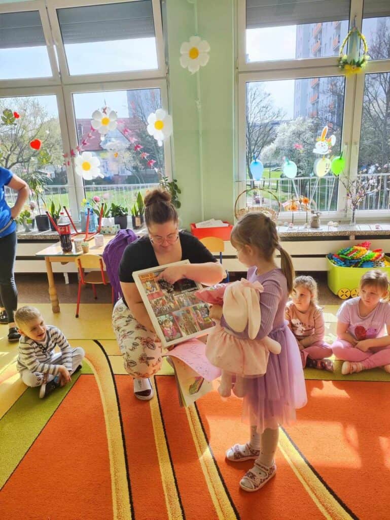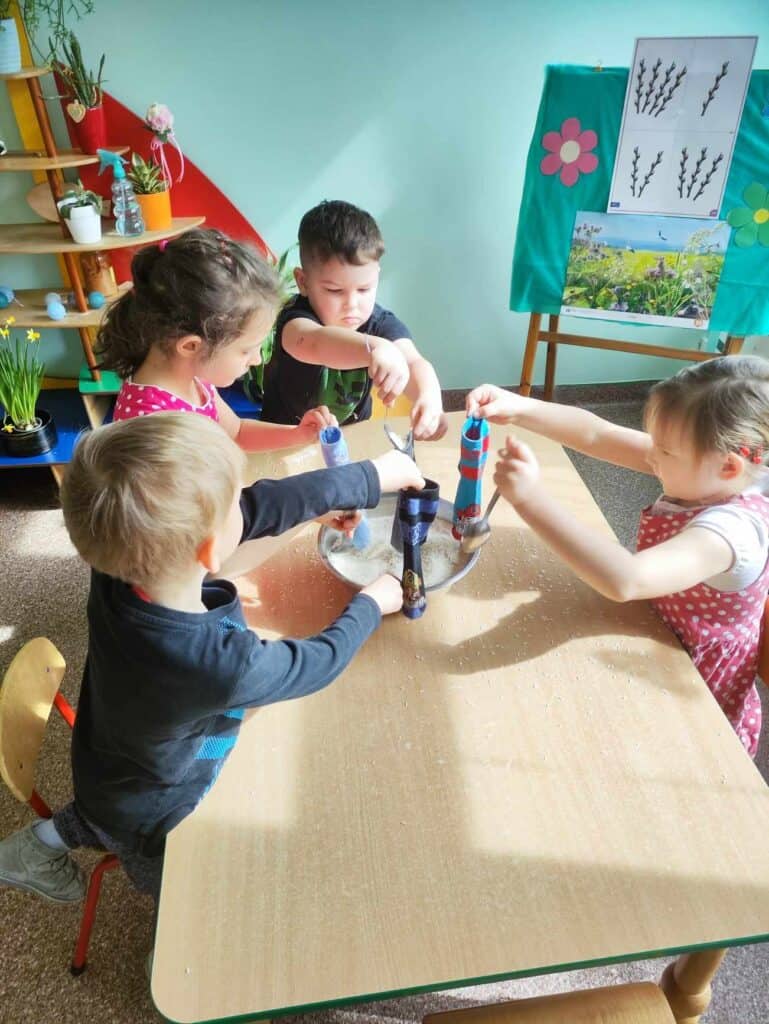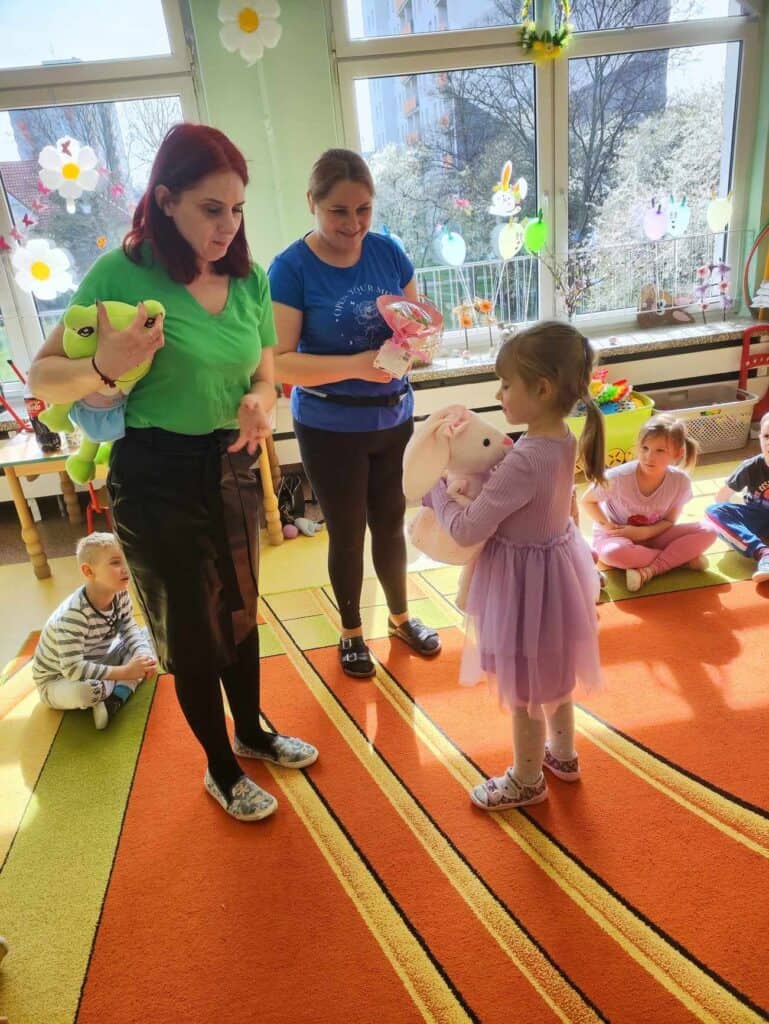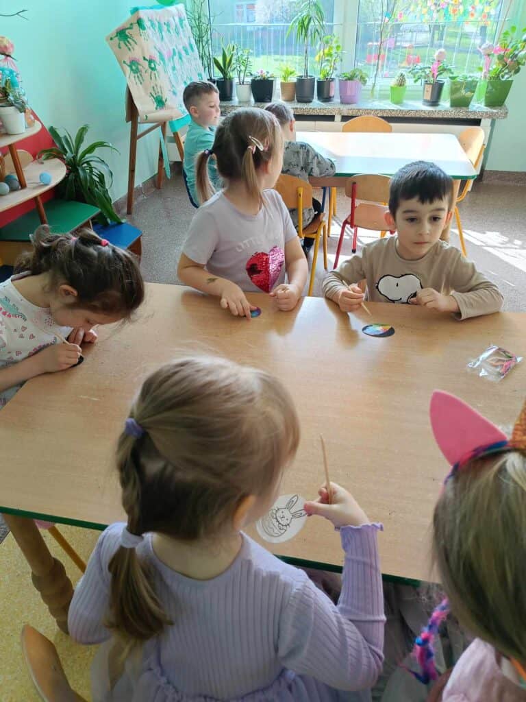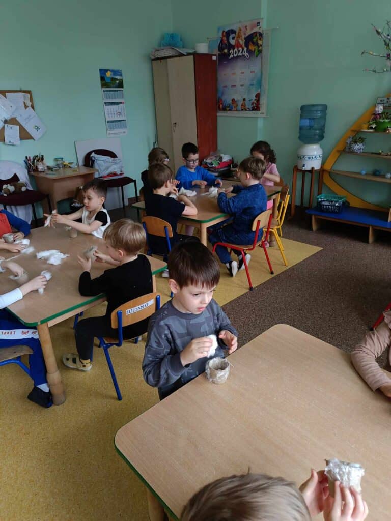 Razem z wiosną zbliżały się święta Wielkiejnocy, a co za tym szło – Żabki odwiedziła BańkoUla przebrana za nikogo innego jak Zająca Wielkanocnego! Przygotowała dla przedszkolaków warsztaty kreatywne, gdzie były malowane jajka, tańce i zabawy z bańkami. Na tym dziecięce przygotowania do Świąt się nie skończyły. Przedszkolaki wraz z Nauczycielkami zasiały rzeżuchę, a także zrobiły swoje własne ryżowe zające.
