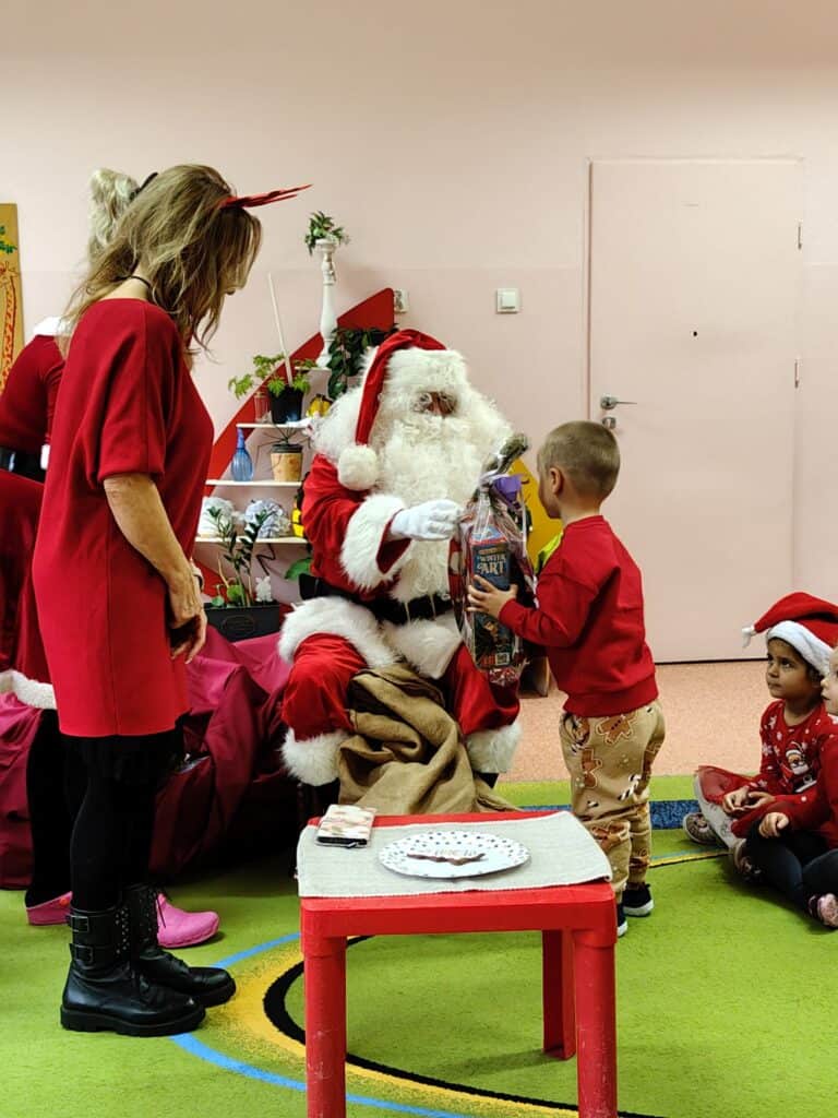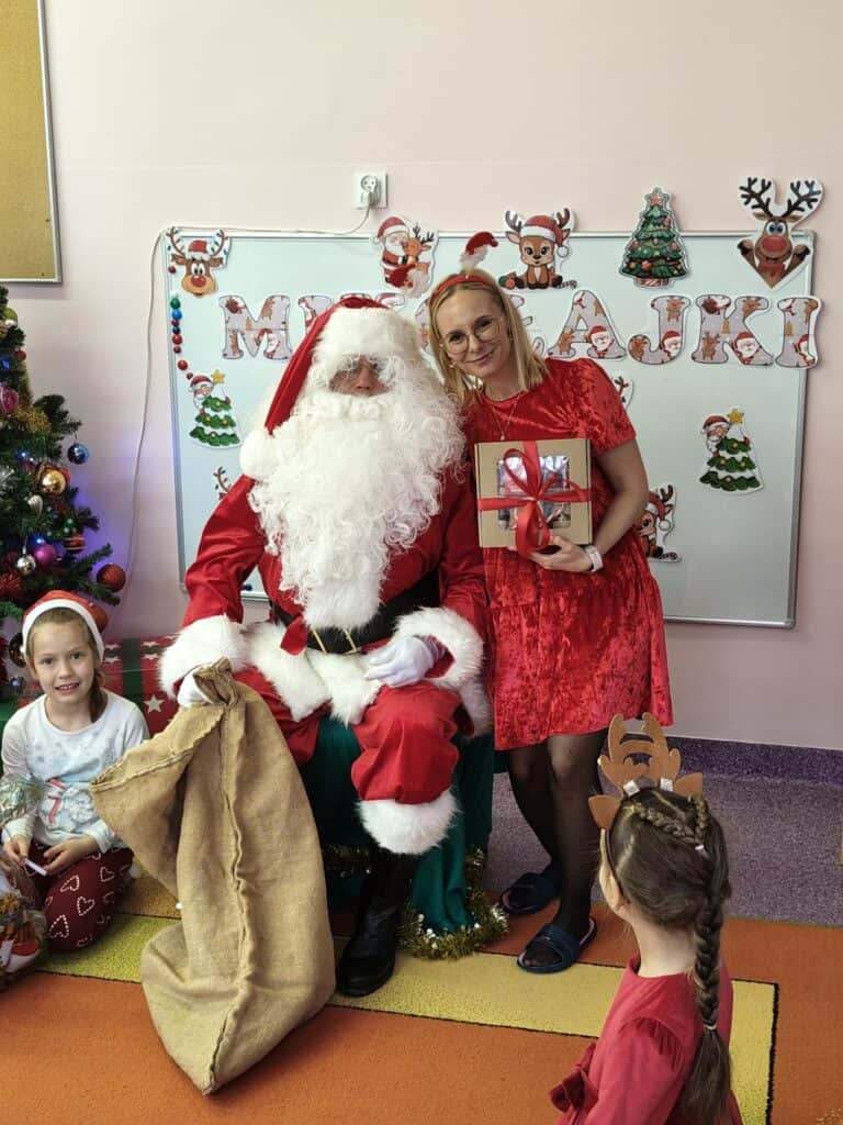 Na koniec Mikołaj wraz ze swoim przyjacielem – Motomyszą z Falubazu – tańczyli i bawili się razem z wszystkimi dziećmi przy dźwiękach świątecznych piosenek. W przedszkolu panowała radość, śmiech i magia, jaką można poczuć tylko w grudniu. Ten wyjątkowy Gość nie zapomniał również o naszych wspaniałych pracownikach! Oni również byli bardzo grzeczni przez cały rok, dlatego i im Mikołaj zostawił słodkie upominki. To był dzień pełen wrażeń, niespodzianek i przedświątecznej atmosfery dla wszystkich! Już nie możemy doczekać się przyszłorocznych odwiedzin!