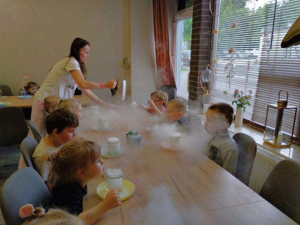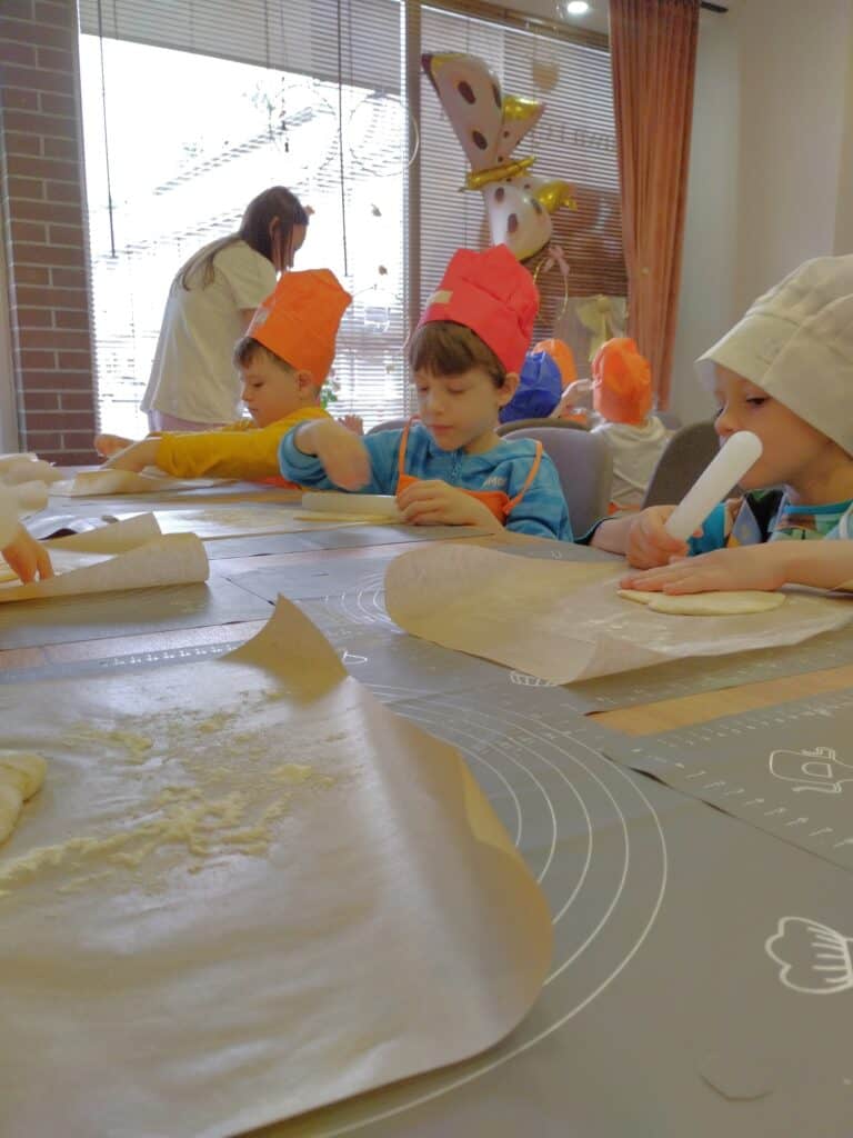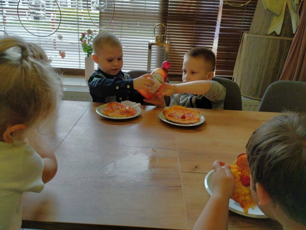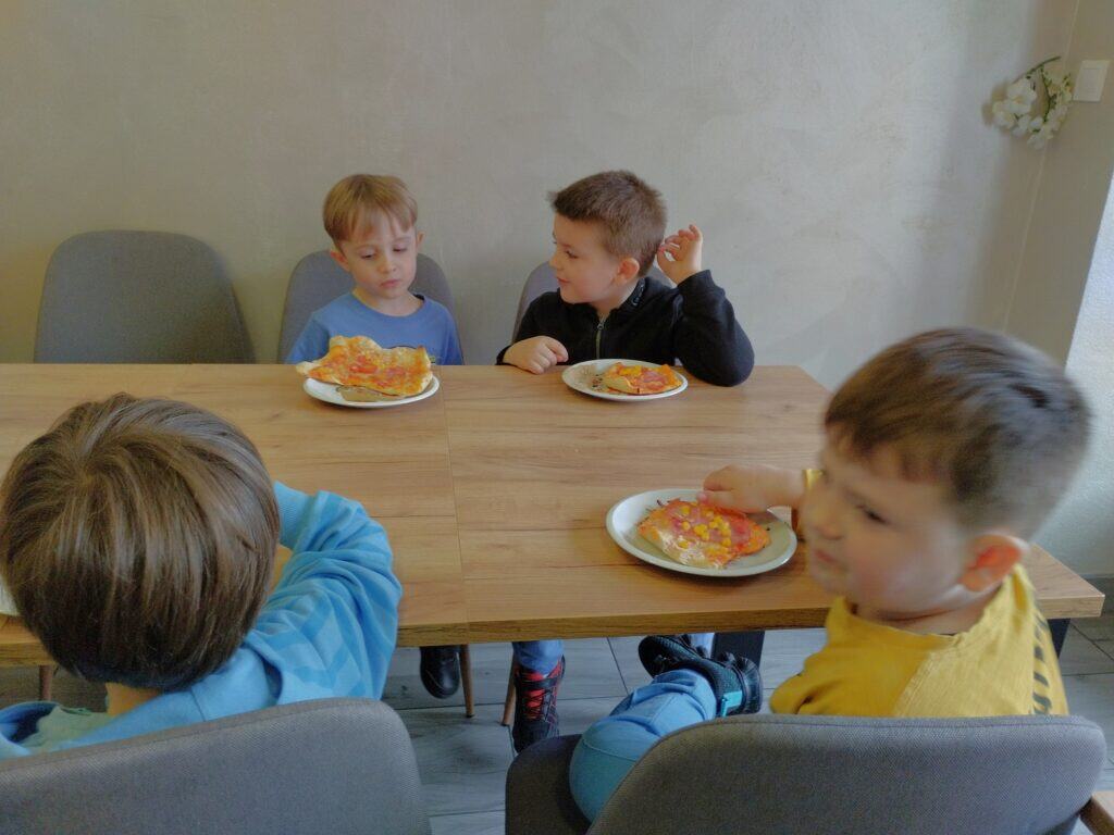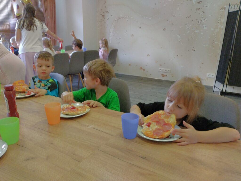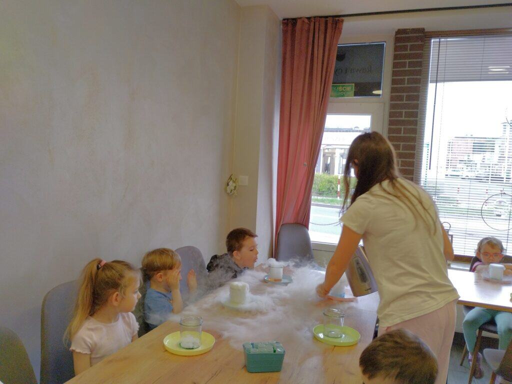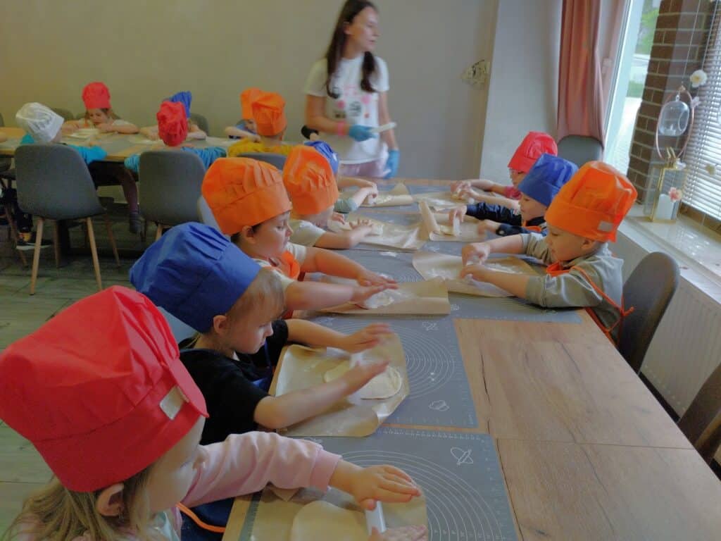 Pierwszym i najważniejszym wydarzeniem w czerwcu był wyjątkowy Dzień Dziecka. Z tej okazji wybraliśmy się na warsztaty do pracowni „Kawa i Cynamon”, gdzie na dzieci czekały fartuszki i czapki kucharskie. Zadaniem Motylków było przygotowanie swojej ulubionej pizzy – wałkowali więc ciasto i dodawali ulubione składniki, niczym w prawdziwej włoskiej pizzerii. Niektórzy odkryli w sobie kulinarne talenty. Kiedy pizze trafiły do pieca, na dzieci czekała niespodzianka. Miały okazję obserwować eksperymenty z suchym lodem – zobaczcie na zdjęciach, jak wielką frajdę sprawiła im ta atrakcja.