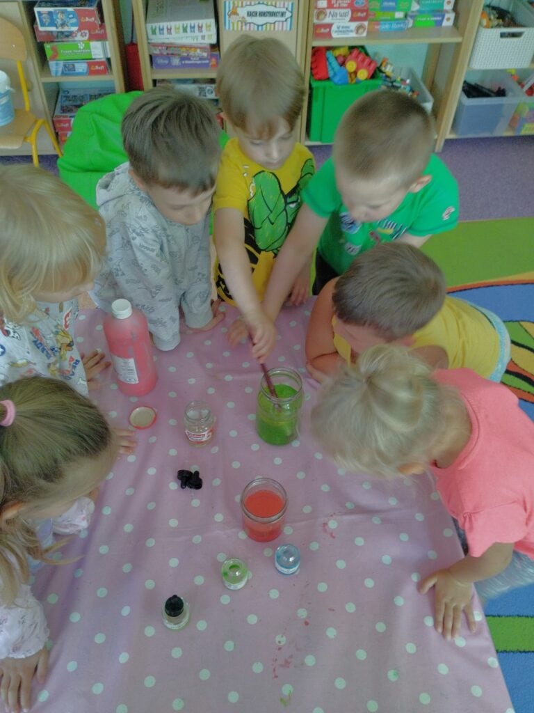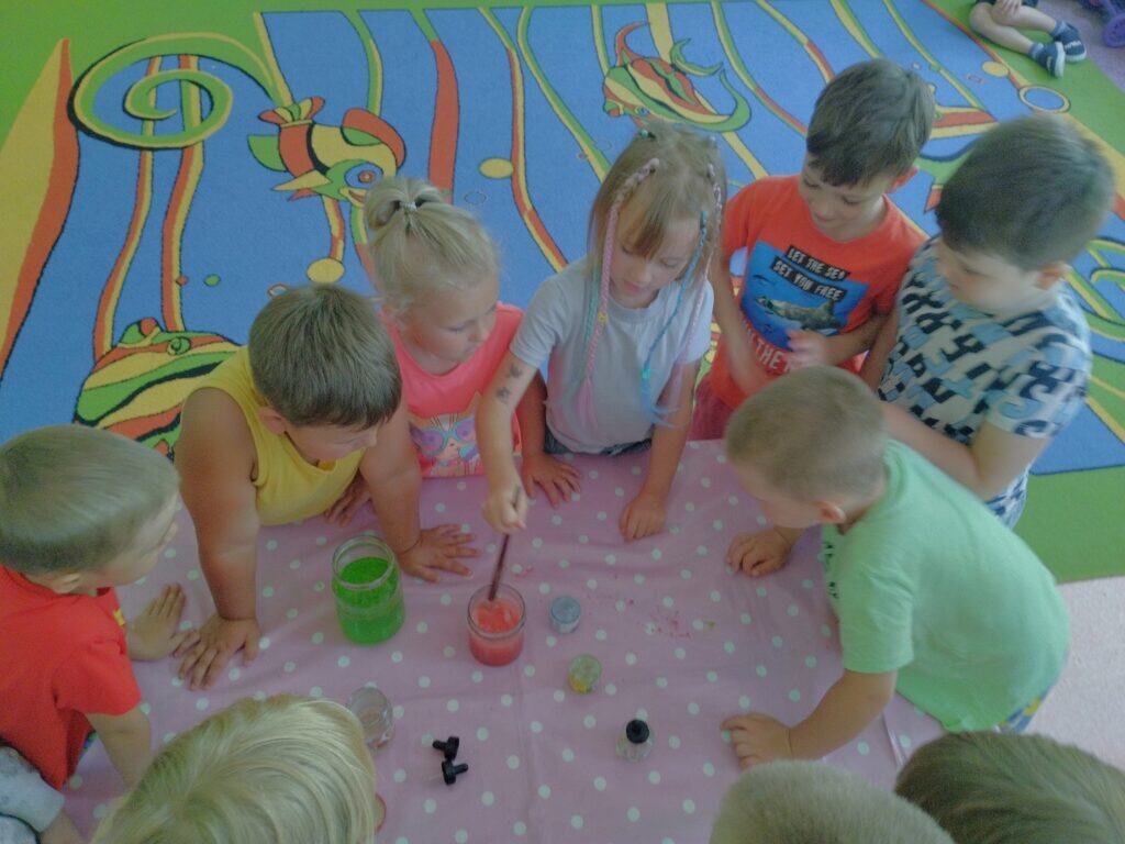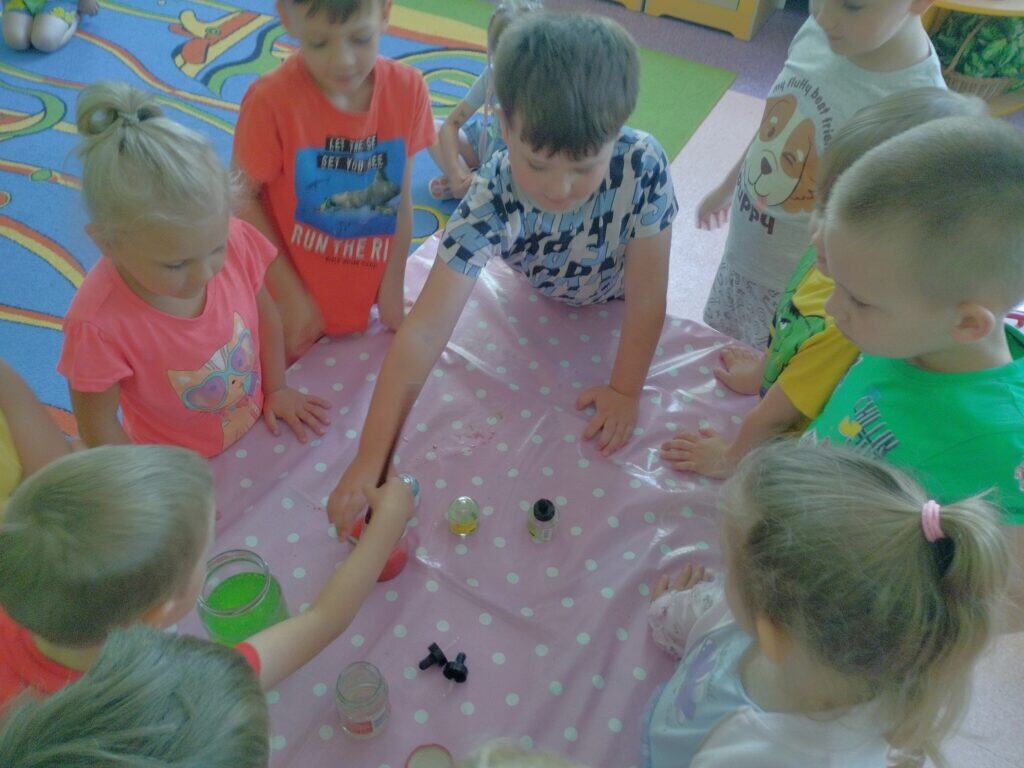 Trochę też poeksperymentowaliśmy. Do słoiczków wlaliśmy wodę, olej i dodaliśmy farby – w jednym słoiku była farba typu gwasz, a w drugim ecolina. Do każdego dodaliśmy także musującą witaminę, która zaczęła tworzyć bąbelki. Dzieci z zaciekawieniem mieszały składniki, obserwując i porównując, jak substancje się rozwarstwiają. Podejmowaliśmy próby wnioskowania i teraz wszystkie Motylki wiedzą, że woda nie łączy się z olejem – niezależnie od tego, jak długo będziemy mieszać – i że olej zawsze wypływa na powierzchnię.