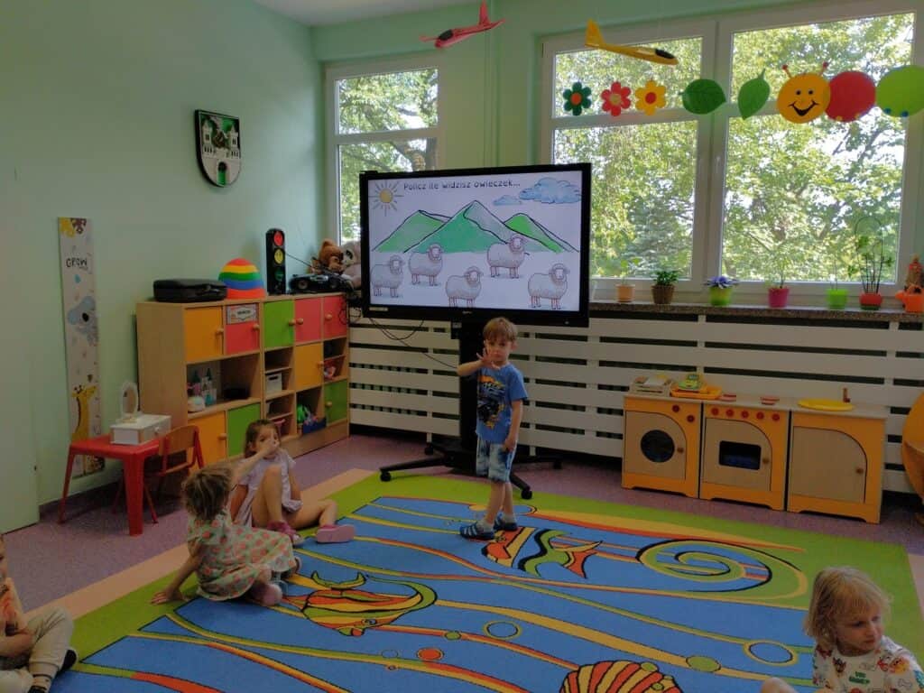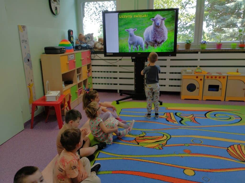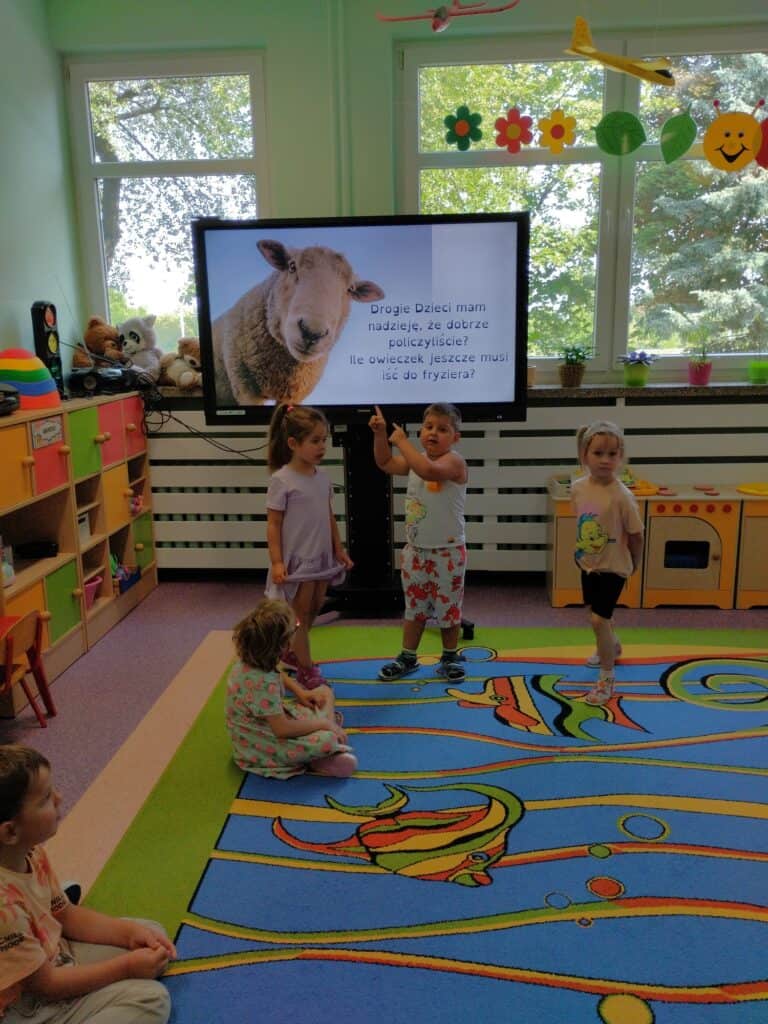 Podczas zajęć rozmawialiśmy także o owieczkach – liczyliśmy je, poznaliśmy powody, dla których odwiedzają „fryzjera”, czyli są strzyżone i dowiedzieliśmy się, czym jest wełna oraz w jakich ubraniach można ją znaleźć.