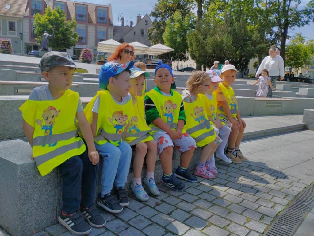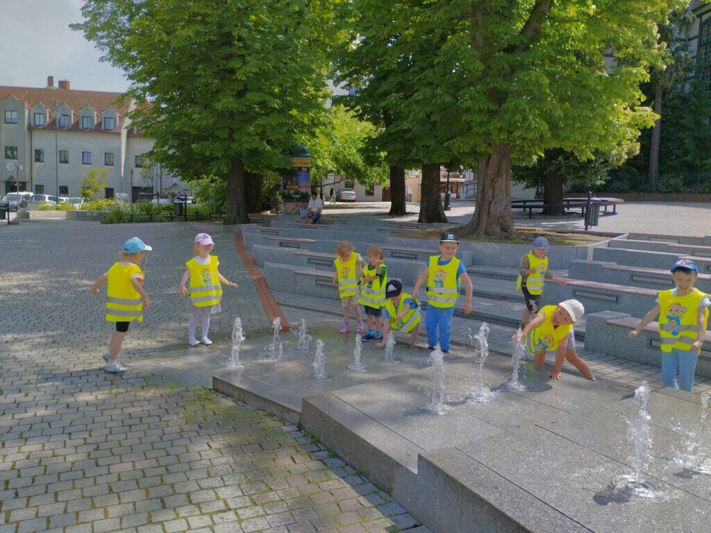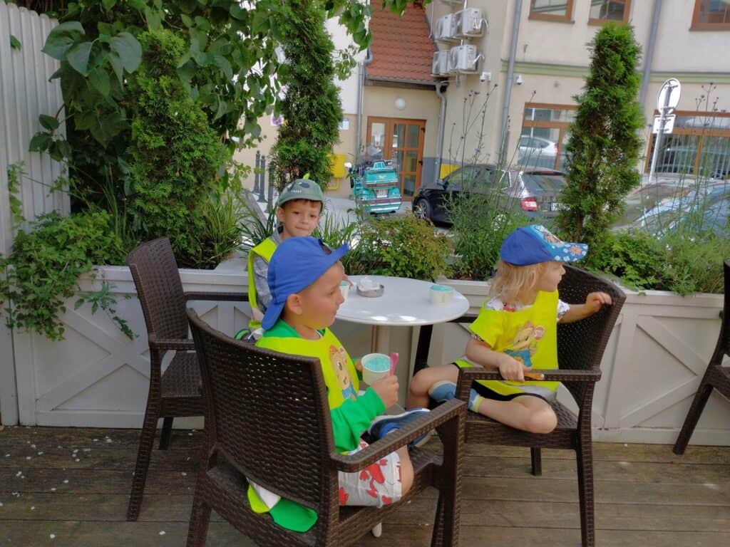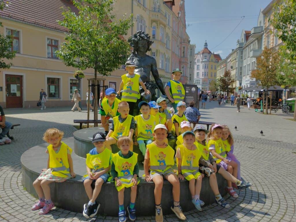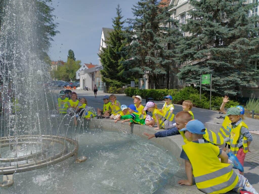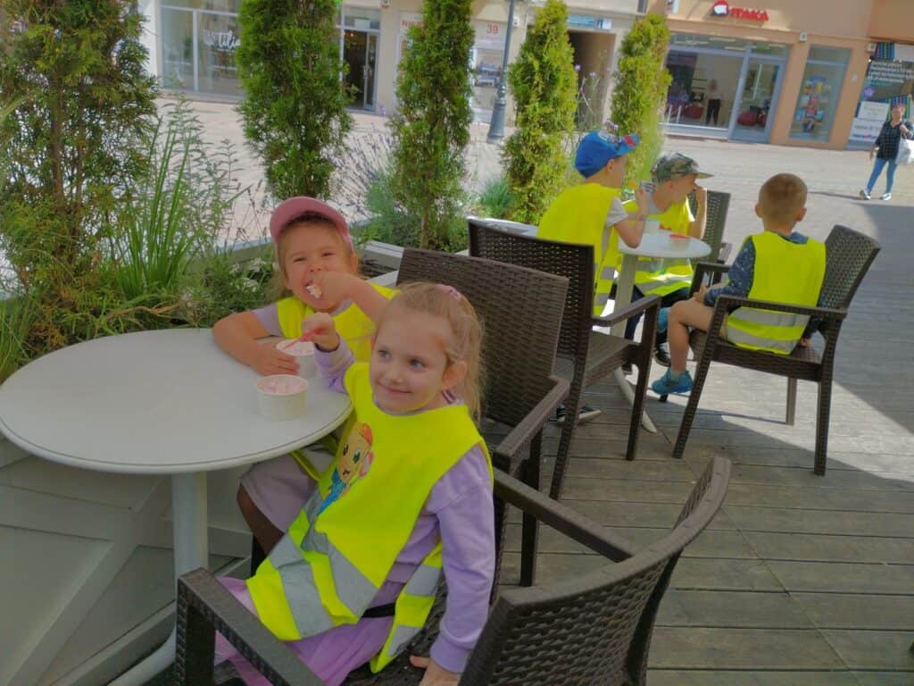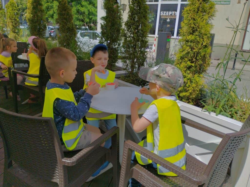 Jednym z najsłodszych wydarzeń w naszej grupie było wyjście na lody. Dzieci samodzielnie wybierały swoje ulubione smaki i mówiły pani przy ladzie, co chcą zamówić, używając zwrotów grzecznościowych. Każdy, zadowolony ze swojego wyboru, siadał przy stoliku i zajadał się lodem.W drodze powrotnej zrobiliśmy sobie pamiątkowe zdjęcie z Bachusem, a następnie wspólnie wypatrywaliśmy małych bachusików — figurek charakterystycznych dla Zielonej Góry. Motylki dobrze wiedziały, że są one symbolem naszego miasta. Mijaliśmy fontannę oraz Filharmonię Zielonogórską. Niektóre dzieci opowiadały, że w czasie wakacji chodzą tam z rodzicami na koncerty plenerowe. To sprawiło, że wszystkim przypomniały się wakacje. Bo przecież gdy świeci słońce i jest ciepło, wakacje są tuż-tuż…
