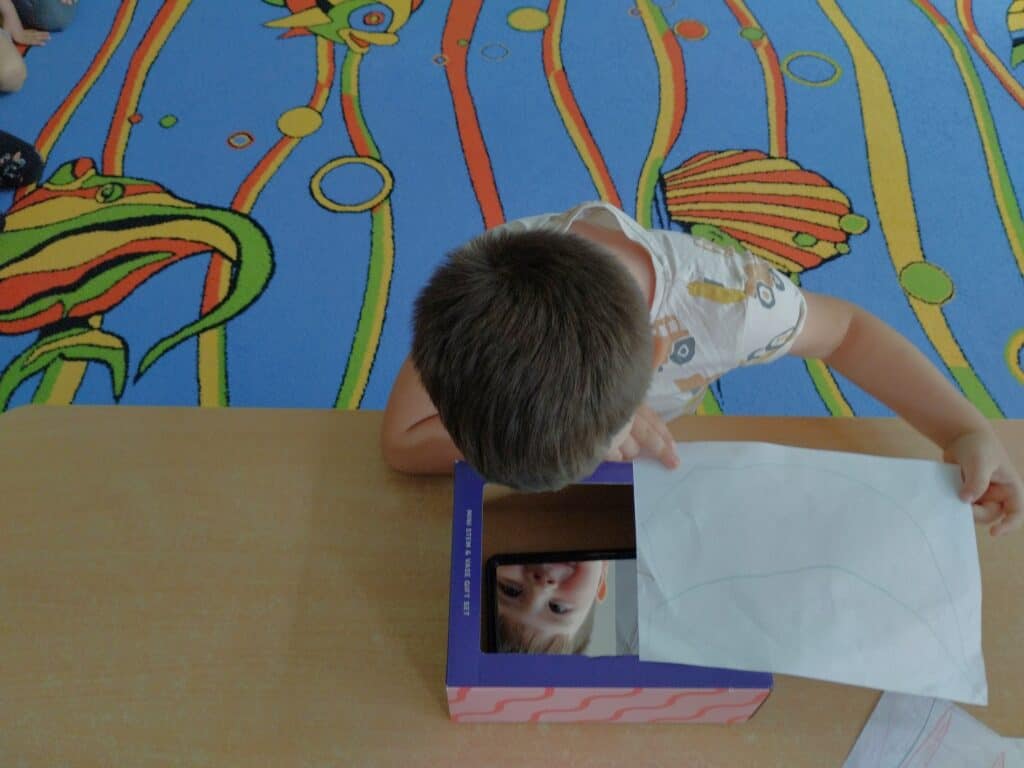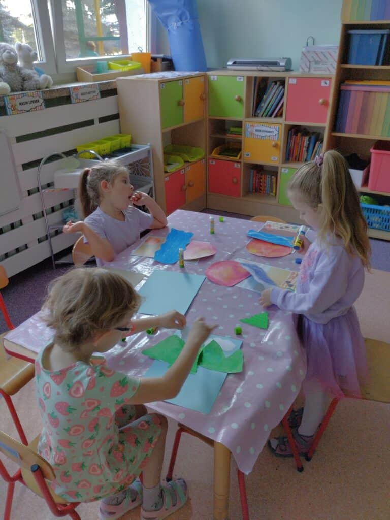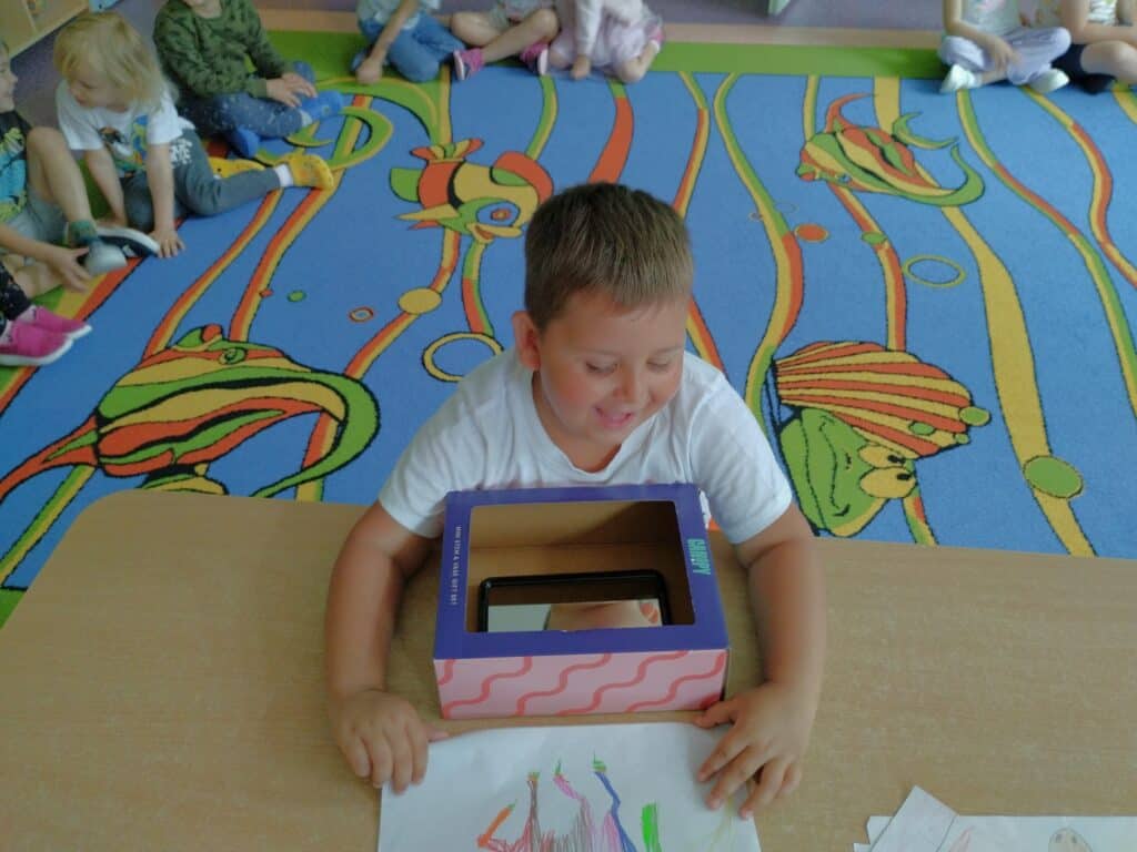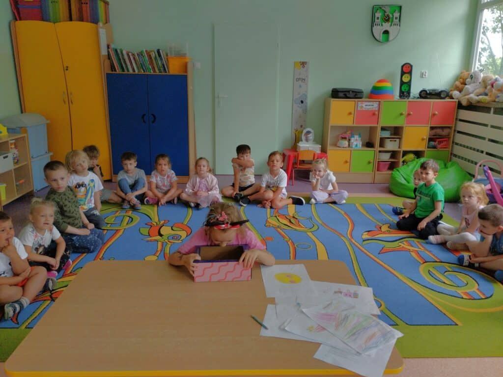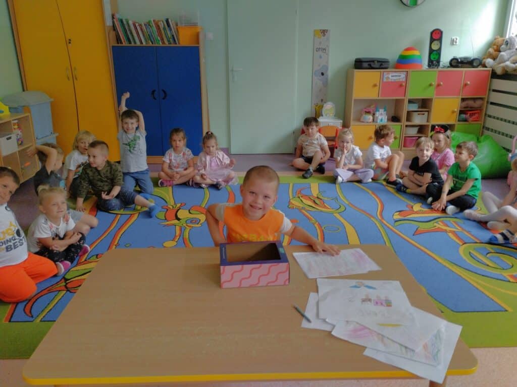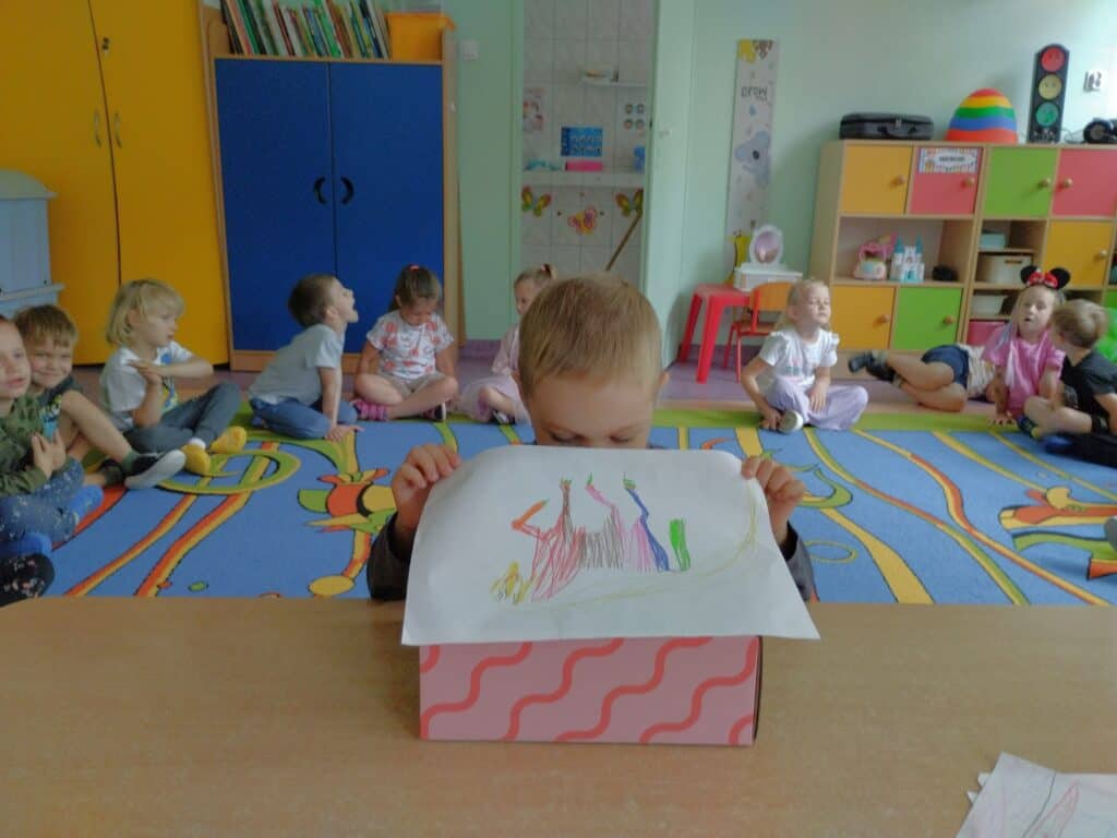Motylki obejrzały film edukacyjny o dzieciach z różnych krajów i kontynentów. Choć różniły się wyglądem, językiem czy zwyczajami – łączyło je jedno: każde z nich było wyjątkowe. Rozmawialiśmy o tym, że każdy z nas ma inne umiejętności, że nie trzeba od razu umieć wszystkiego, by być ważnym i wartościowym. Czasem trzeba poćwiczyć kilka razy, zanim zacznie nam wychodzić. Motylki czasem proszą, żeby im coś narysować bo one nie potrafią albo nie będą ćwiczyć, bo nie umieją. Zajęcia były okazją by uświadomić dzieciom, że każdy z nas ma inne predyspozycje i możliwości, ale każdy zasługuje na to, aby wierzyć w siebie. W sali pojawiło się „magiczne pudełko”. Każde dziecko mogło do niego zajrzeć, by zobaczyć najbardziej wyjątkową osobę na świecie. Dzieci były bardzo ciekawe – nie spodziewały się, że zobaczą siebie. W pudełku było lusterko. Ich reakcje były bezcenne – zaskoczenie, nieśmiałe uśmiechy, wzruszenie.